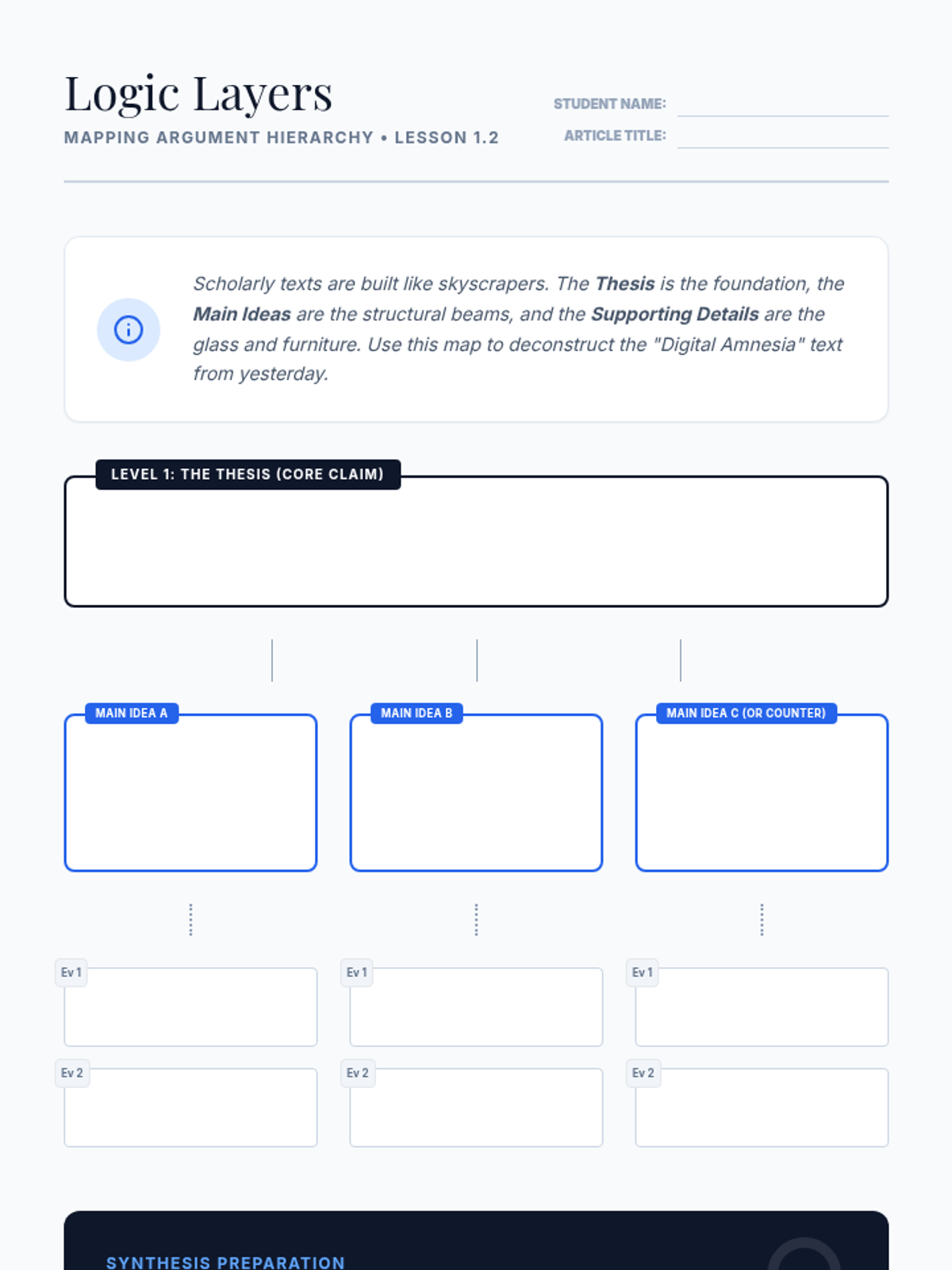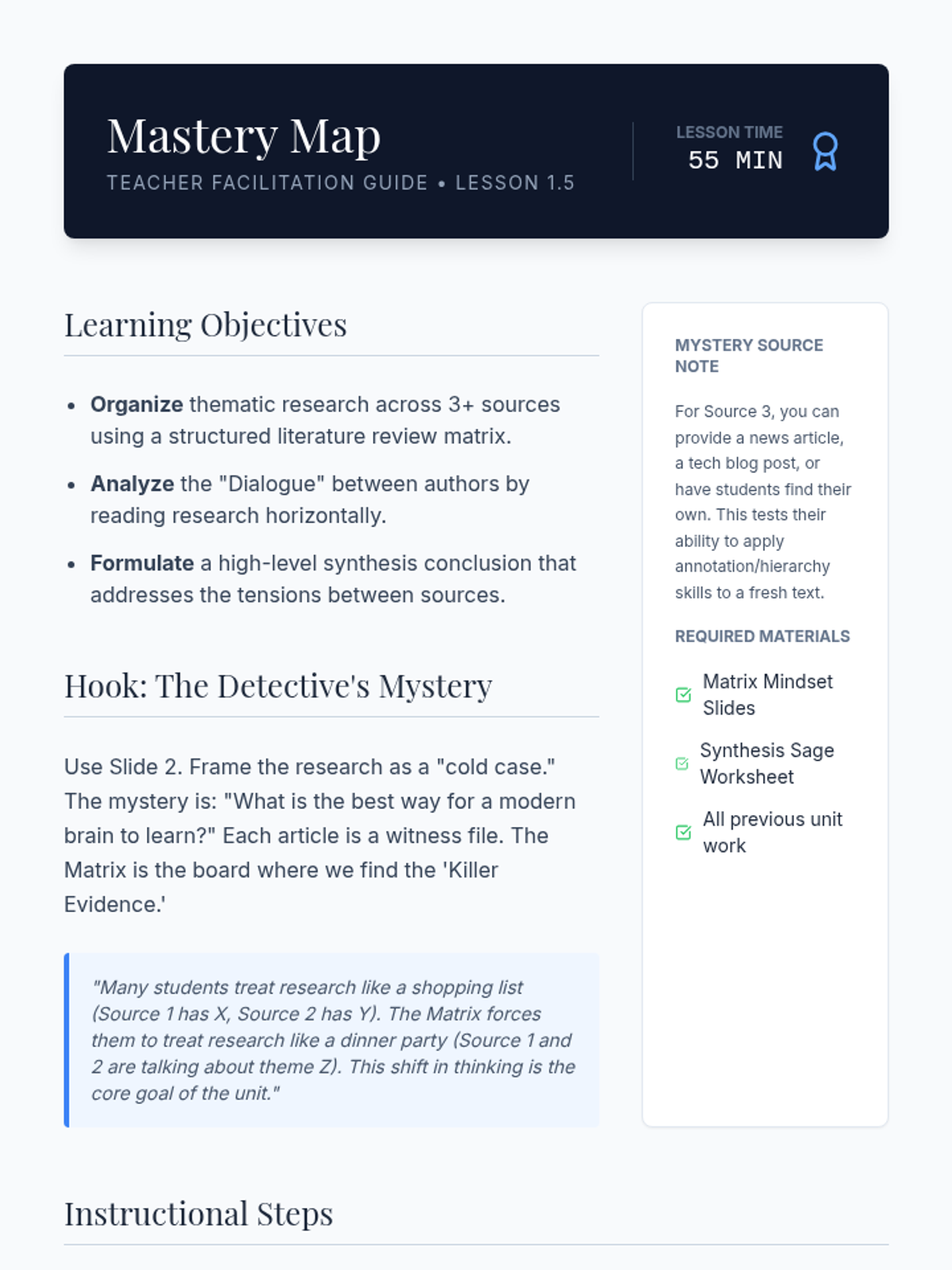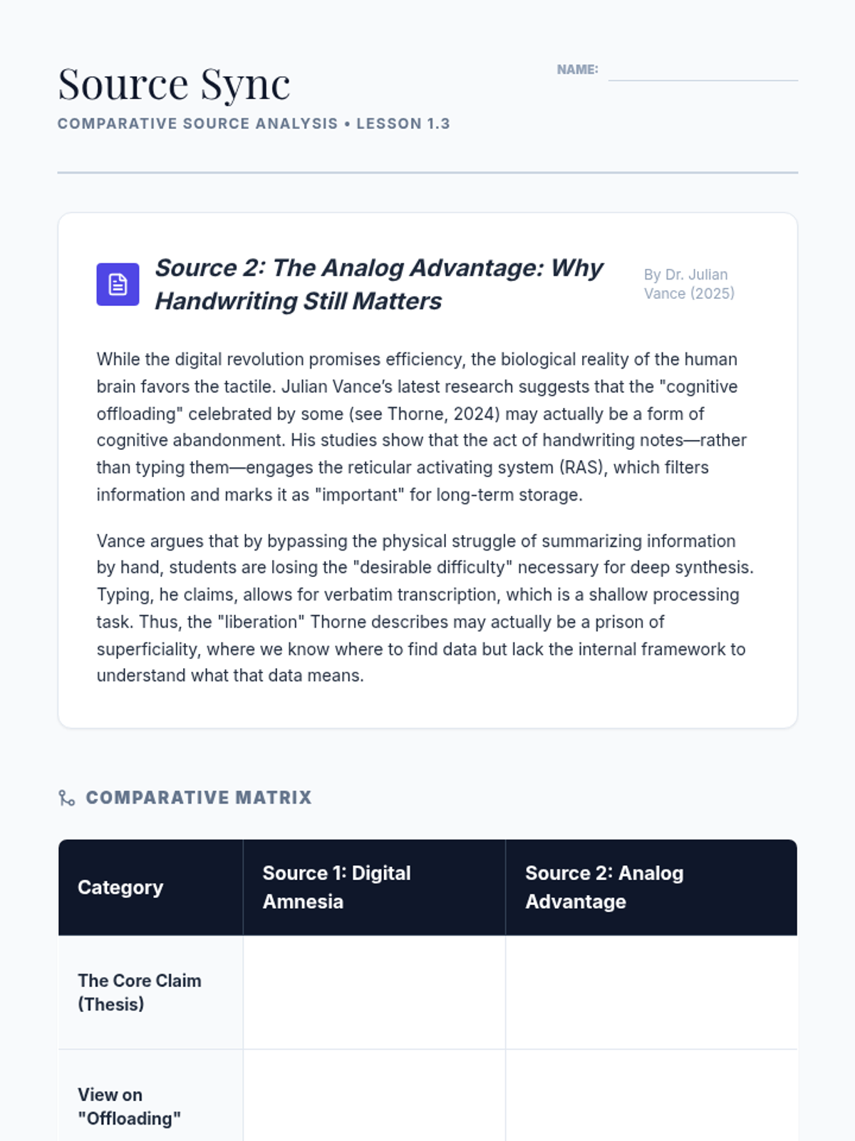 A comprehensive unit for 11th-grade students on critical reading, hierarchical analysis, and information synthesis from academic texts. Students move from annotating individual sources to constructing a professional literature review matrix.