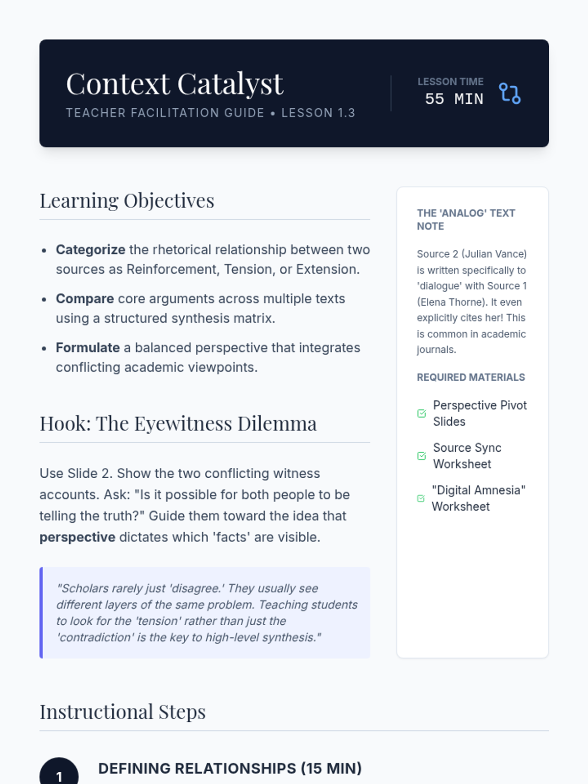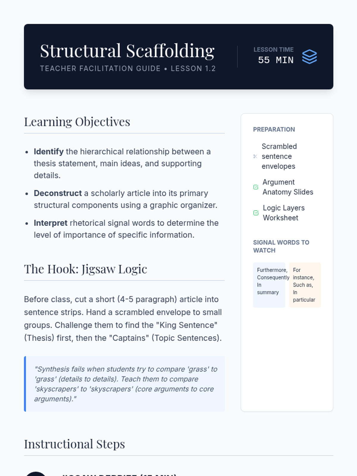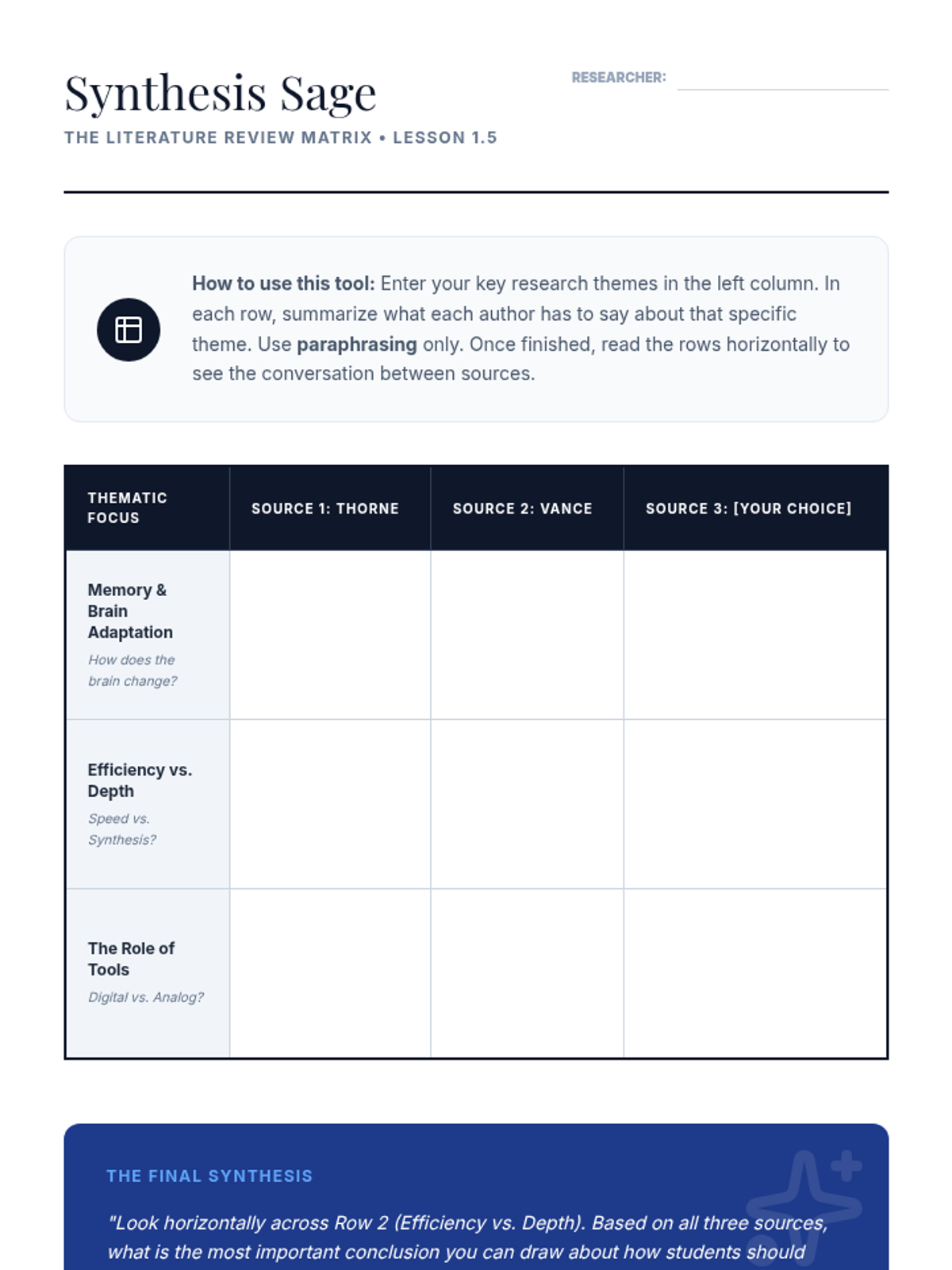 A comprehensive unit for 11th-grade students on critical reading, hierarchical analysis, and information synthesis from academic texts. Students move from annotating individual sources to constructing a professional literature review matrix.