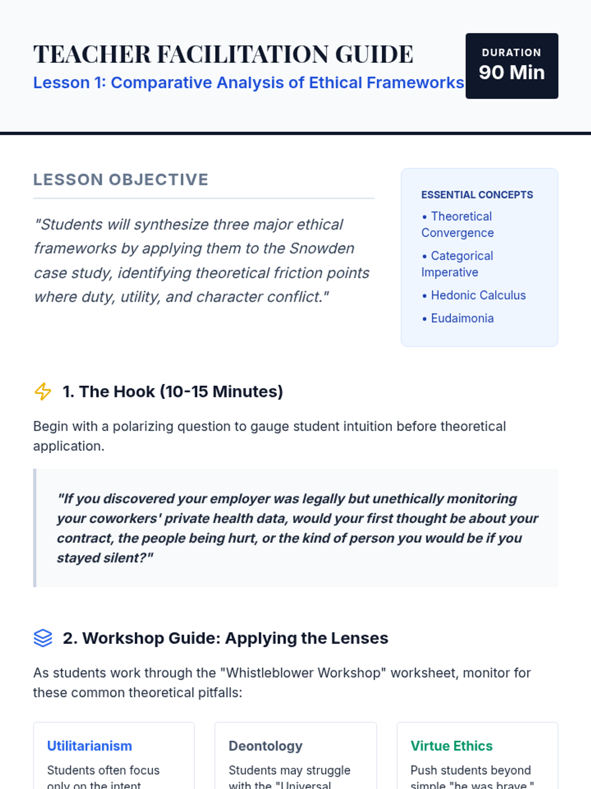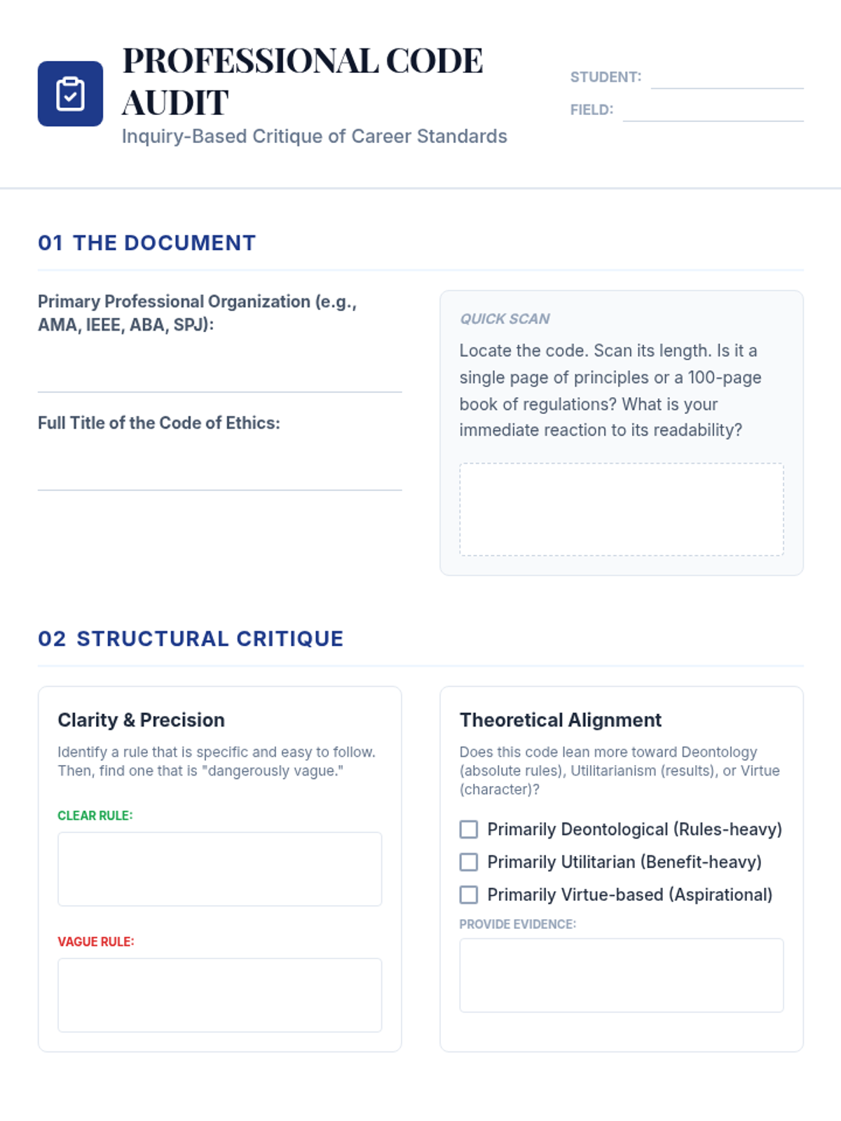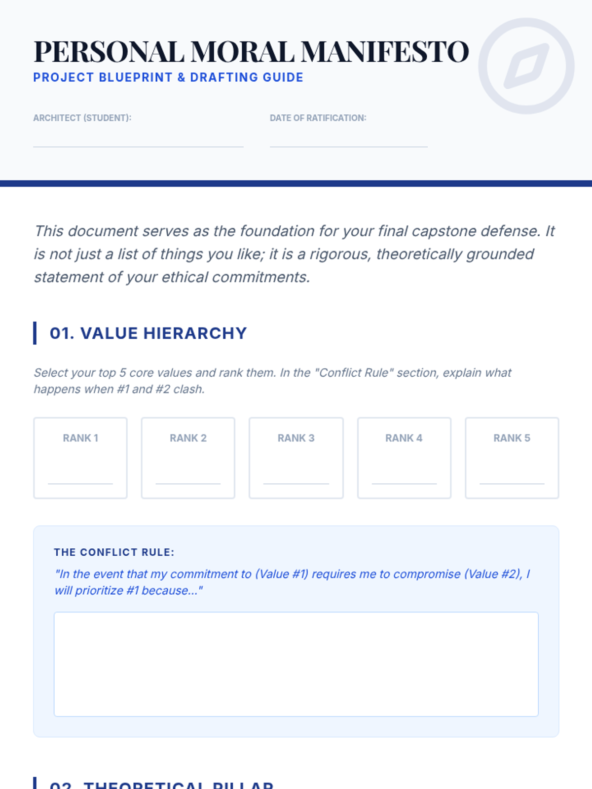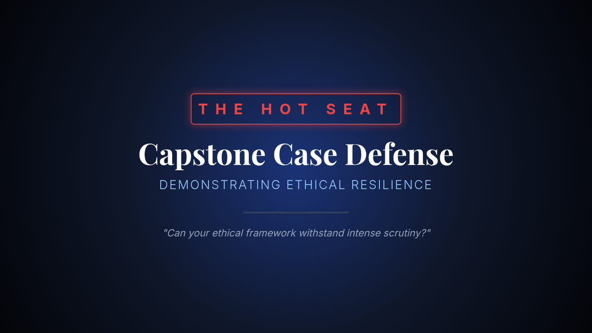 A capstone sequence for undergraduate students to synthesize ethical theories into a personal and professional framework. Students analyze professional codes, develop a moral manifesto, and practice defending ethical decisions under pressure.
