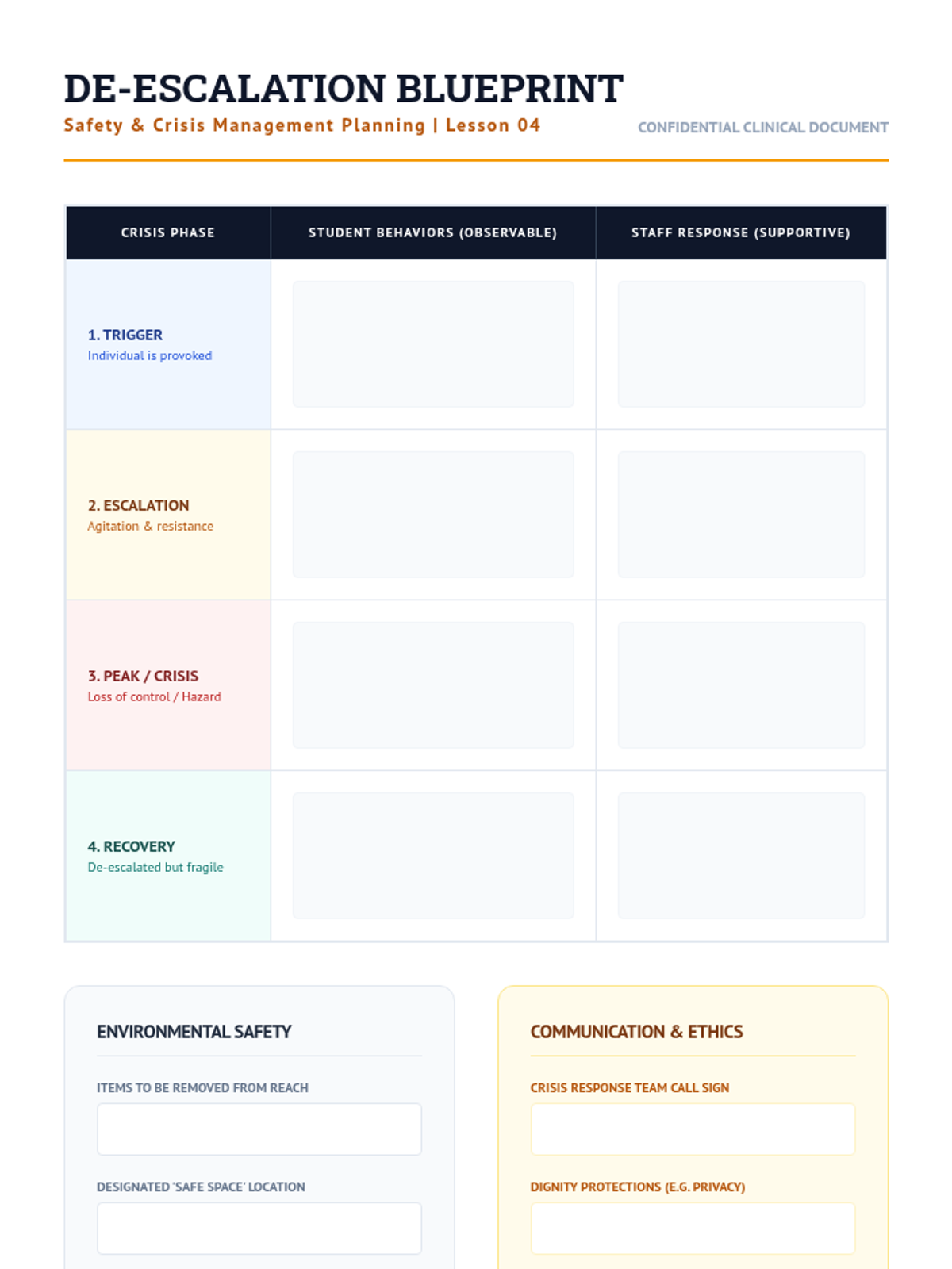 A comprehensive toolkit designed for a 6th-grade student to navigate emotional dysregulation. This sequence focuses on identifying internal triggers, building a personalized strategy toolkit, and establishing a clear safety protocol for crisis moments, providing stability in both school and home environments.