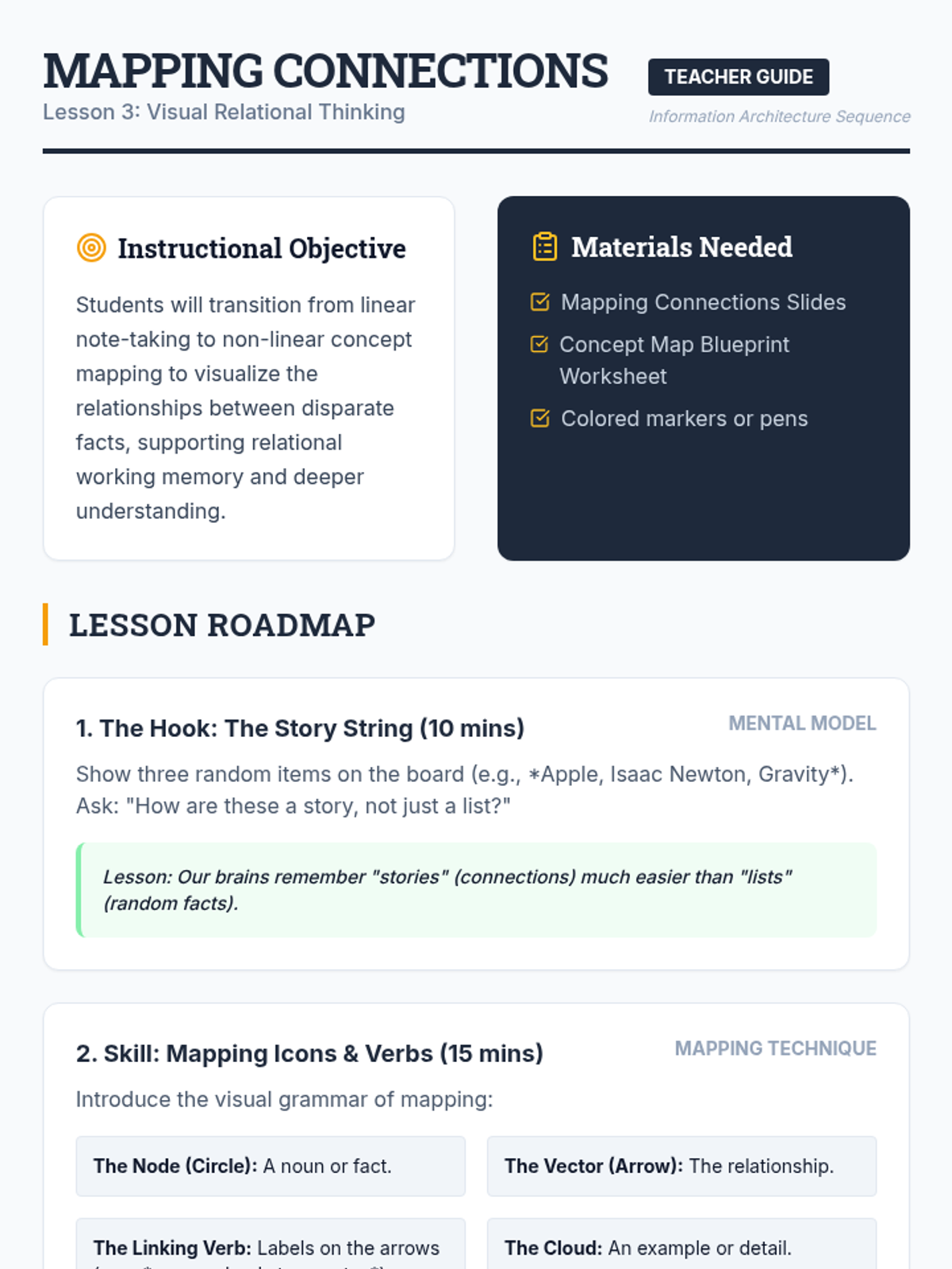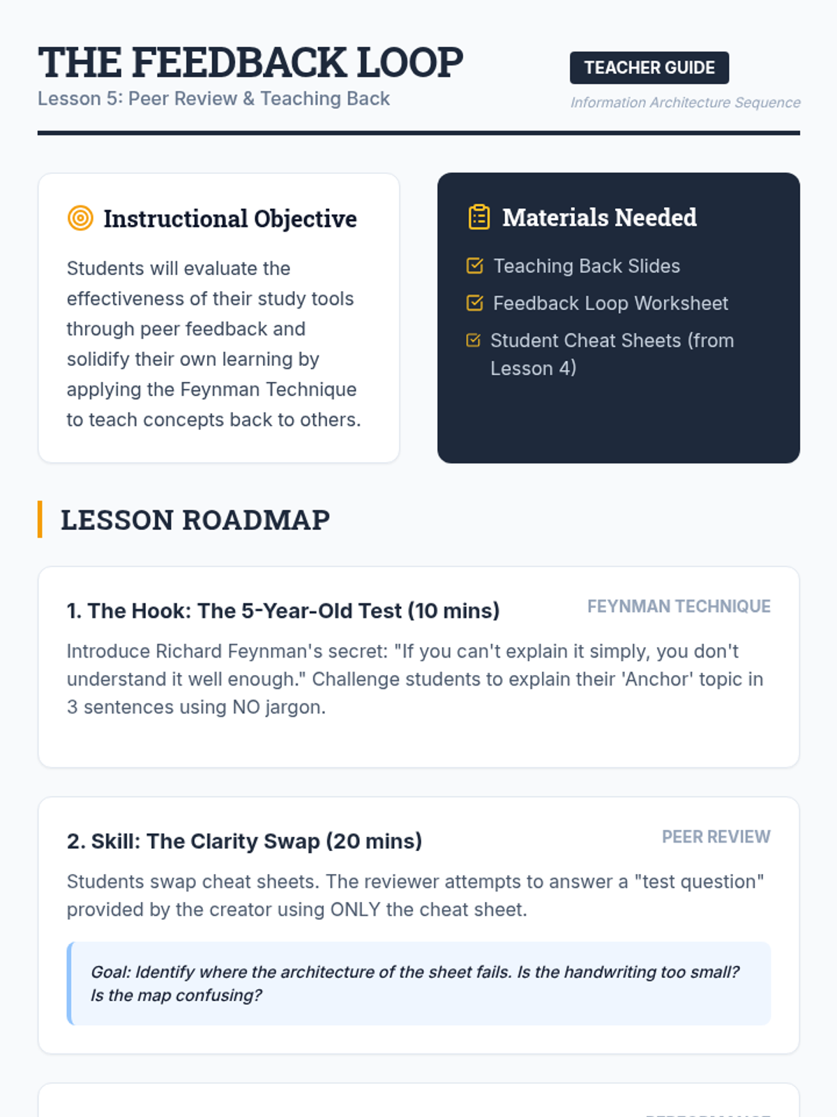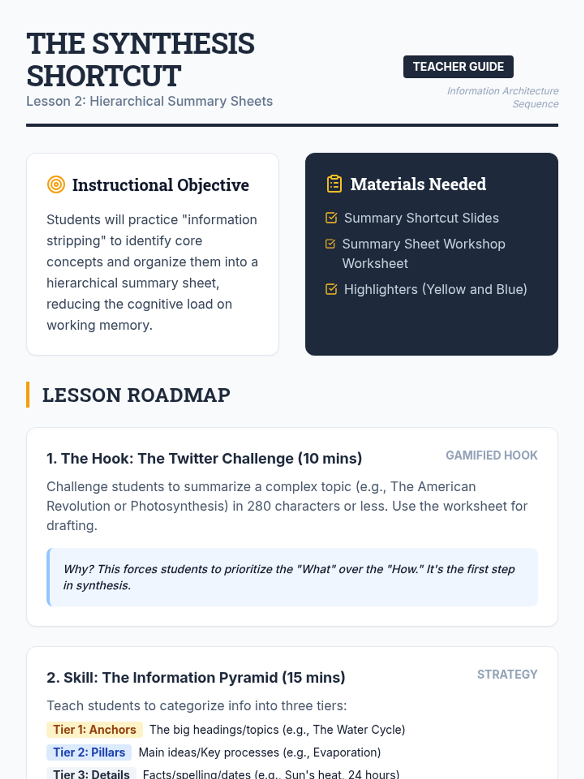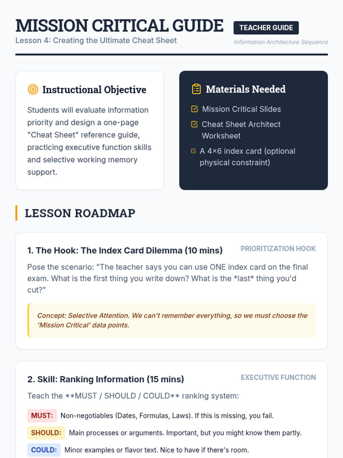 A 5-lesson sequence designed for 9th-grade students focusing on working memory support through note synthesis. Students progress from auditing raw notes to creating visual maps and condensed 'cheat sheets' to enhance retention and understanding.
