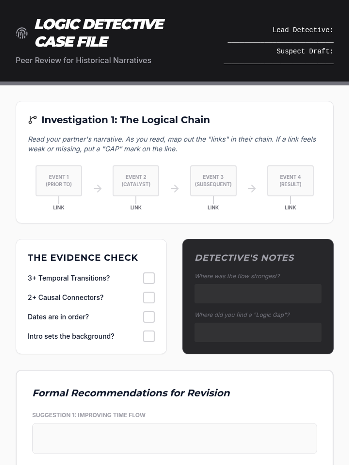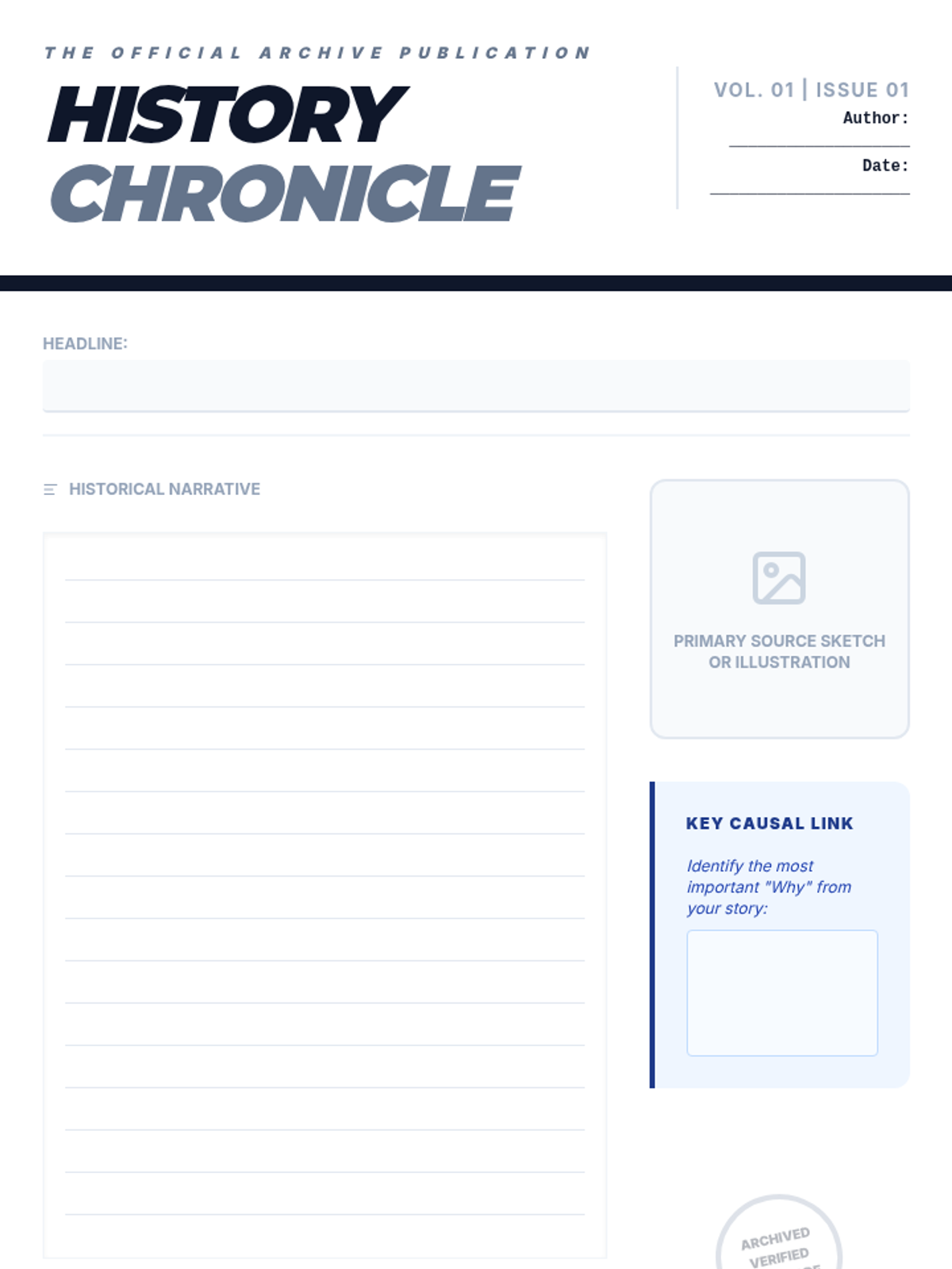 A 5-lesson sequence for 6th Grade students focusing on the intersection of historical chronology and causal writing. Students learn to use transition words, causal syntax, and narrative structure to explain not just when things happened, but why they happened, culminating in a published historical narrative.