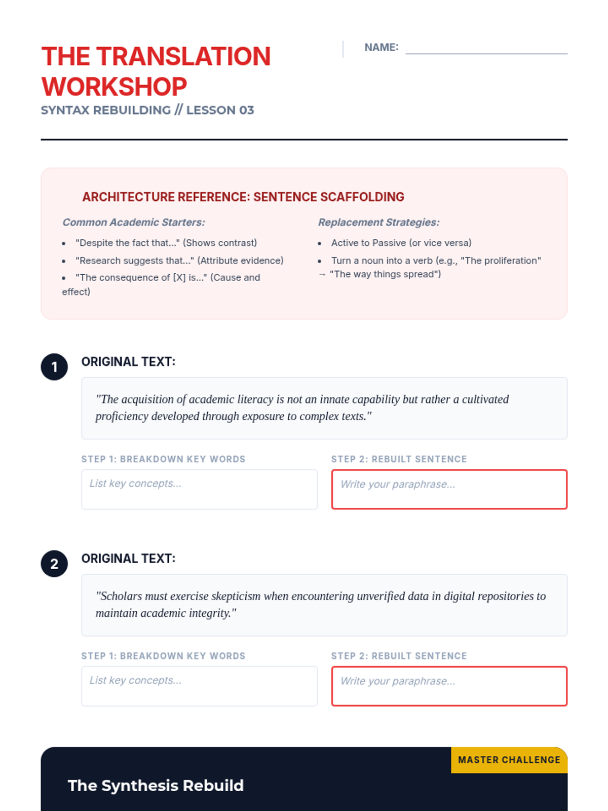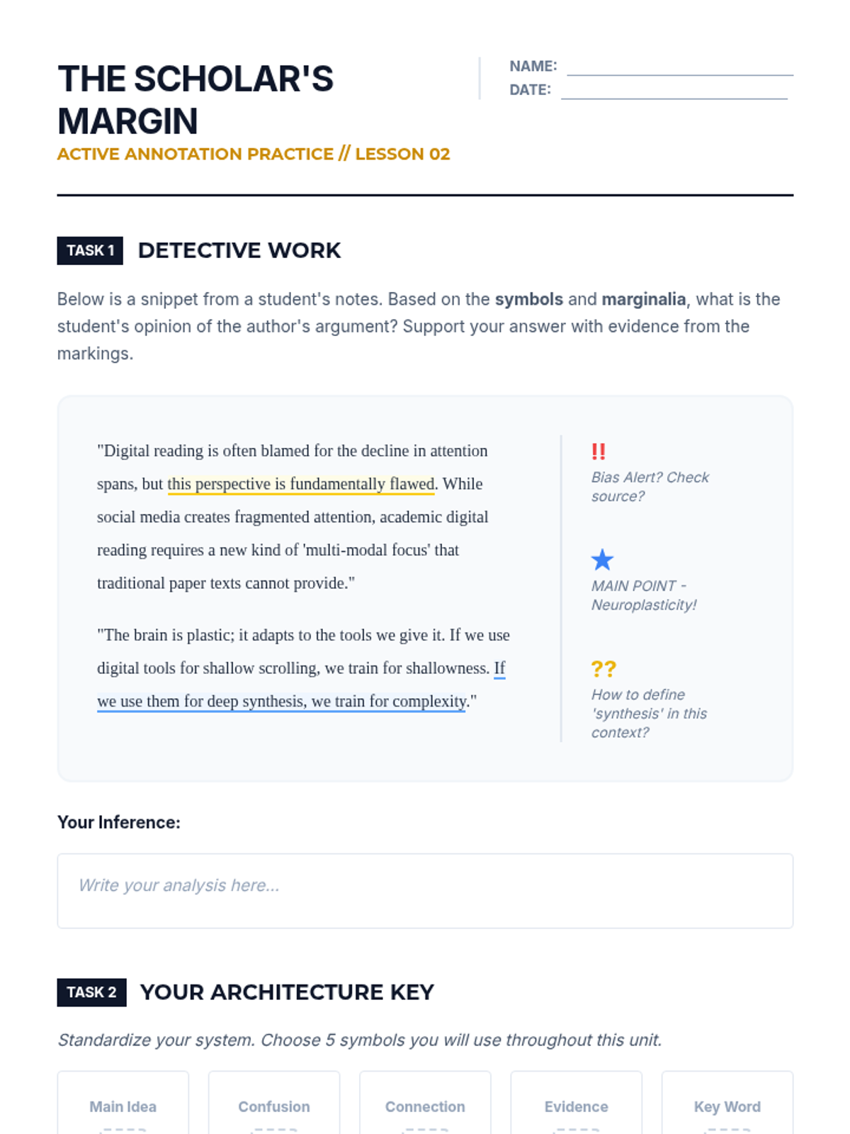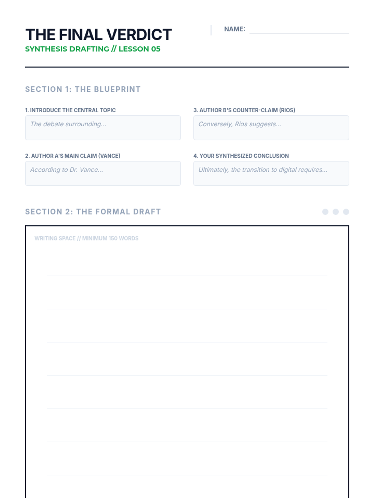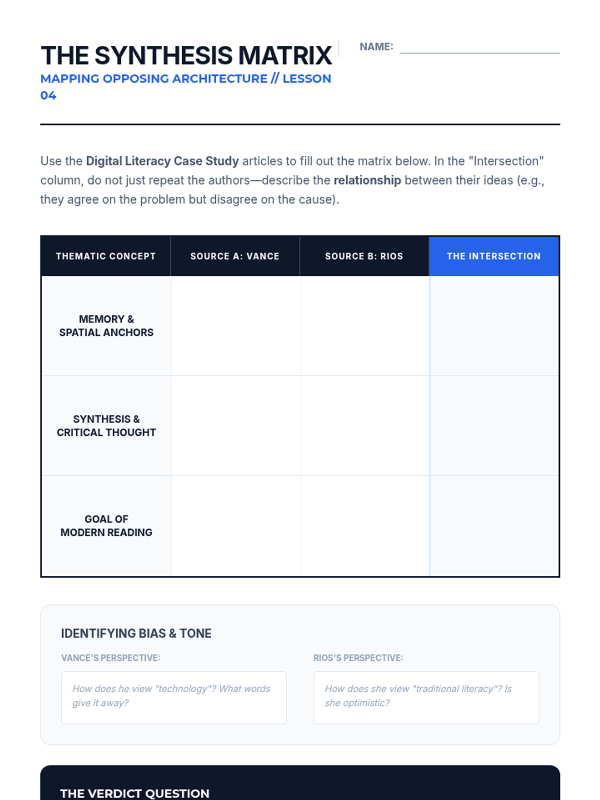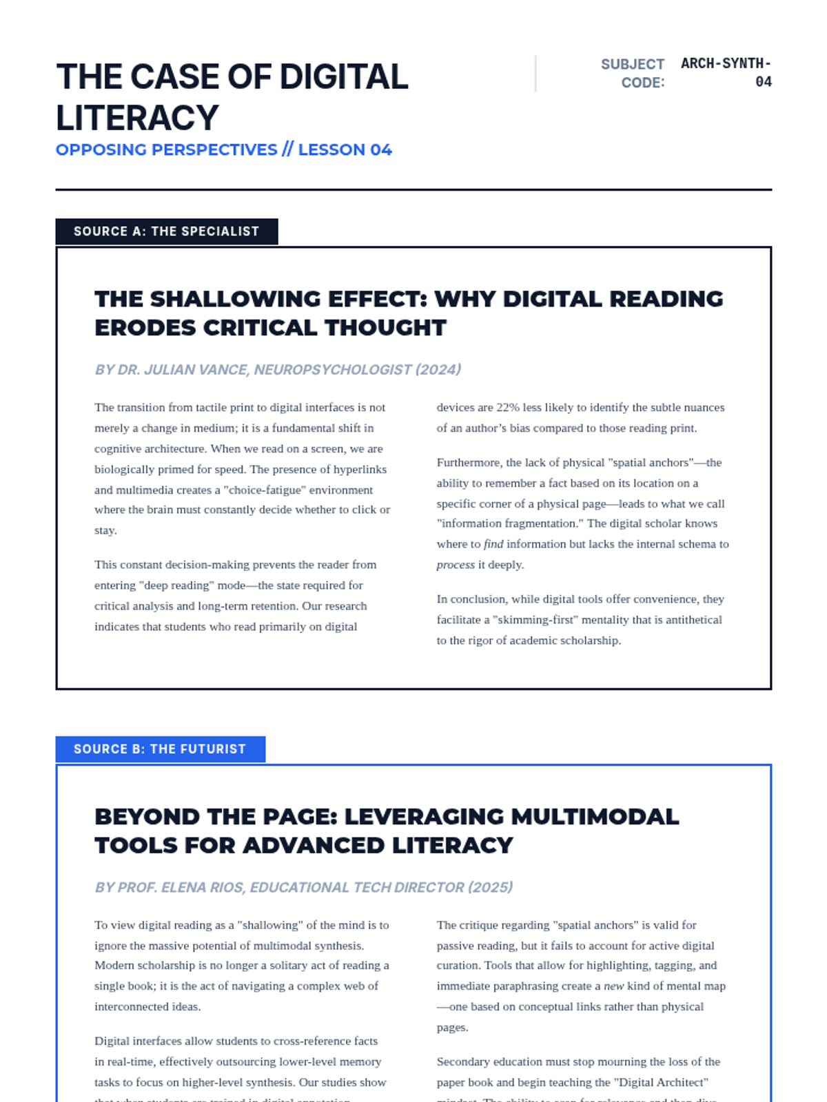 A comprehensive 10th-grade sequence designed to transition students from passive readers to active academic synthesizers. Through a series of five lessons, students master skimming, scanning, critical annotation, paraphrasing, and comparative analysis to produce a formal synthesis of conflicting academic viewpoints.