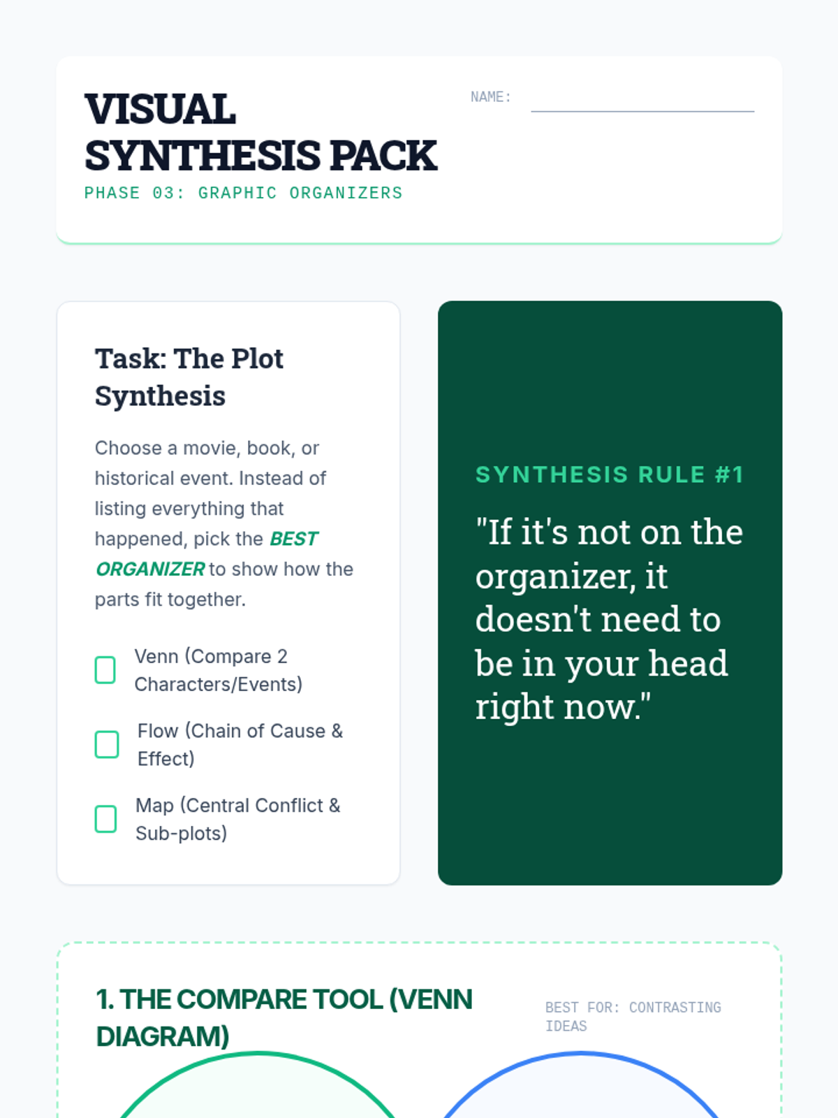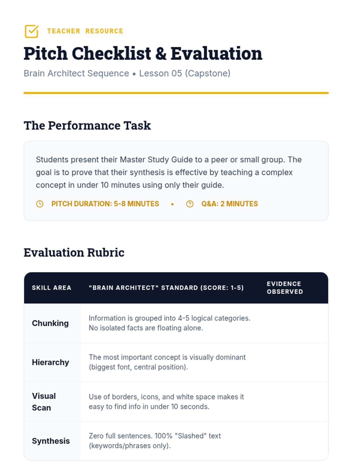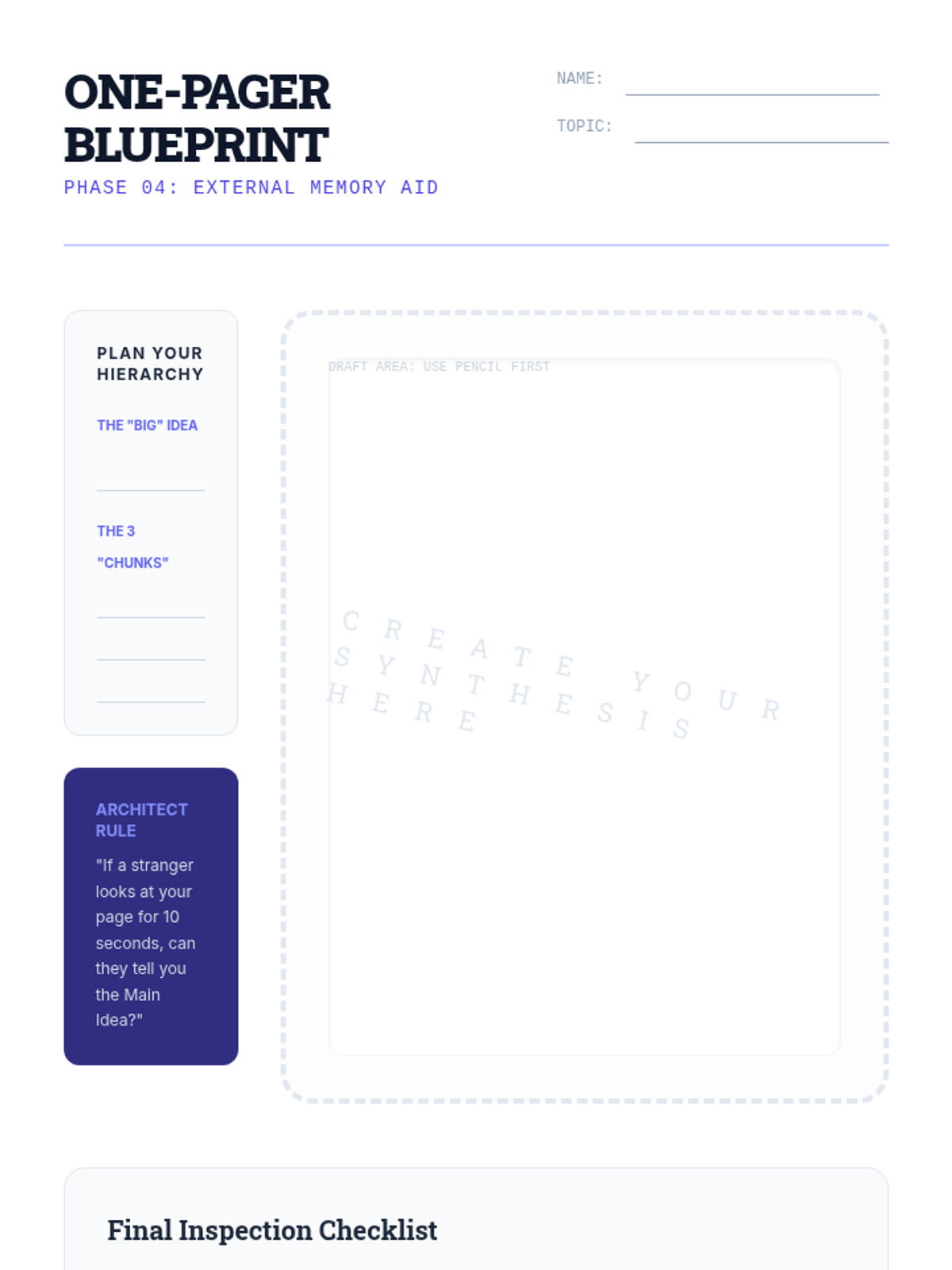 A 5-lesson unit for 10th-grade students focused on reducing cognitive load through information synthesis, chunking, and hierarchical organization. Students develop practical skills to manage working memory by creating external memory aids like one-pagers and master study guides.