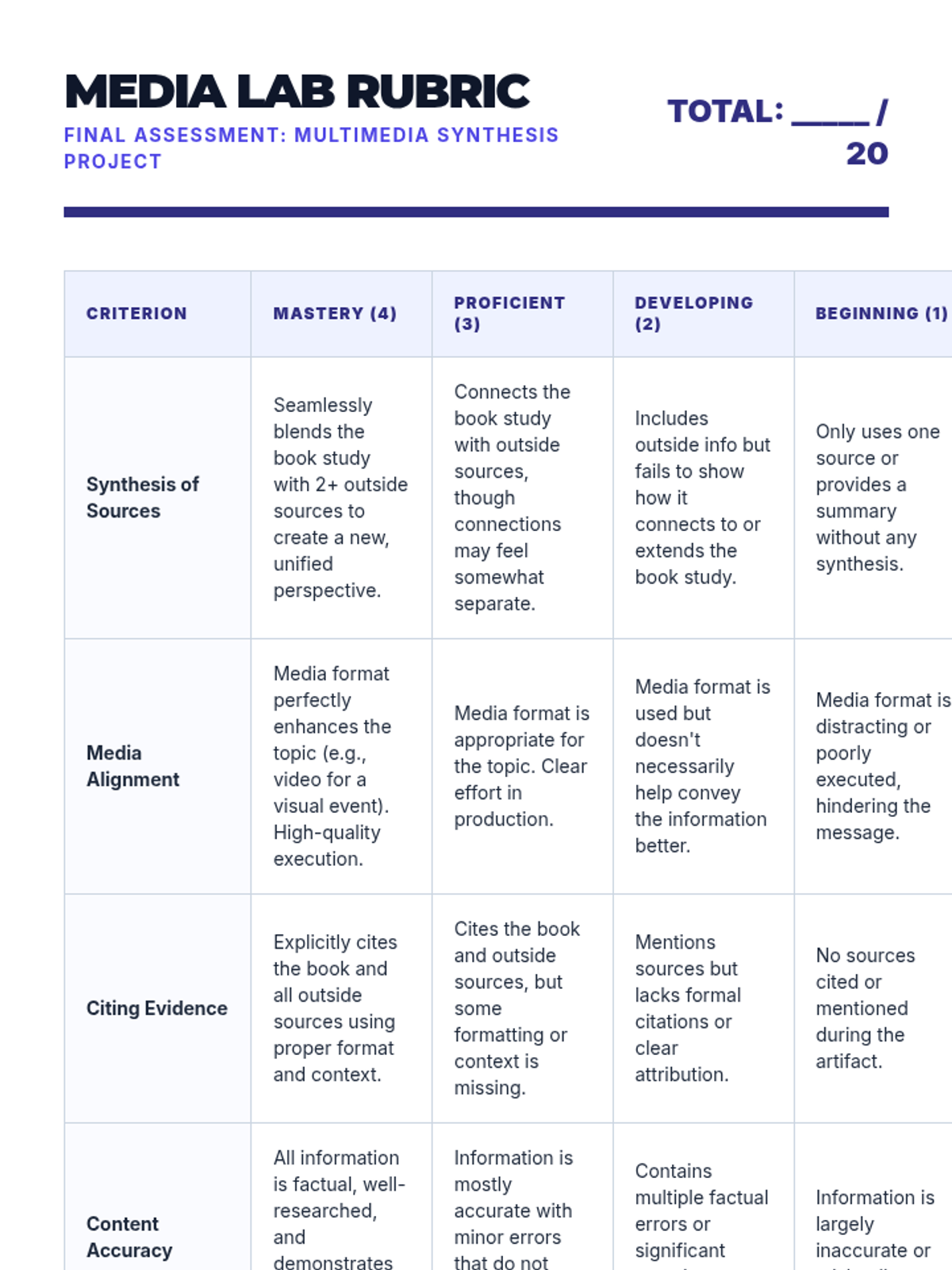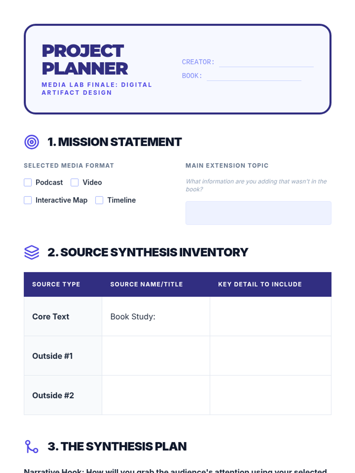 A 7th-grade ELA unit focused on synthesizing information from a nonfiction book with various media formats, including videos, articles, and primary sources, culminating in a multimedia project.