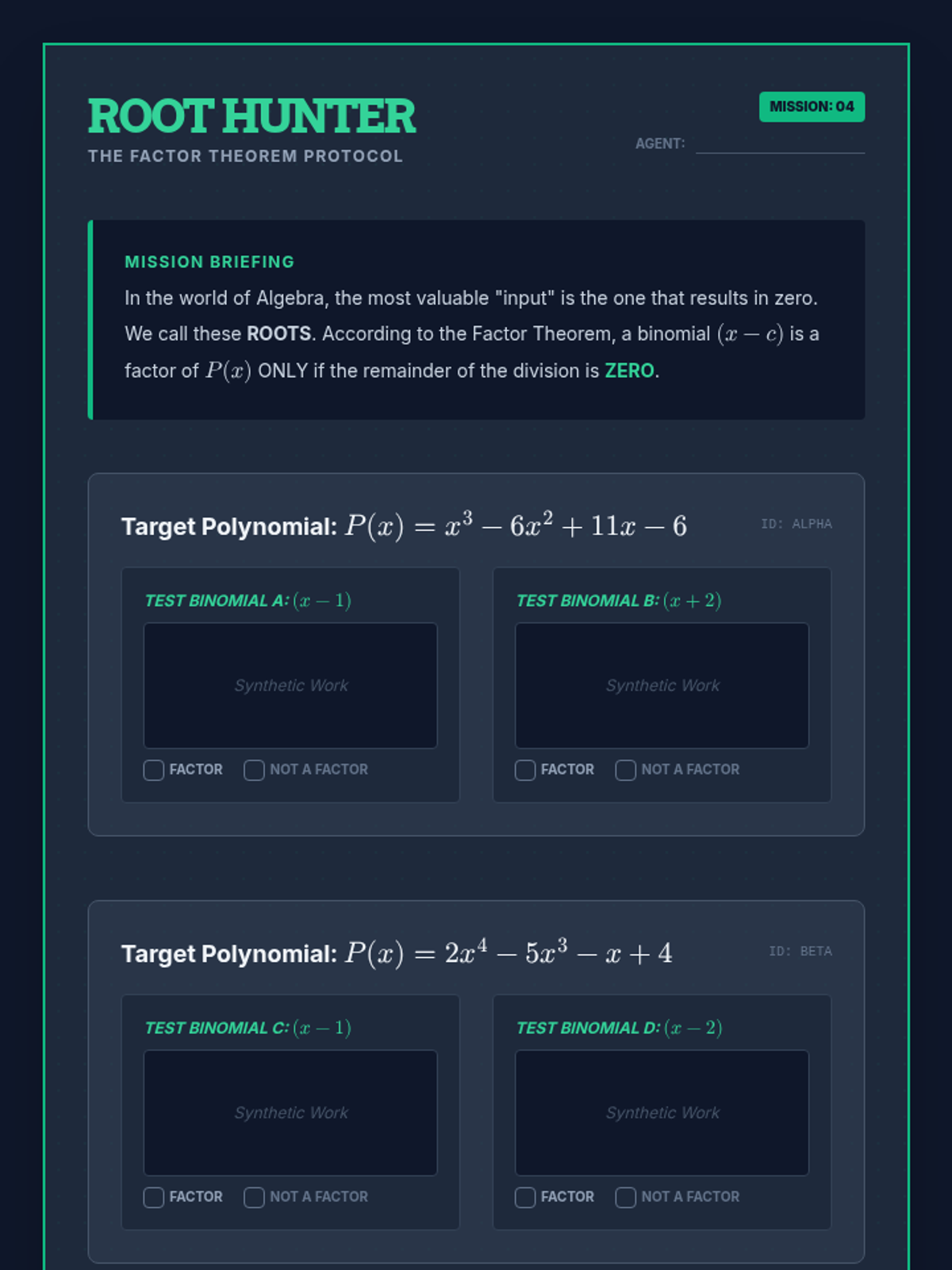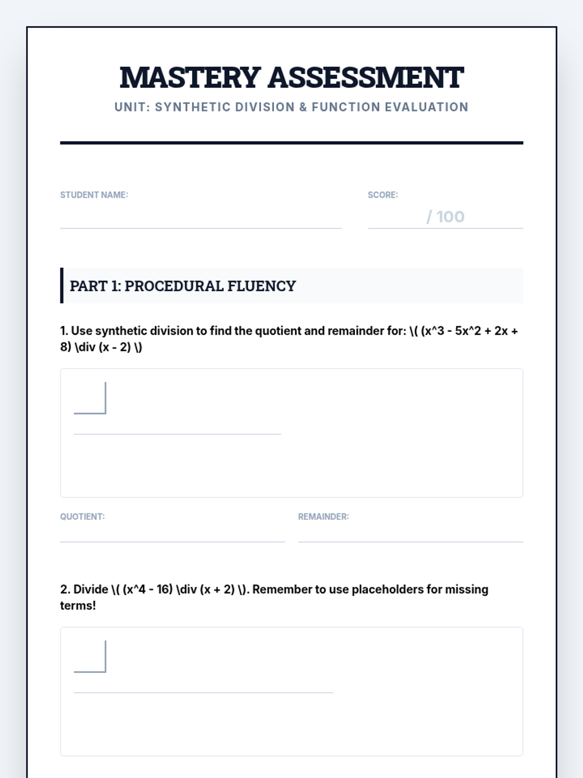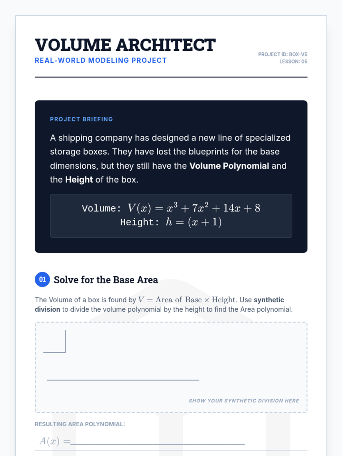 This sequence introduces synthetic division as a streamlined alternative to polynomial long division. Students explore its procedural efficiency, the critical role of placeholders, and how it connects to function evaluation through the Remainder and Factor Theorems, culminating in a real-world volume modeling project.