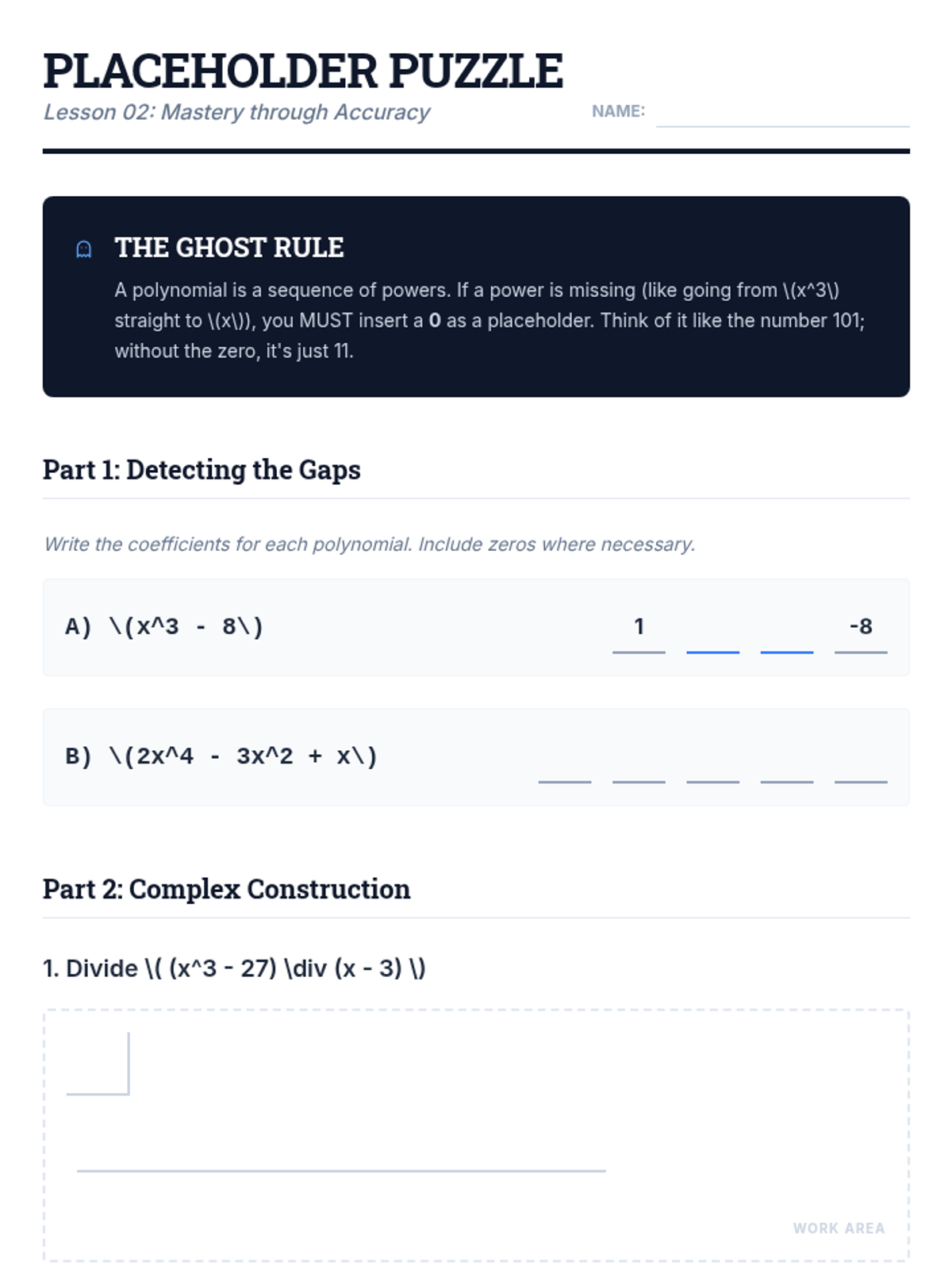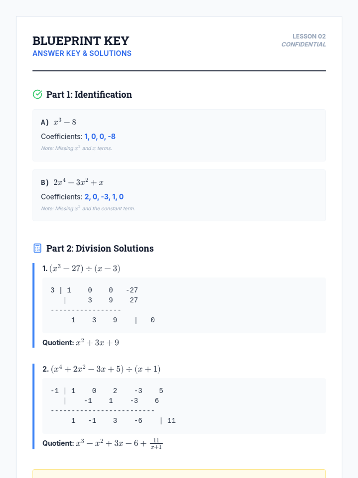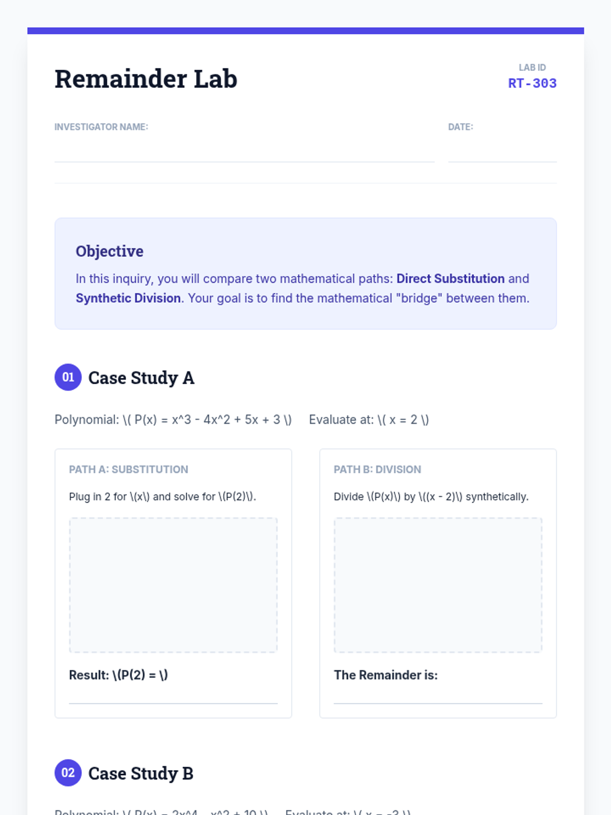 This sequence introduces synthetic division as a streamlined alternative to polynomial long division. Students explore its procedural efficiency, the critical role of placeholders, and how it connects to function evaluation through the Remainder and Factor Theorems, culminating in a real-world volume modeling project.