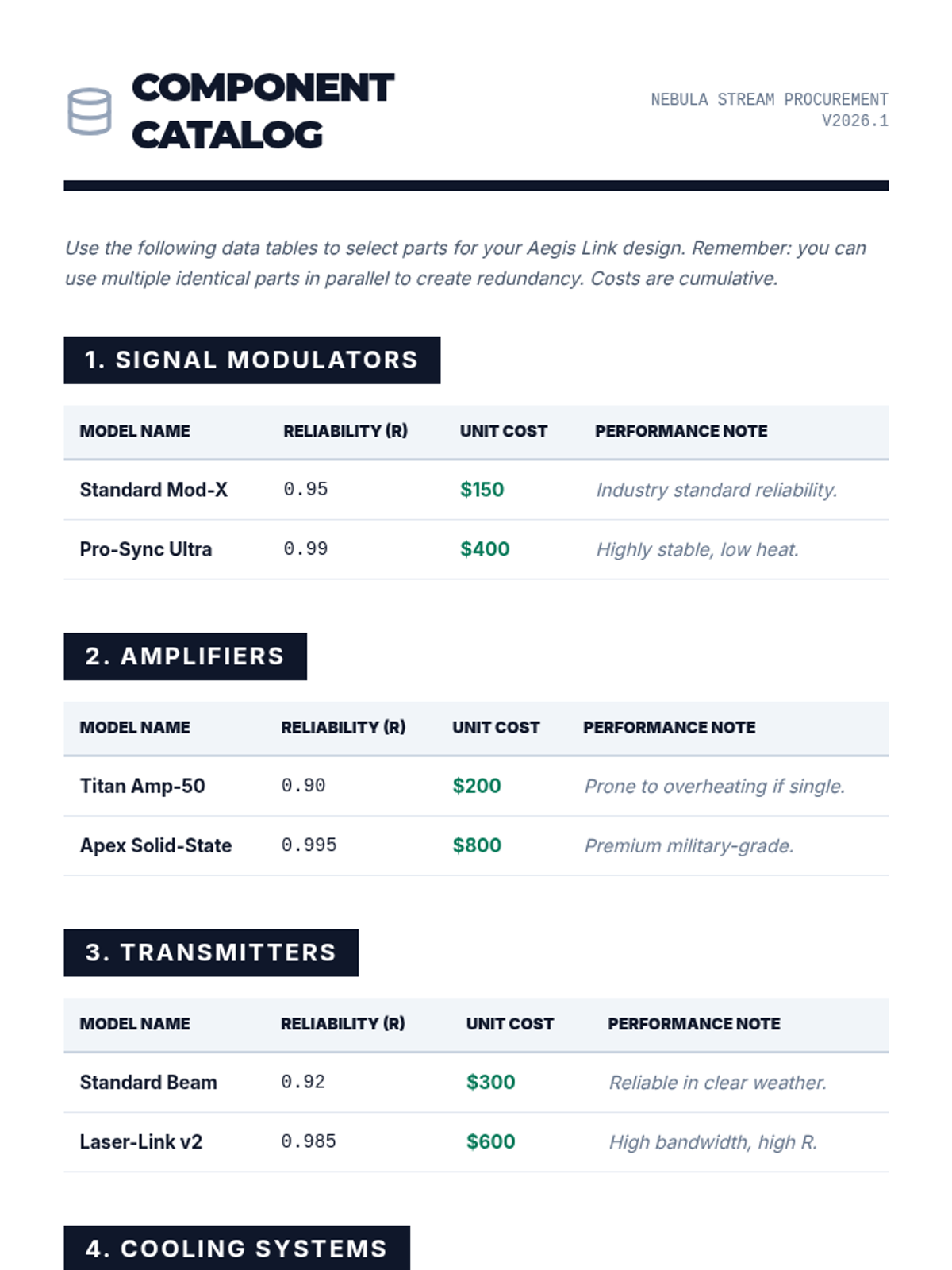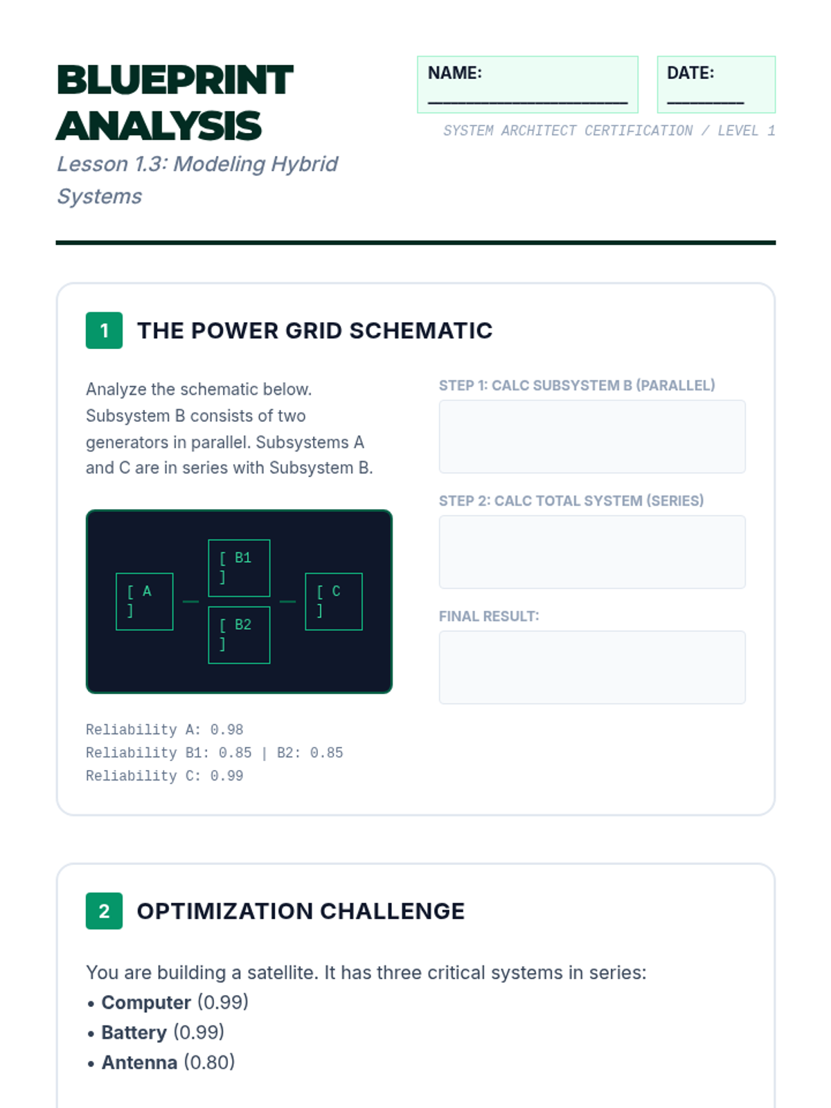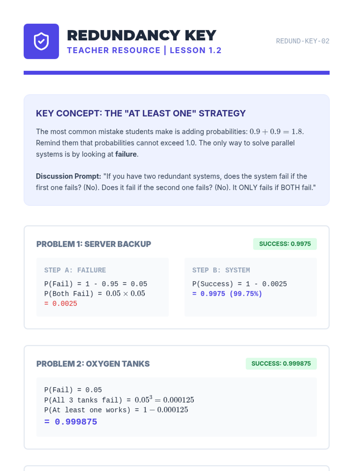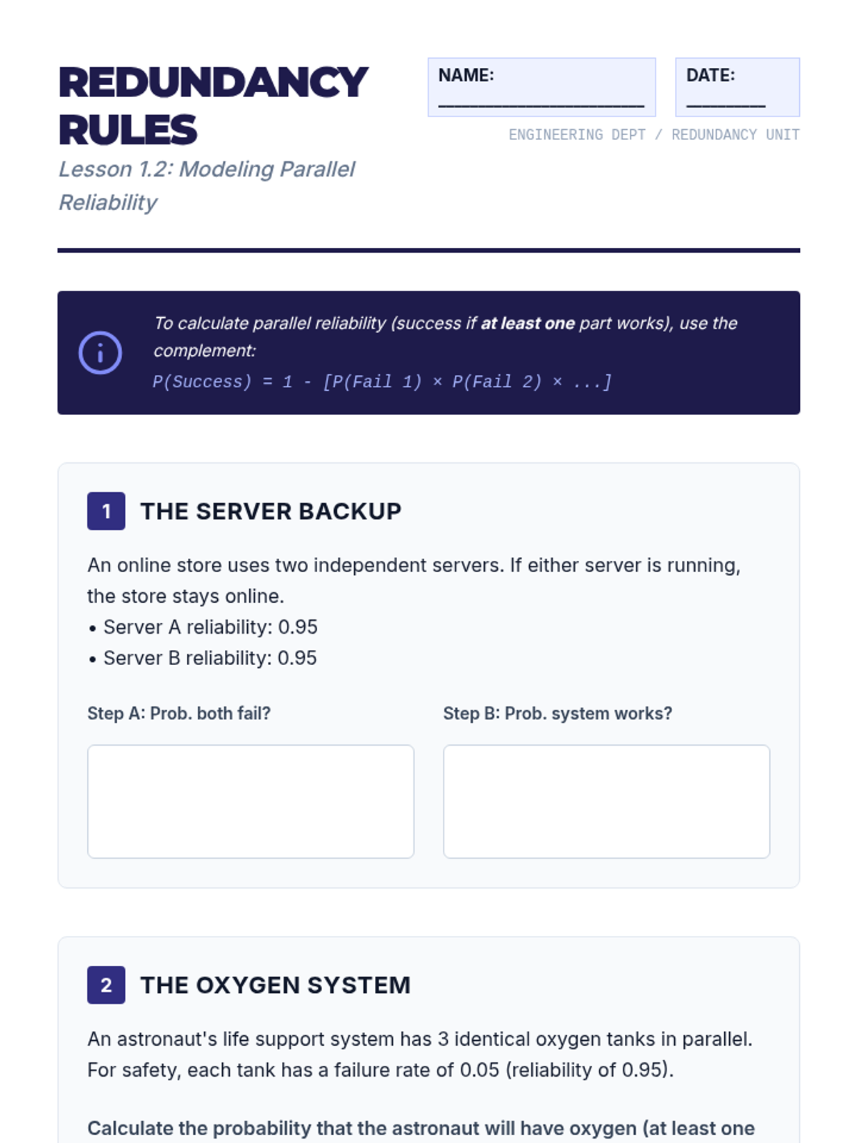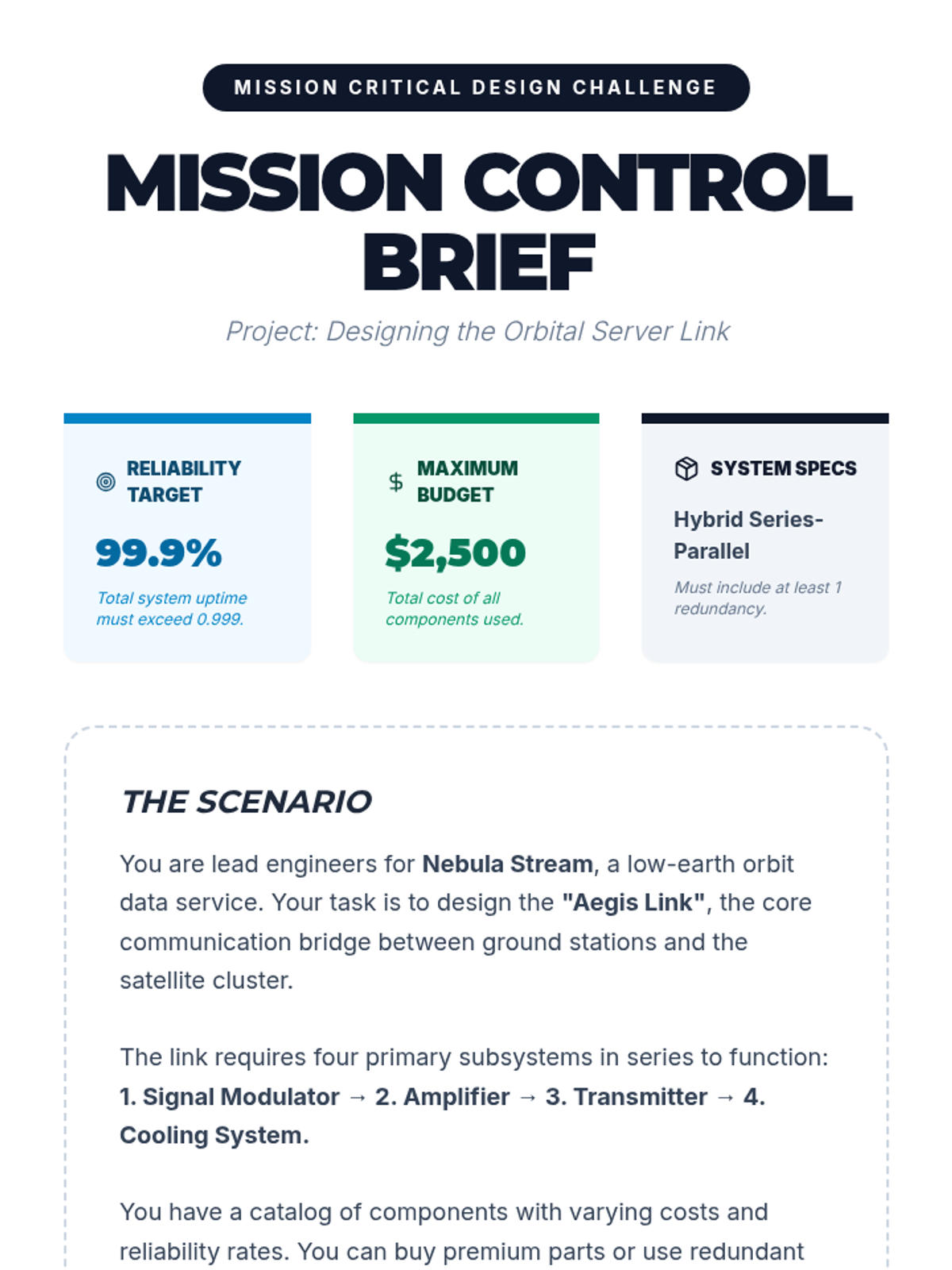 A 12th-grade mathematics sequence exploring compound probability through the lens of engineering reliability. Students learn to model series and parallel systems, use complement rules for redundancy, and optimize system designs within budgetary constraints.