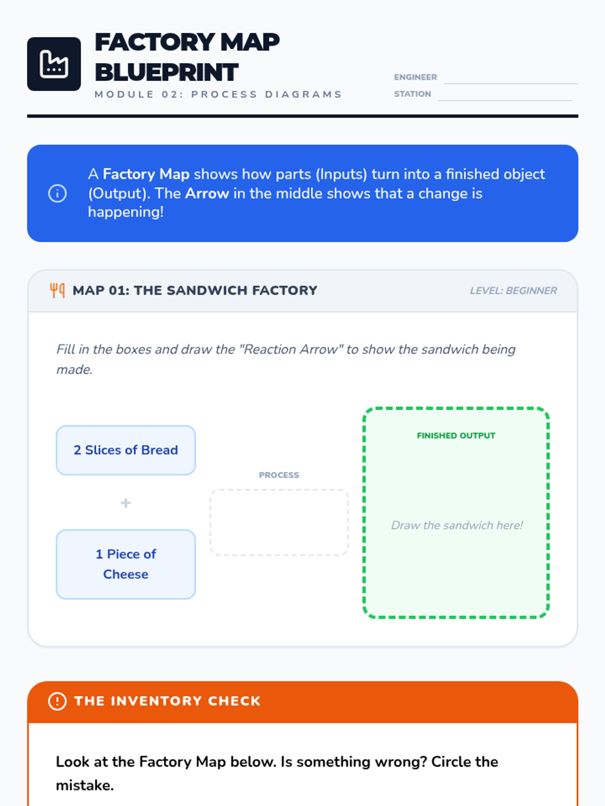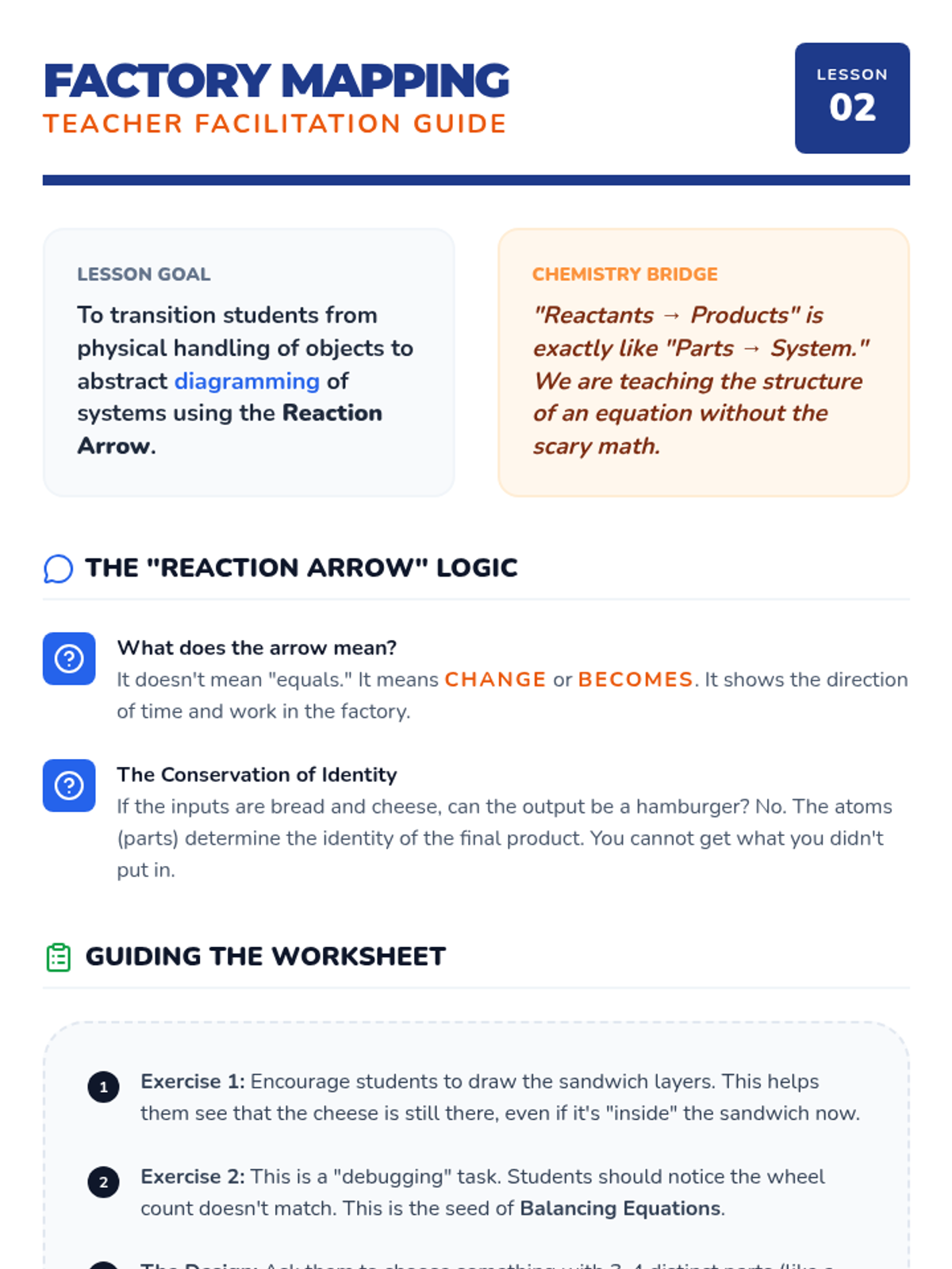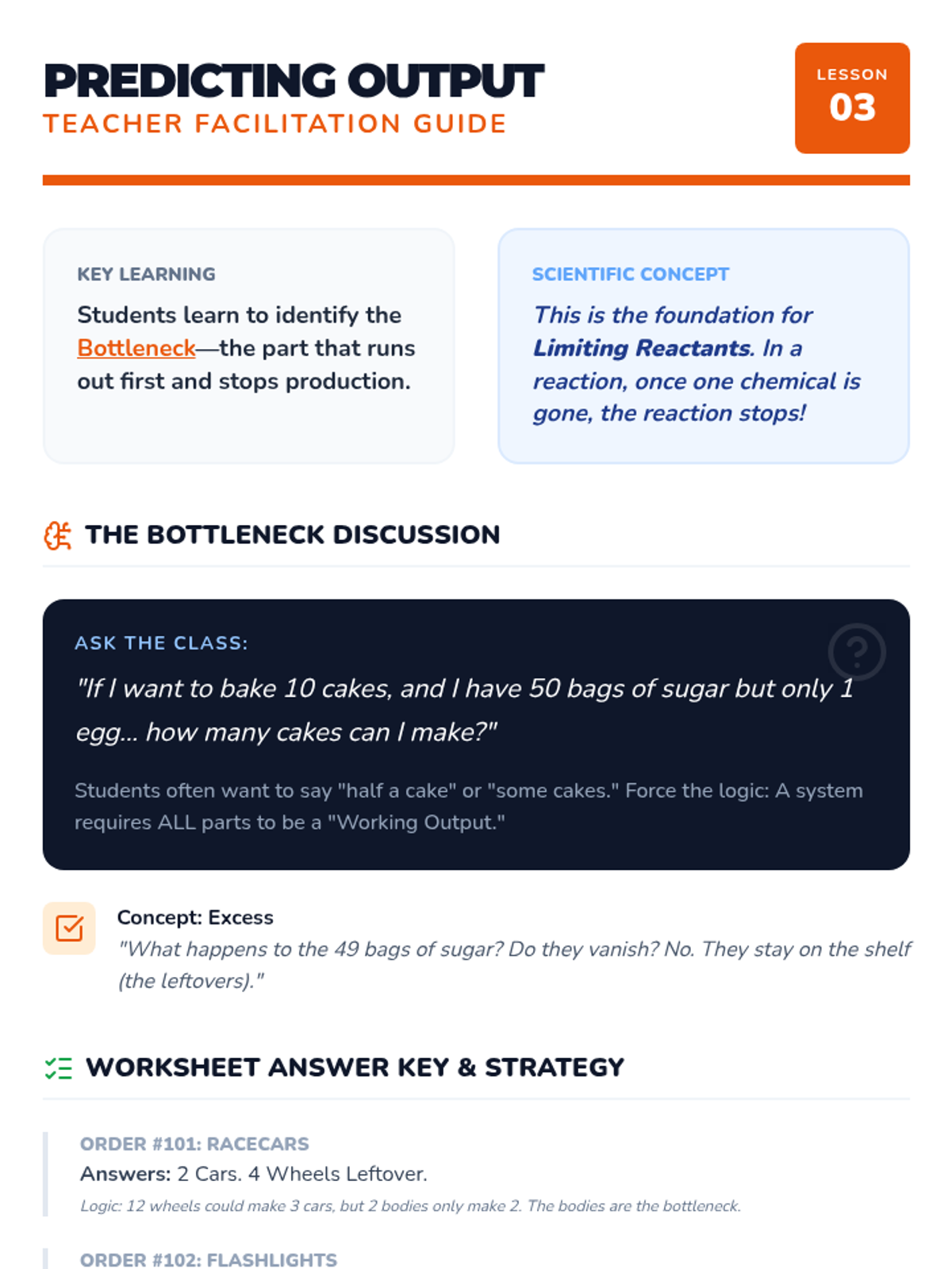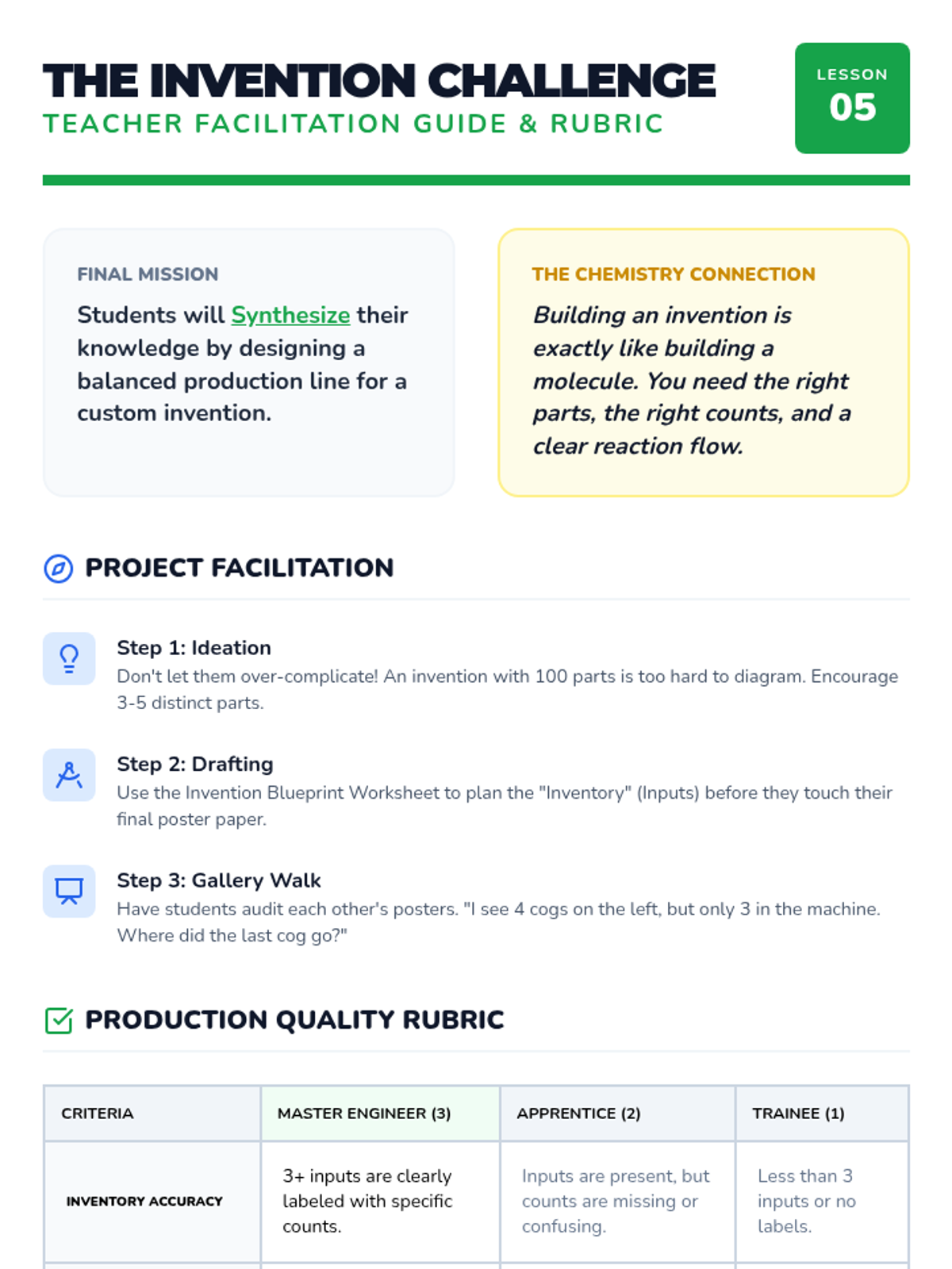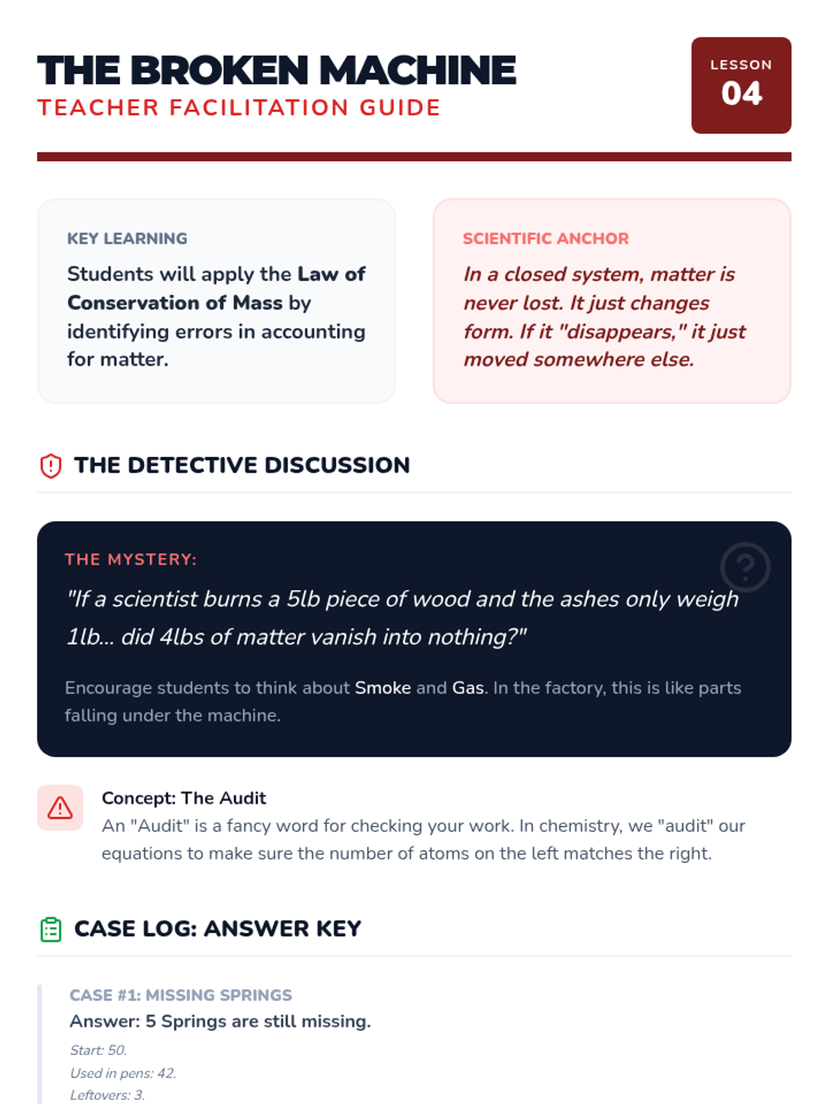 A 3rd-grade introductory chemistry sequence that uses mechanical systems (toy cars, pens) to teach the conservation of matter. Students explore 'inputs' and 'outputs' through disassembly, diagramming, and factory simulations to understand that matter is rearranged, not created or destroyed.
