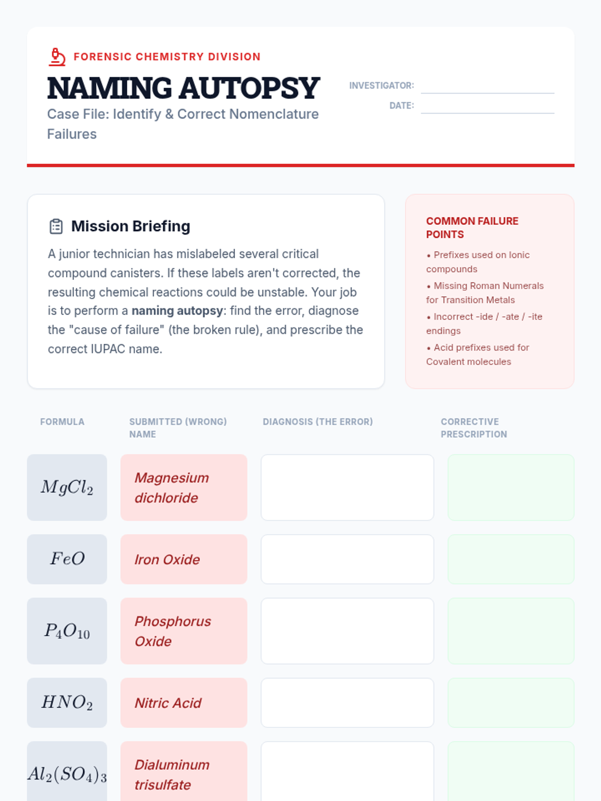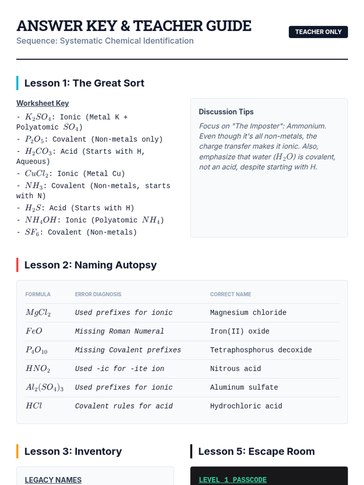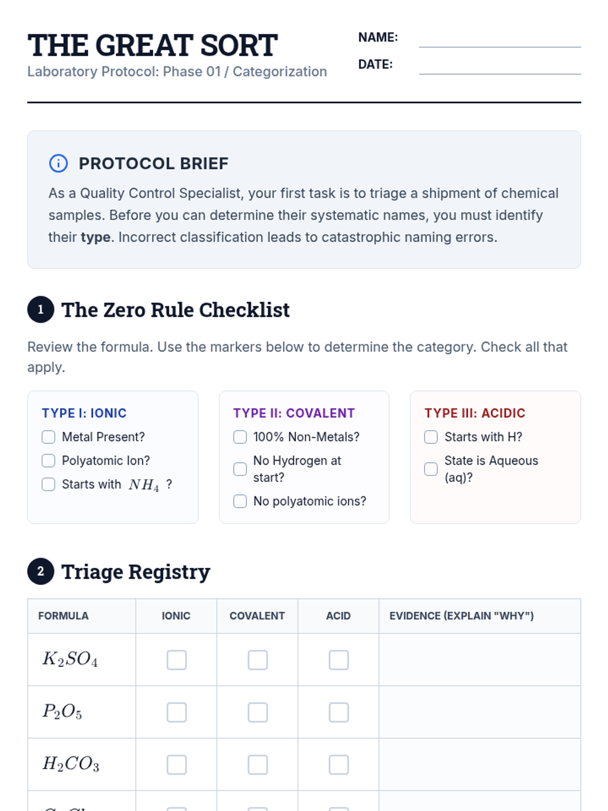 A comprehensive 9th-grade chemistry unit that integrates ionic, covalent, and acidic nomenclature through simulation, error analysis, and project-based learning. Students act as quality control specialists to master the language of chemical identification and system integration.