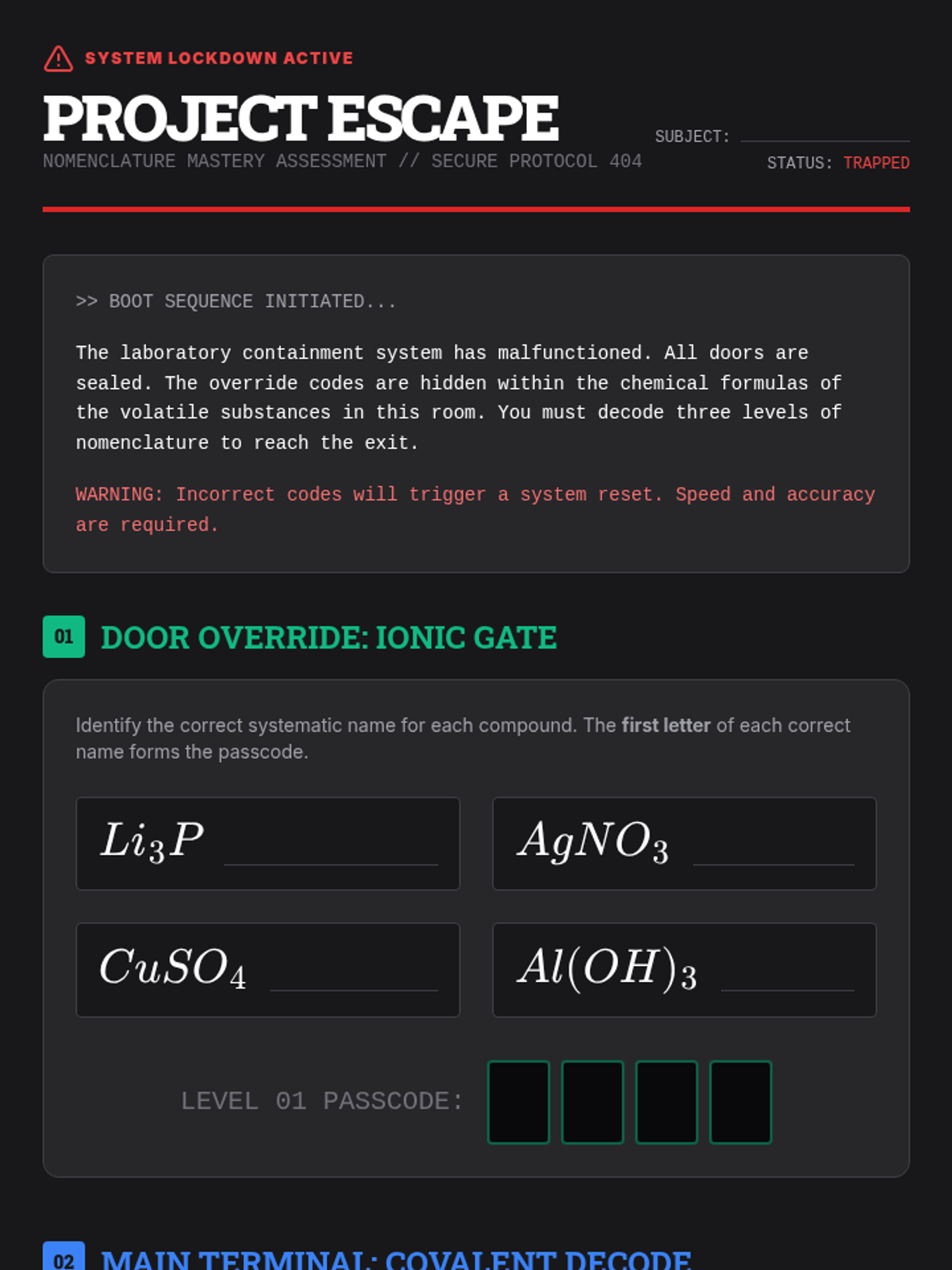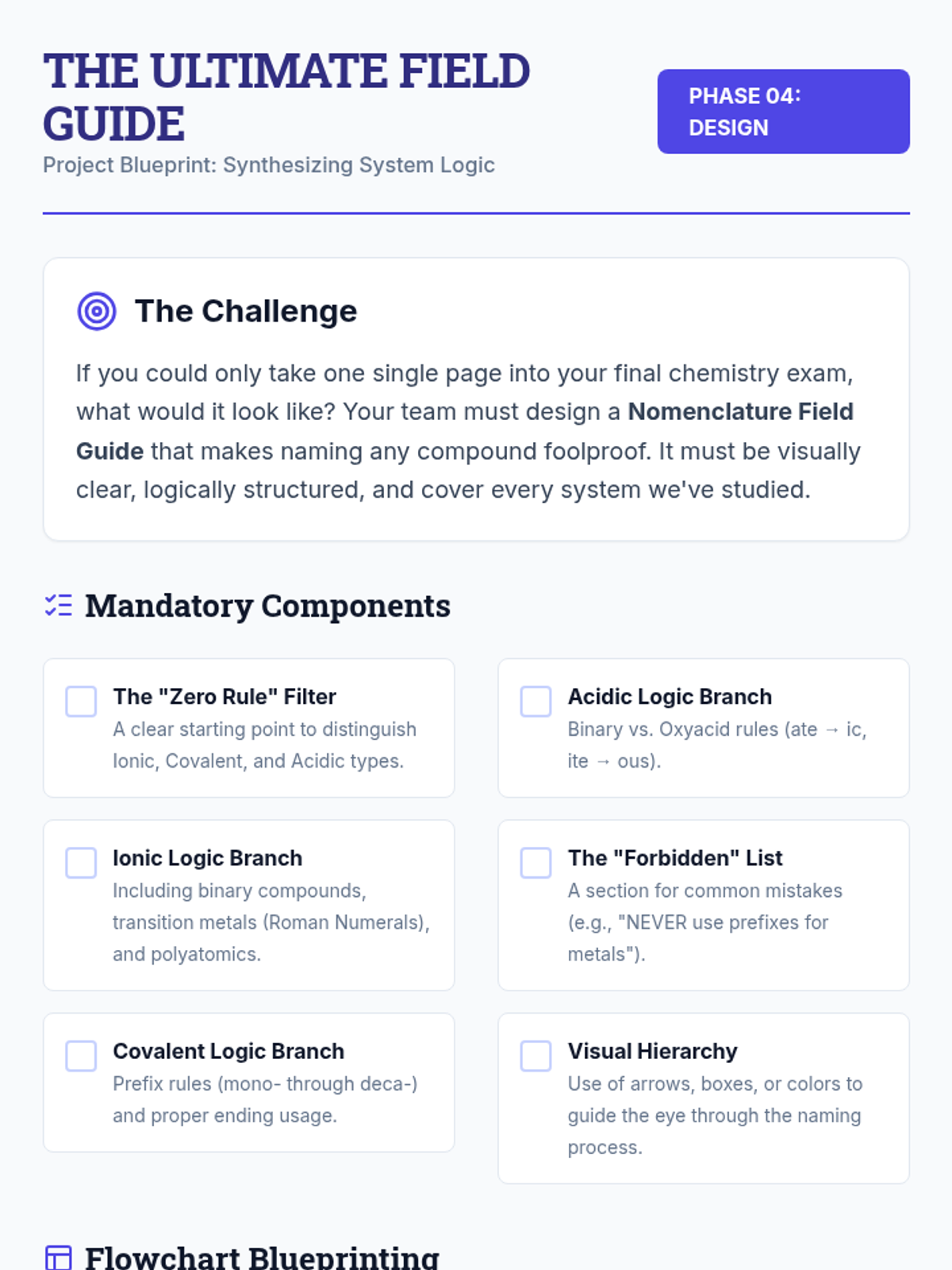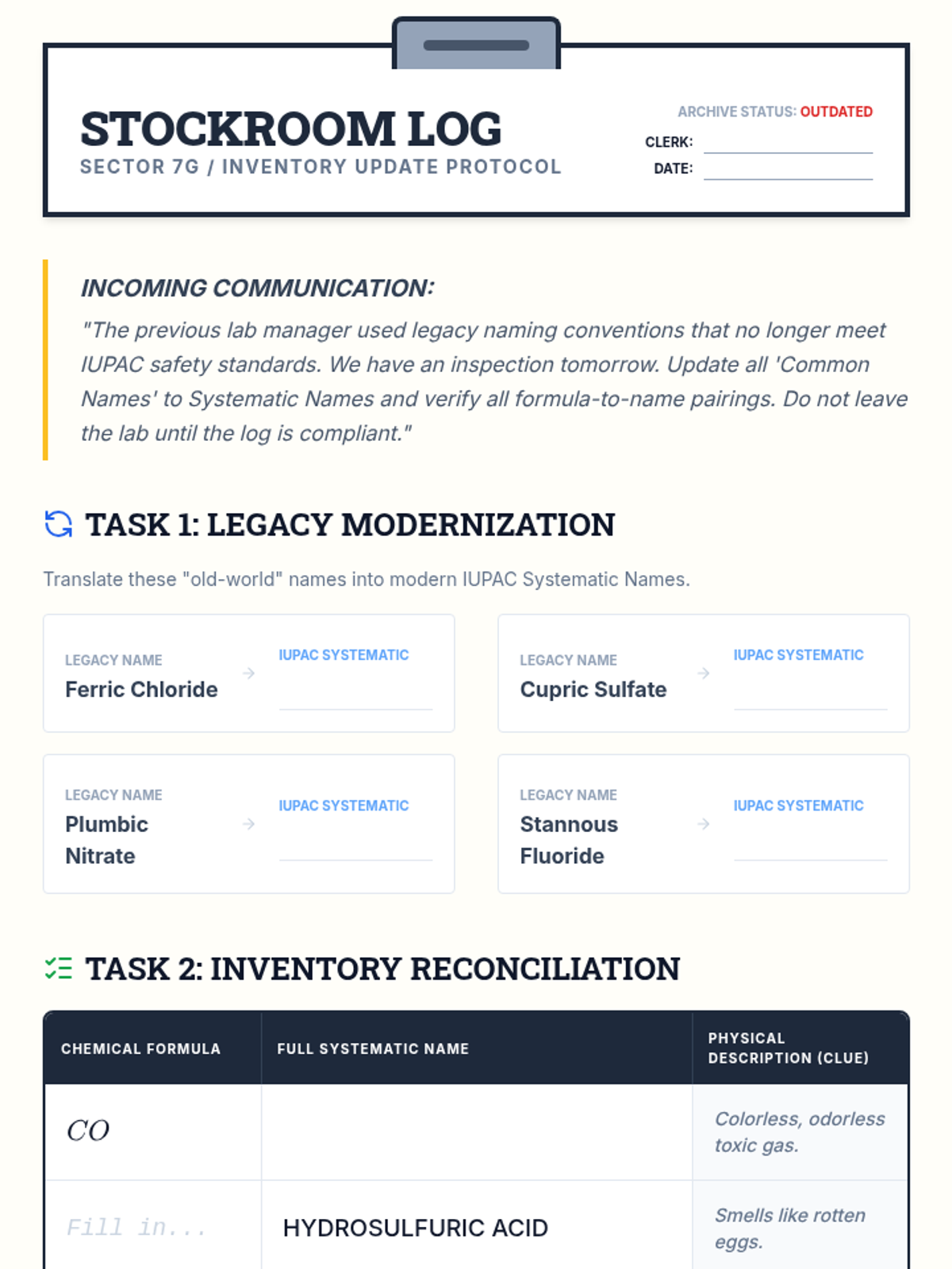 A comprehensive 9th-grade chemistry unit that integrates ionic, covalent, and acidic nomenclature through simulation, error analysis, and project-based learning. Students act as quality control specialists to master the language of chemical identification and system integration.