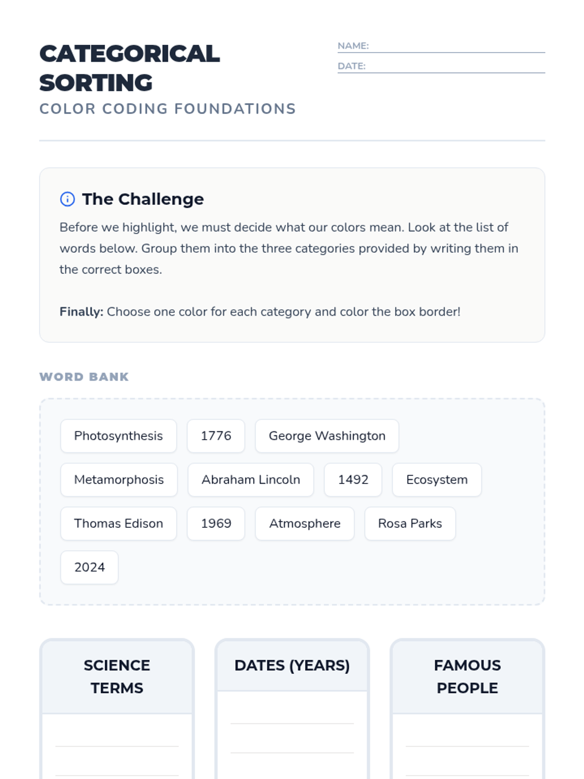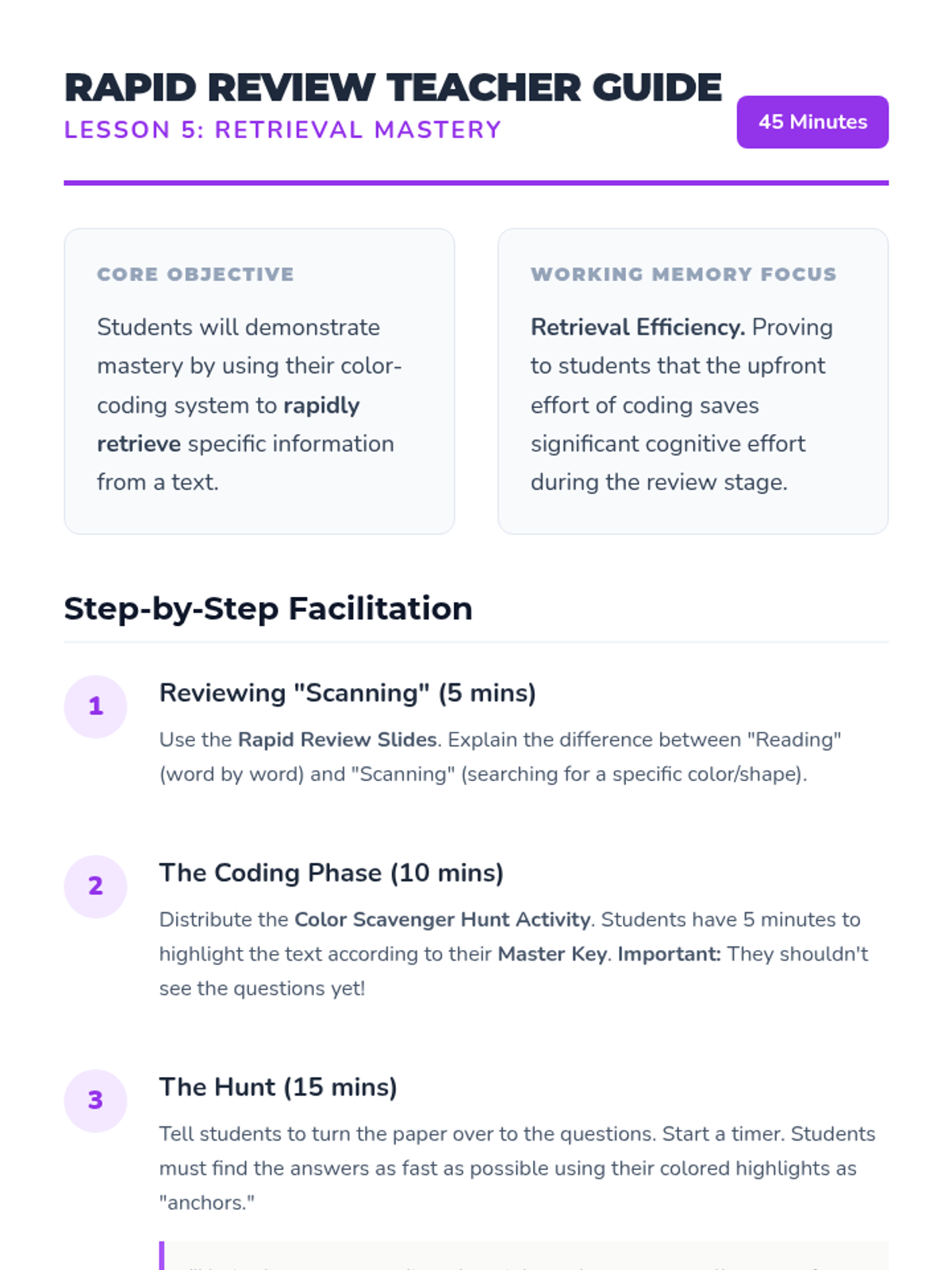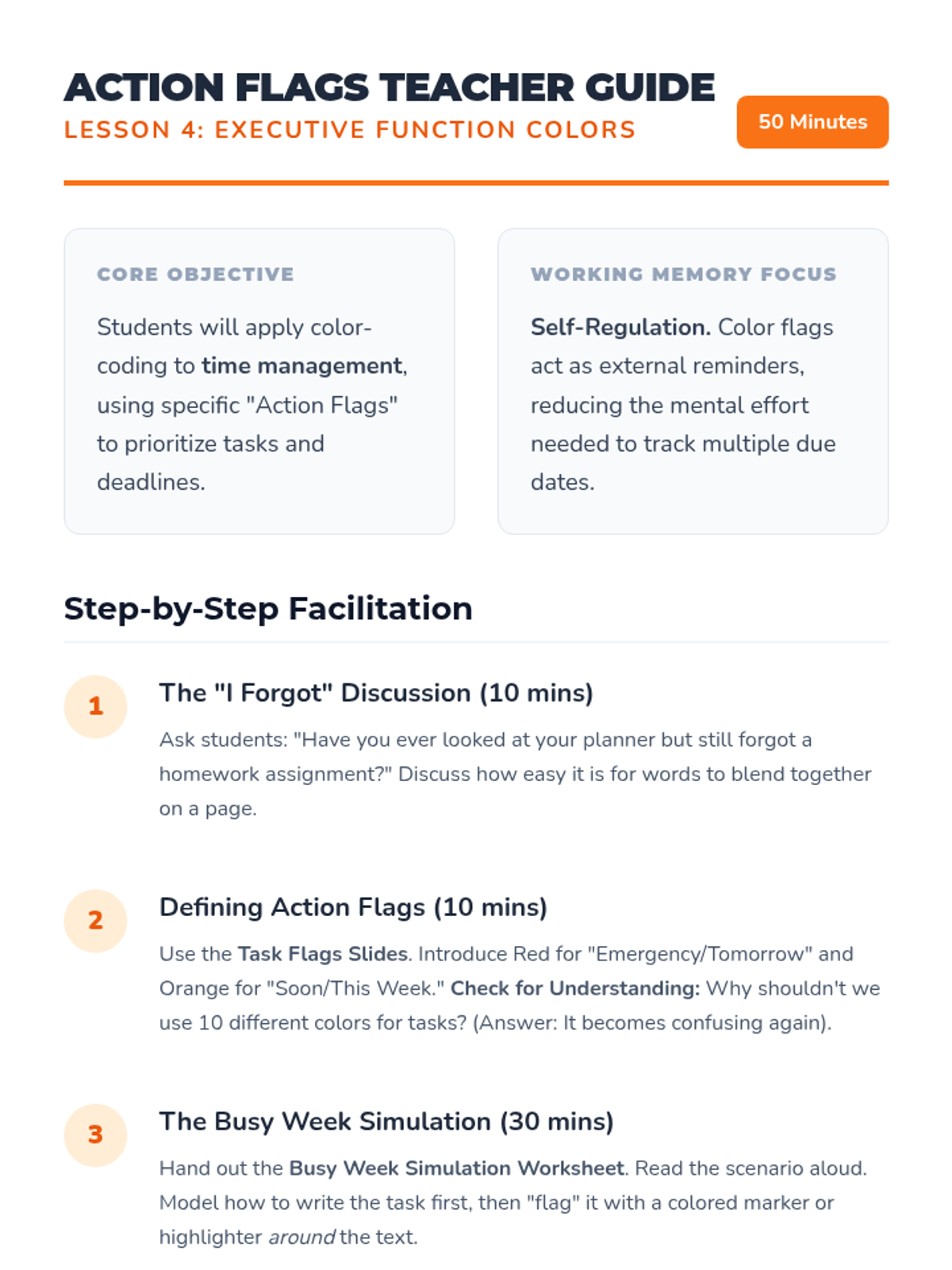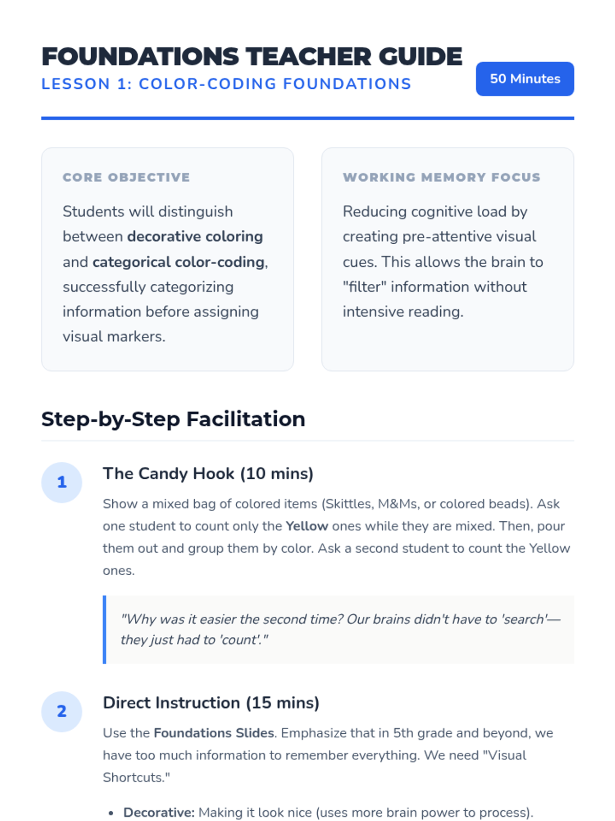A 5-lesson sequence designed to help 5th-grade students with working memory challenges develop a systematic, color-coded organizational system for note-taking and task management. Students move from basic categorization to creating a cross-subject color key and using it for rapid information retrieval.