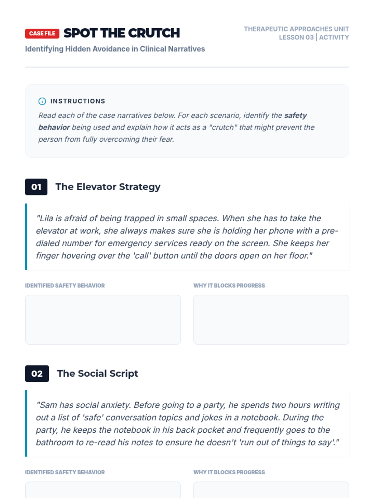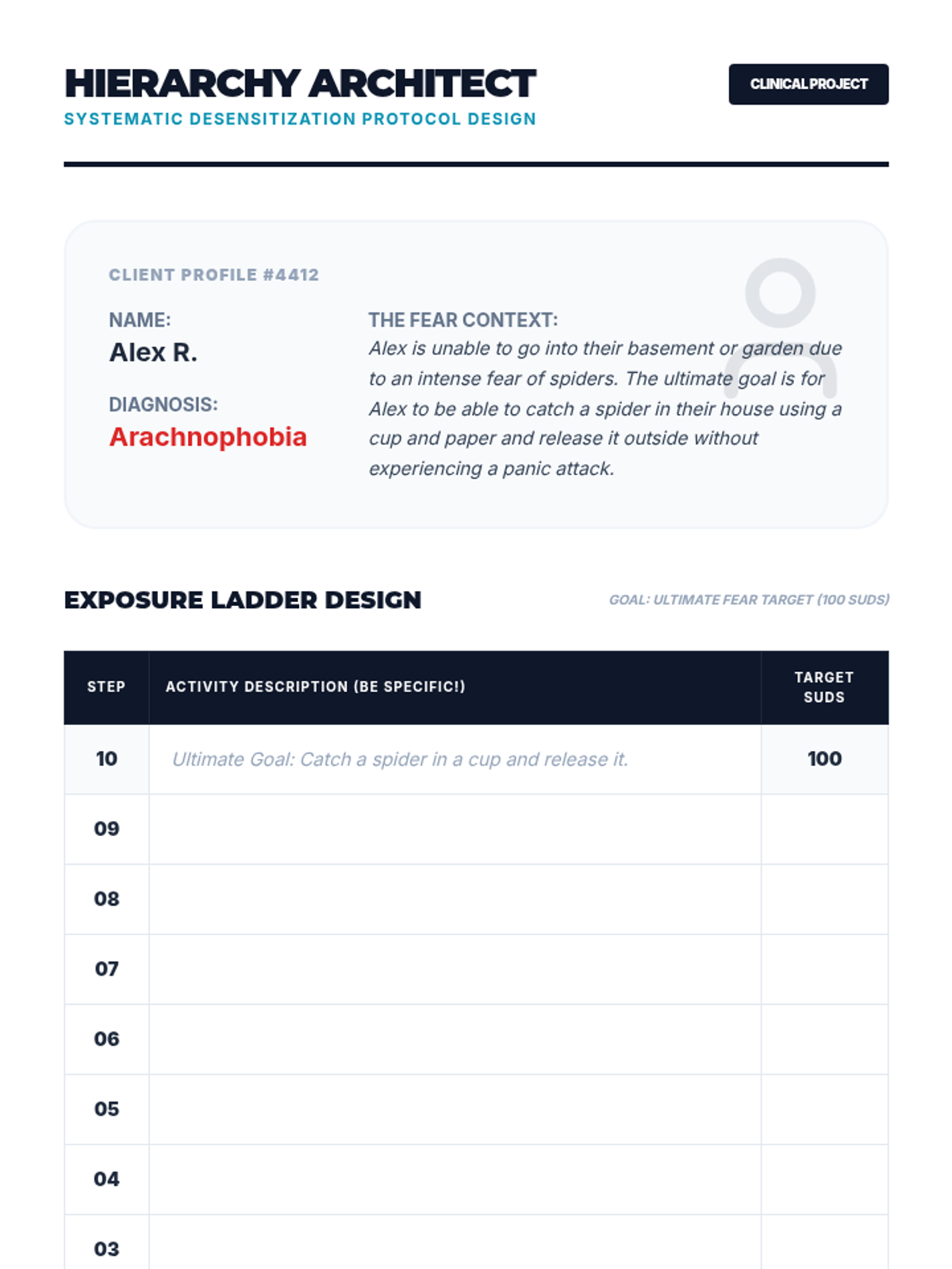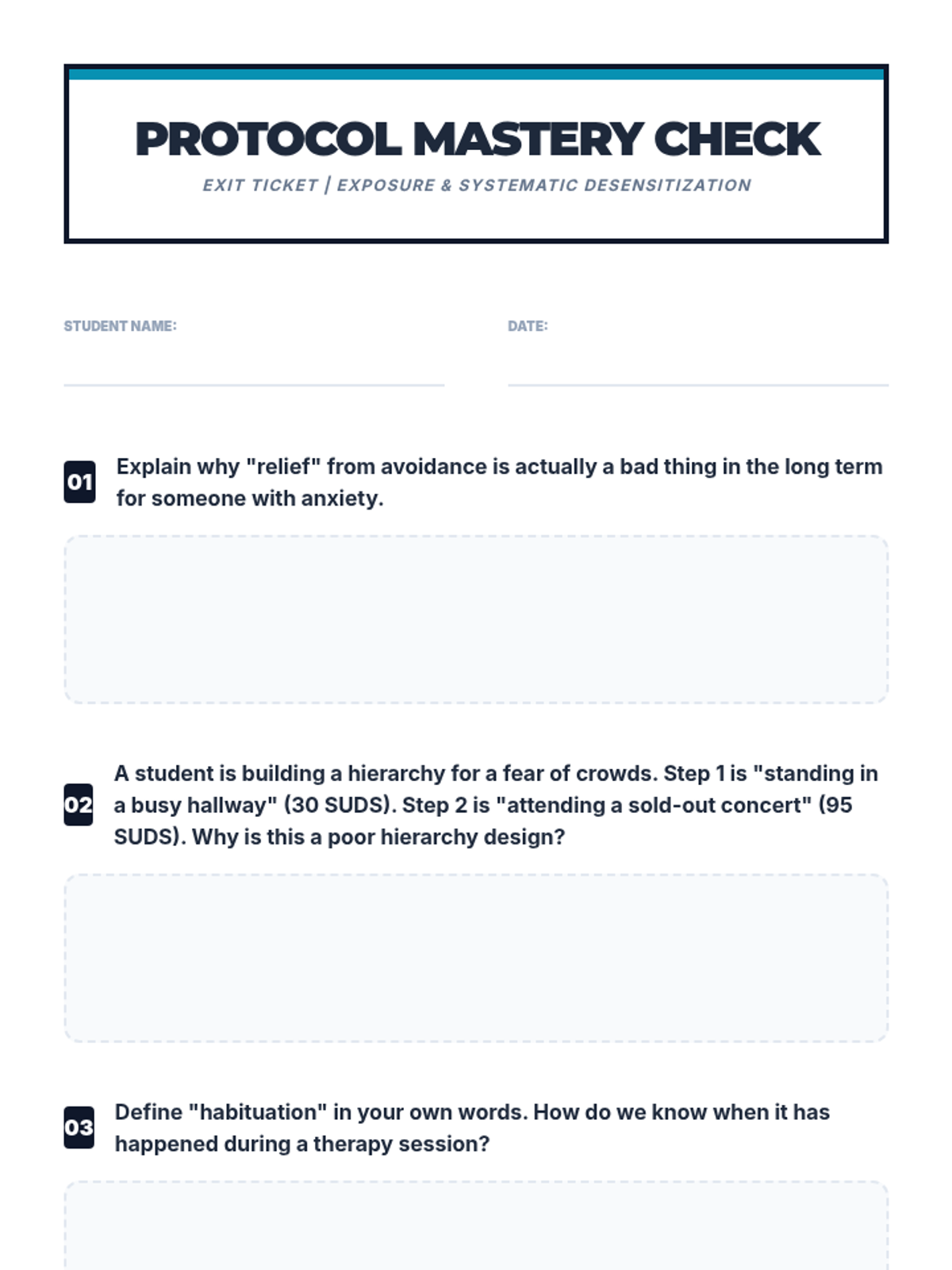 This sequence introduces 11th-grade students to the principles of systematic desensitization and exposure therapy. Students will move from understanding the behavioral mechanics of anxiety (the cycle of avoidance) to technically designing and evaluating exposure hierarchies for therapeutic use.