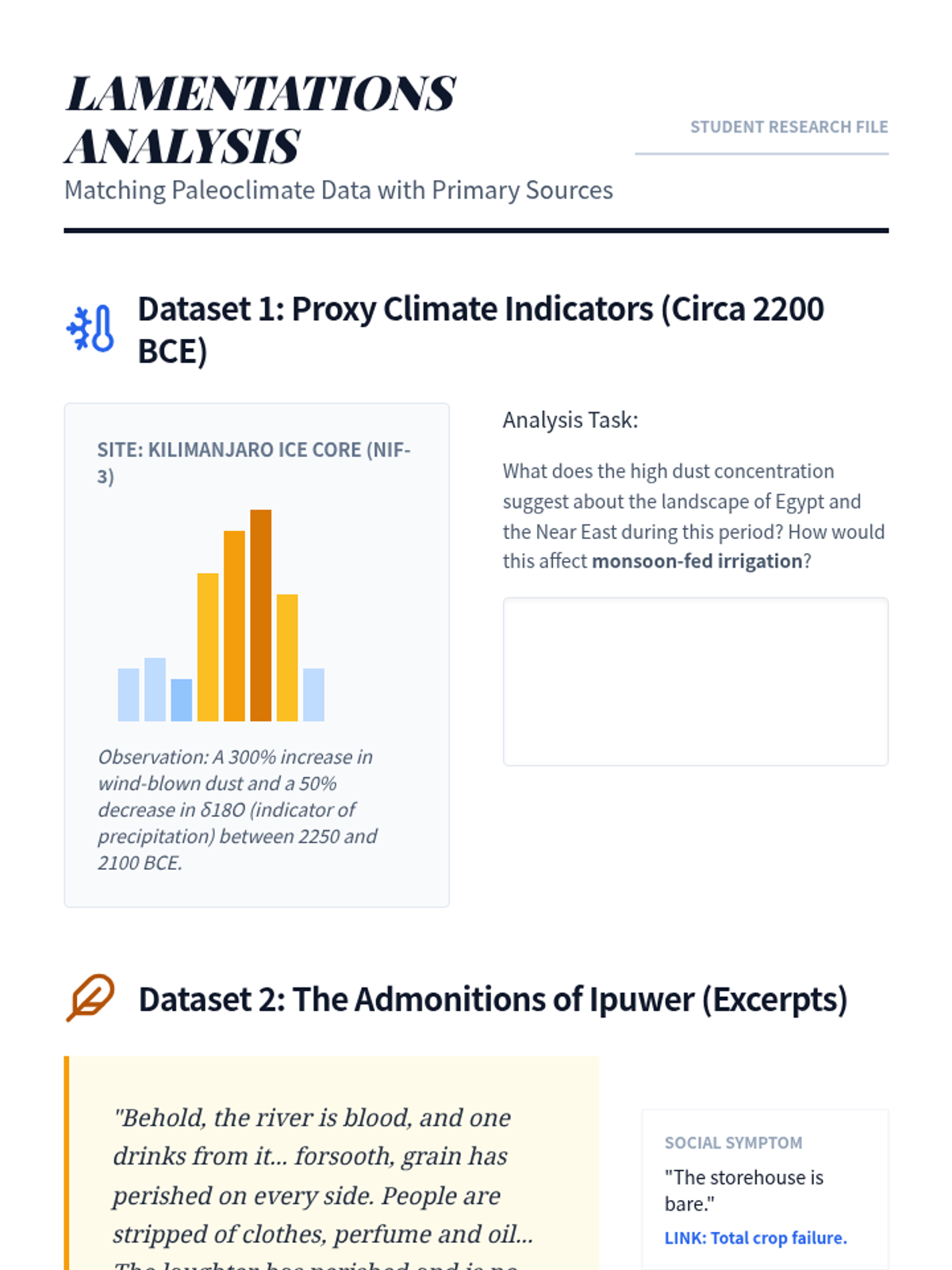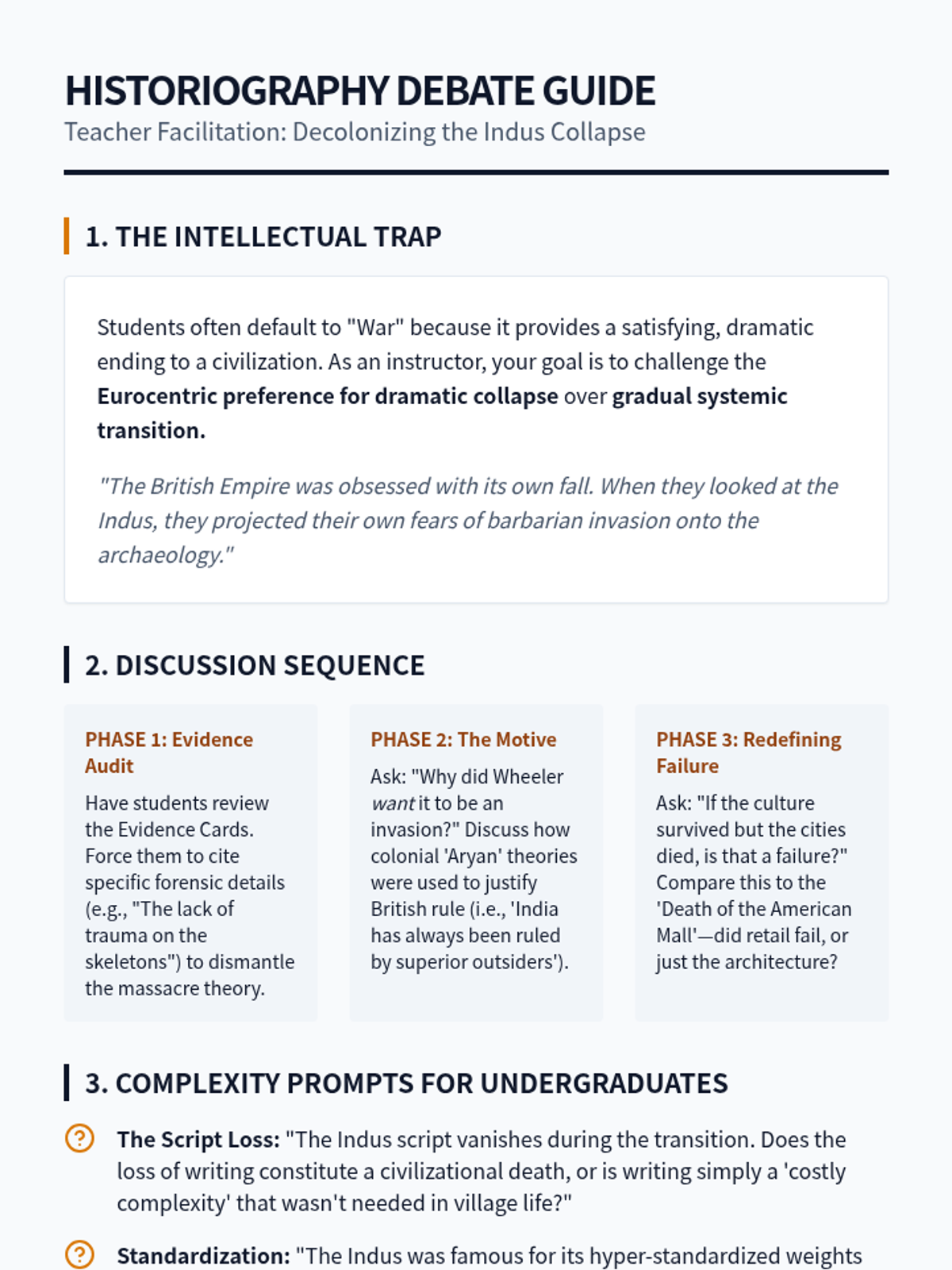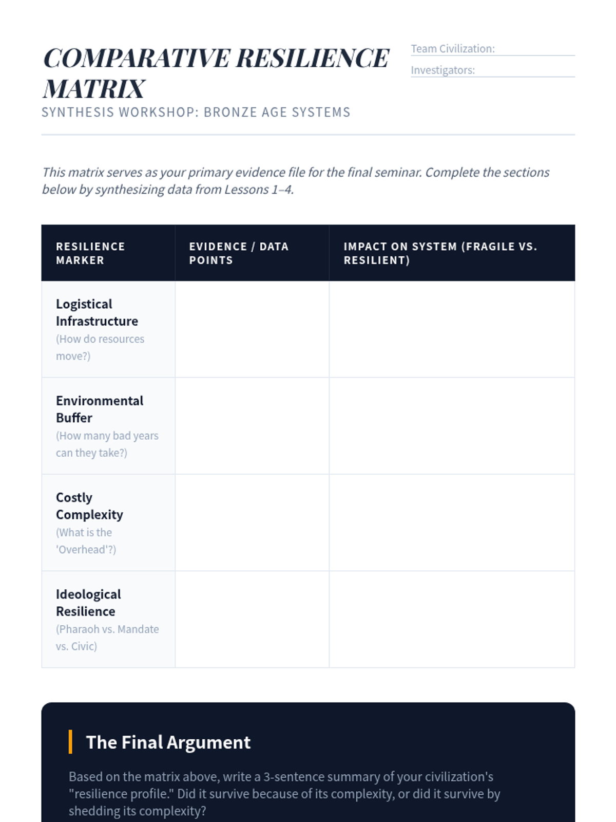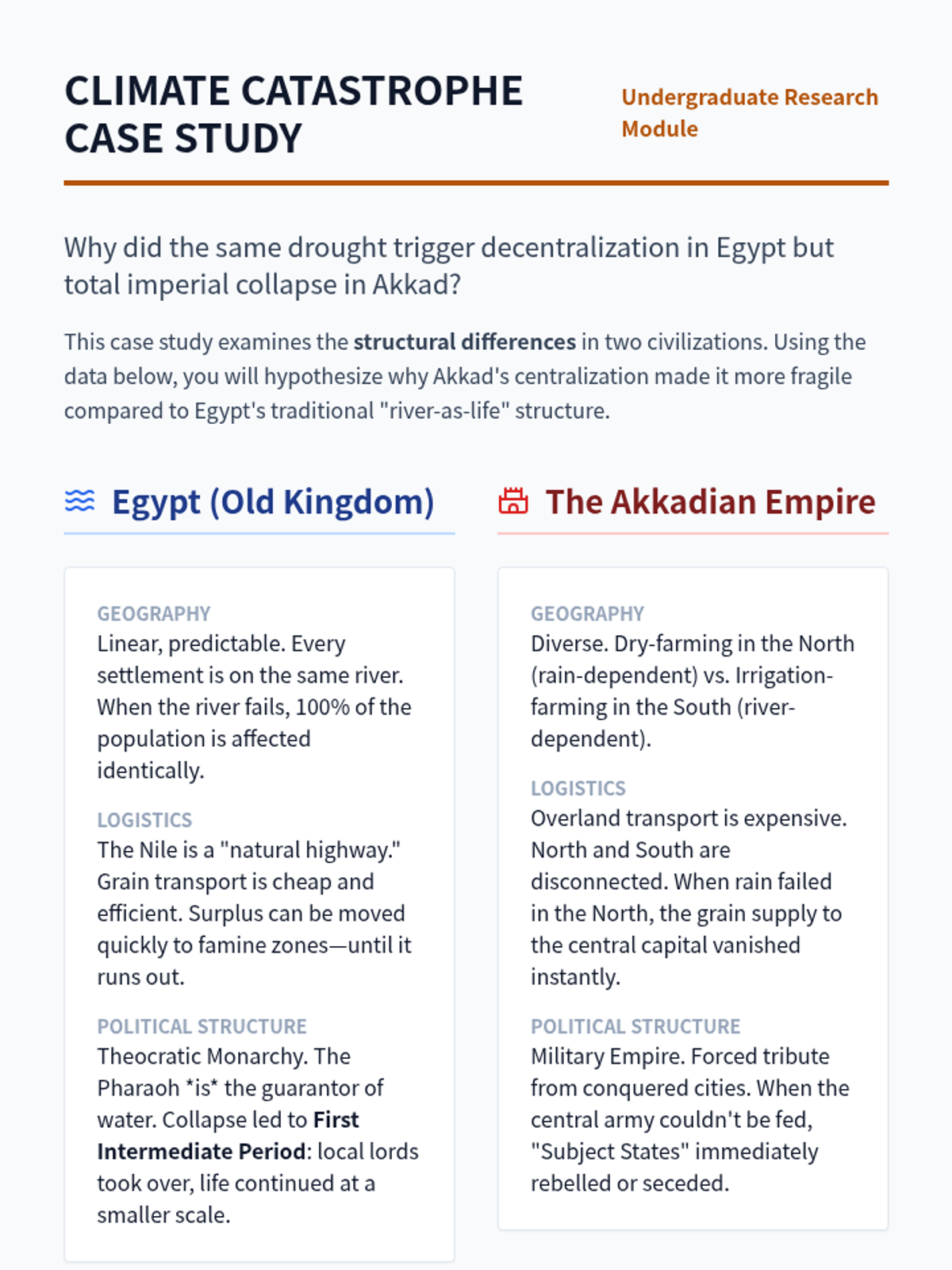 An undergraduate-level exploration of the collapse of Bronze Age civilizations through the lenses of systems theory, paleoclimatology, and historiographical critique. Students analyze why complex river valley societies like Egypt, Akkad, the Indus Valley, and the Shang Dynasty transformed or disappeared, challenging the binary of 'success' and 'failure'.