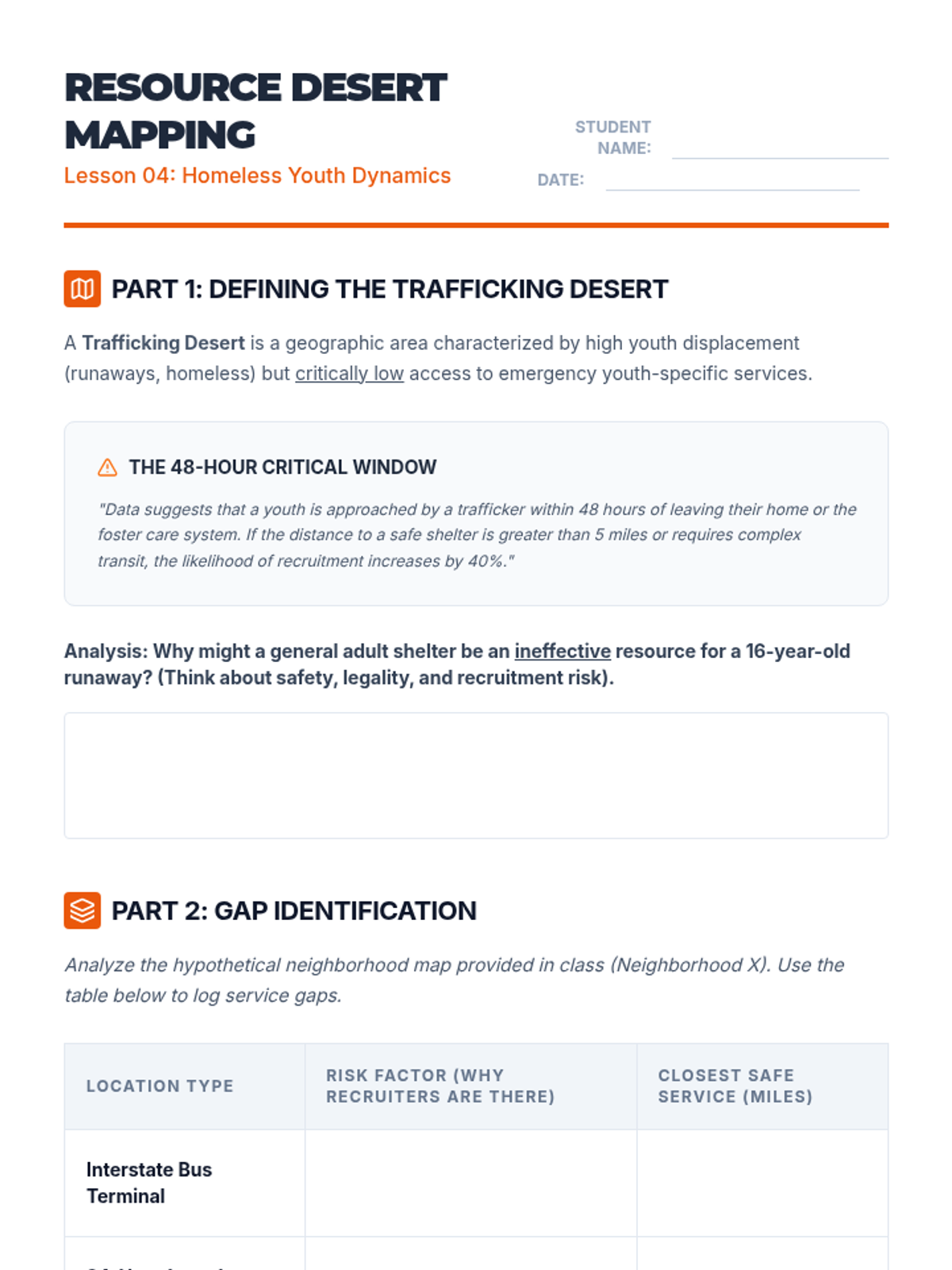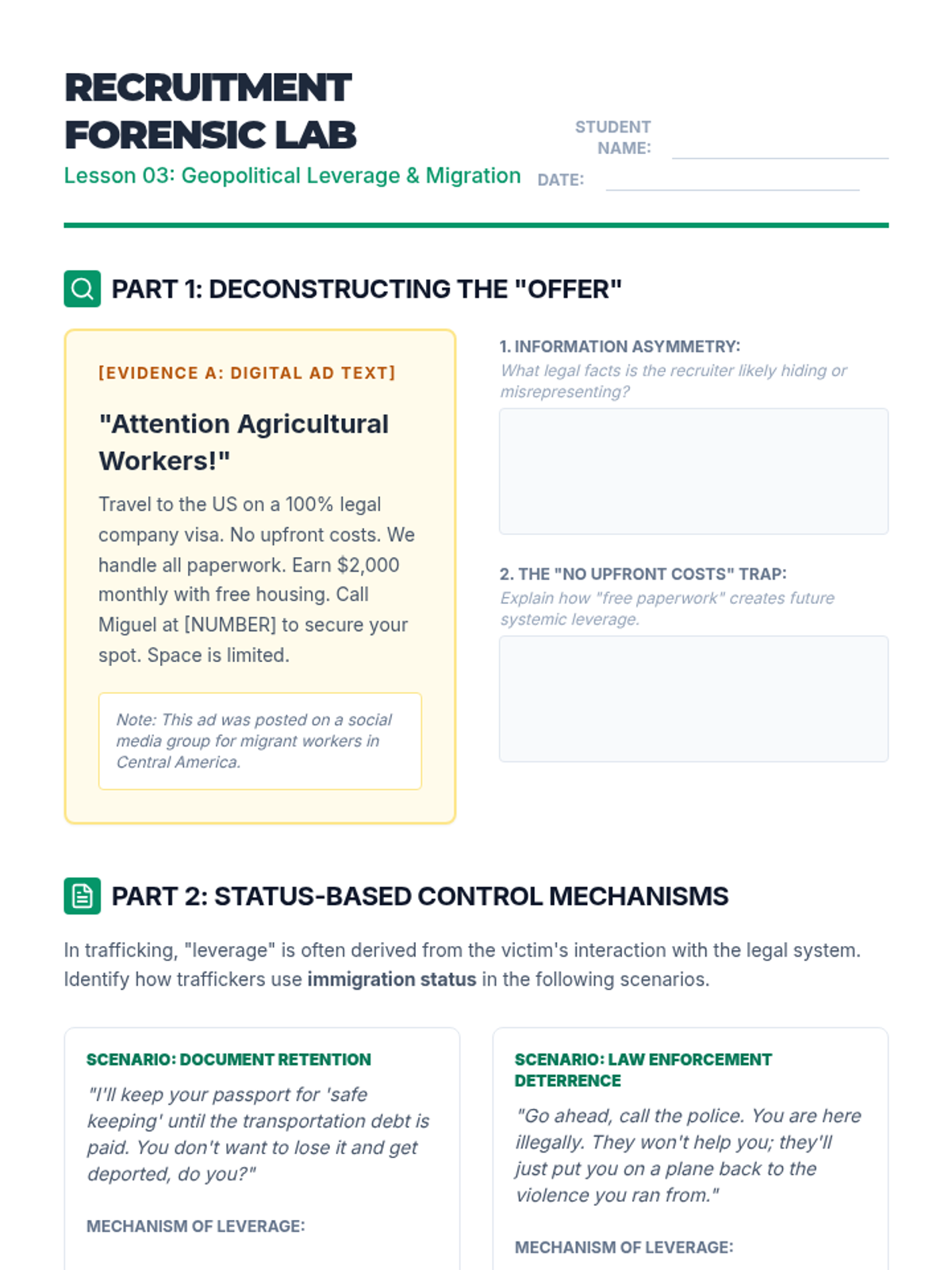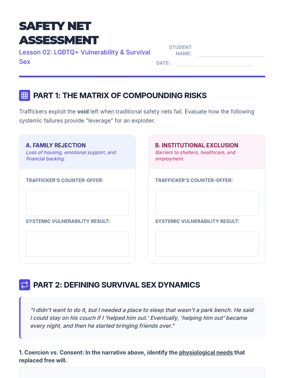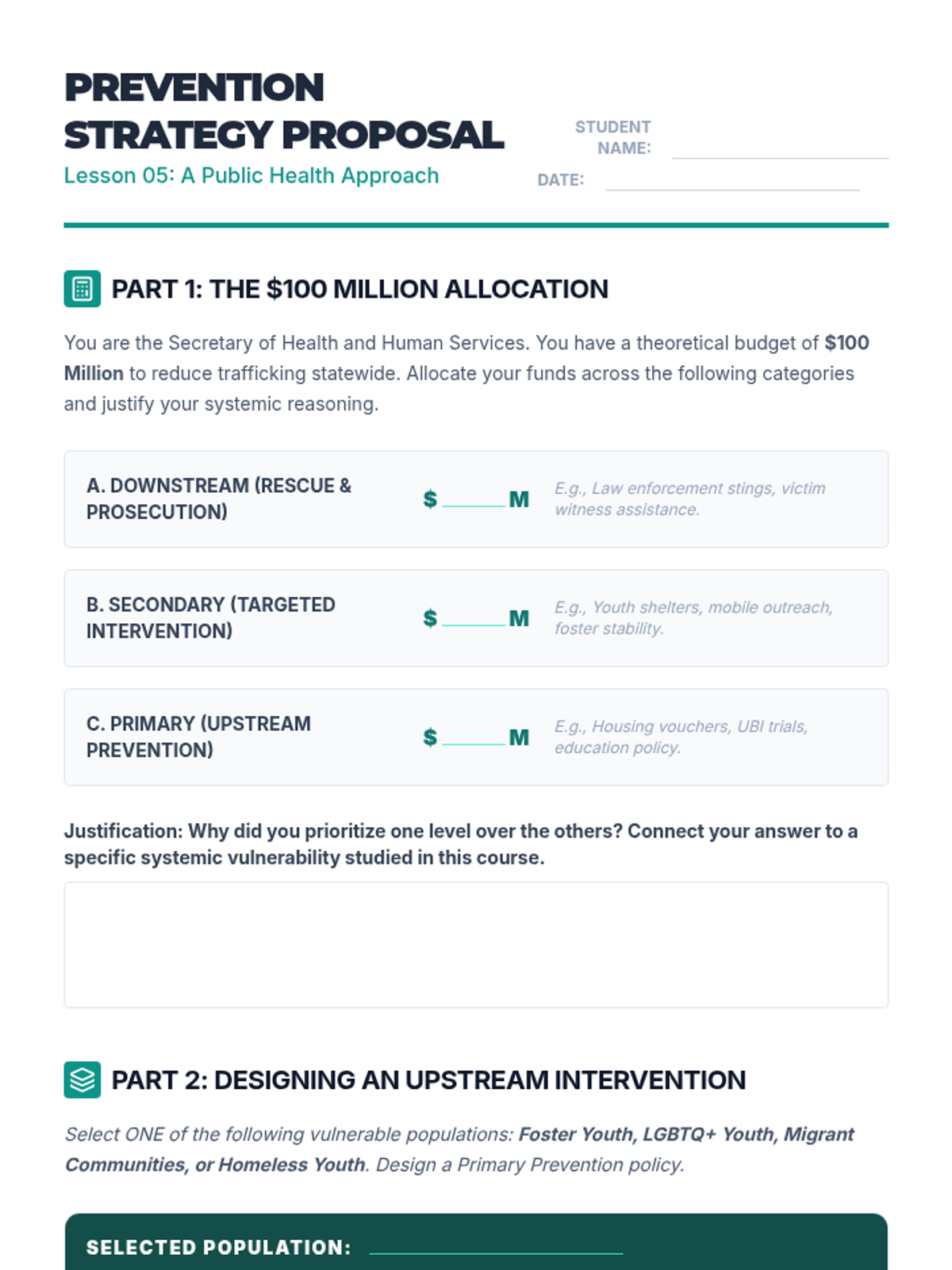 This undergraduate sequence shifts the focus of human trafficking education from individual criminal acts to systemic societal failures. Students analyze how the foster care system, LGBTQ+ rejection, migration policies, and youth homelessness create structural vulnerabilities that traffickers exploit, ultimately proposing public health interventions.
