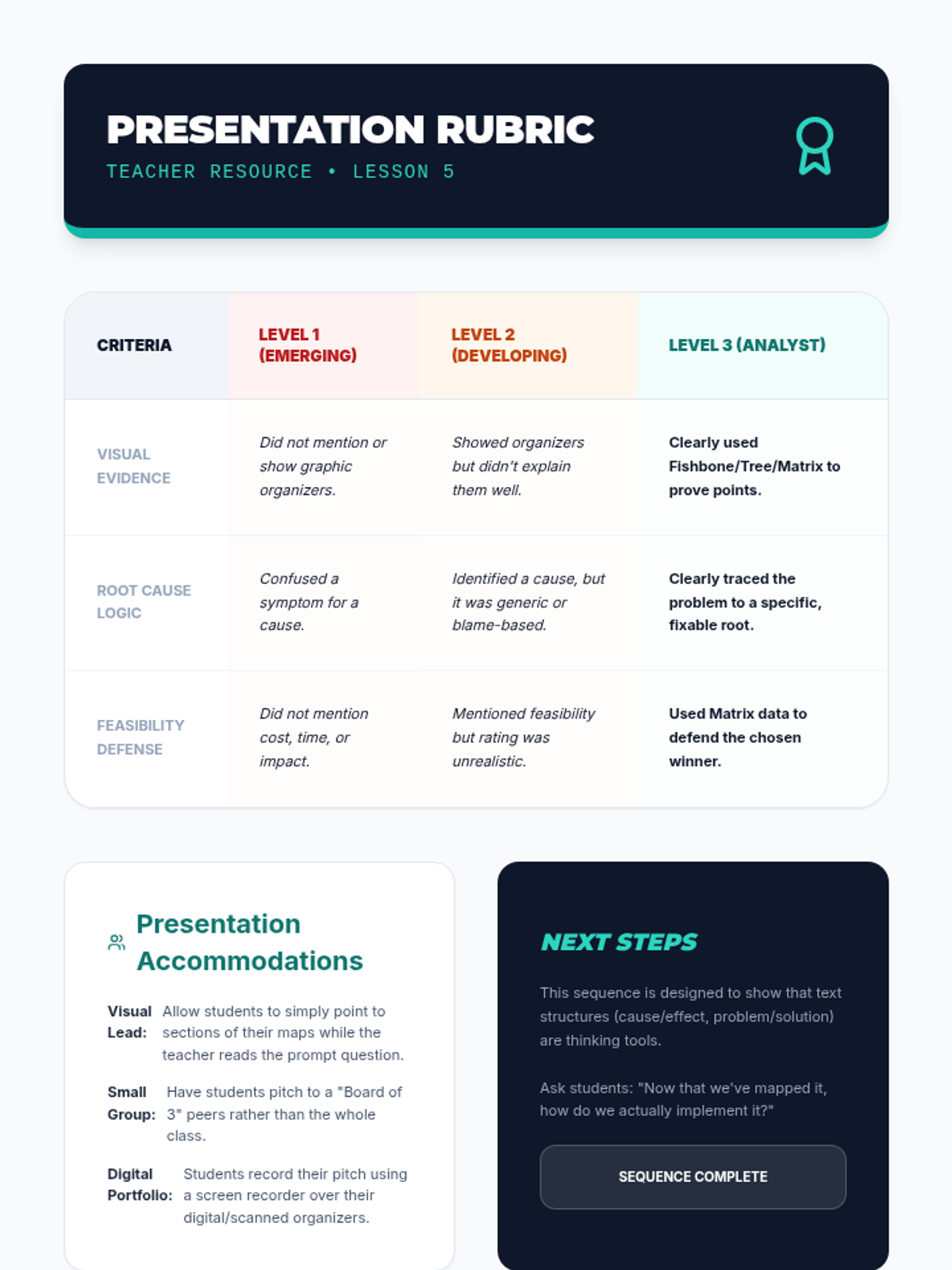 A project-based unit where students act as systems analysts, using cause-and-effect and problem-solution graphic organizers to investigate real-world community issues and propose evidence-based solutions.