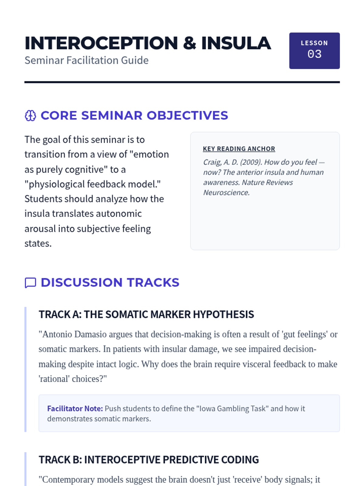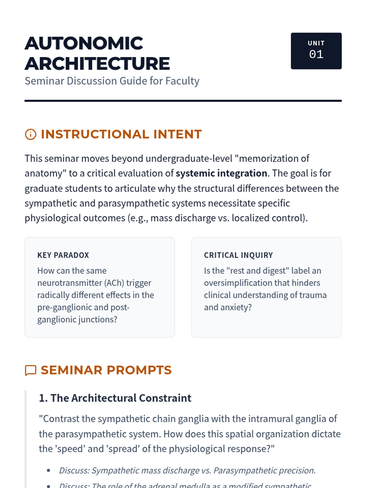 This graduate-level sequence explores the intricate integration of the central and peripheral nervous systems, focusing on autonomic regulation, the HPA axis, interoception, and psychoneuroimmunology. Students will move beyond simple dichotomies to understand the complex feedback loops that maintain homeostasis and influence psychosomatic health.
