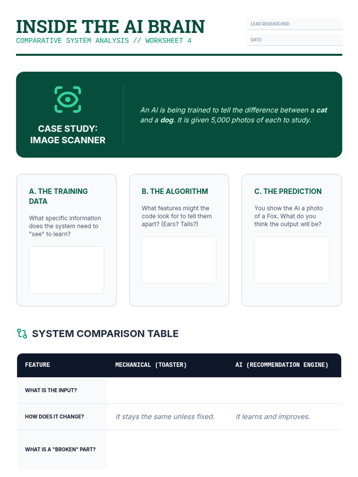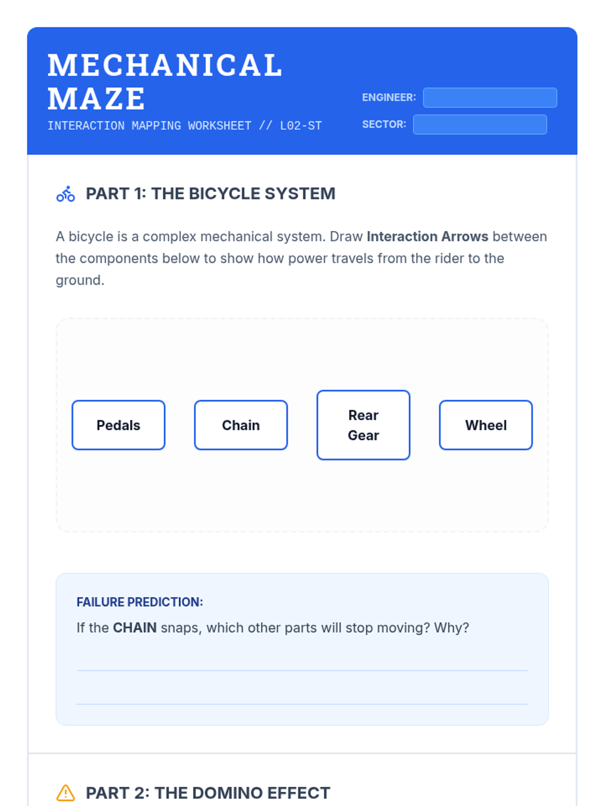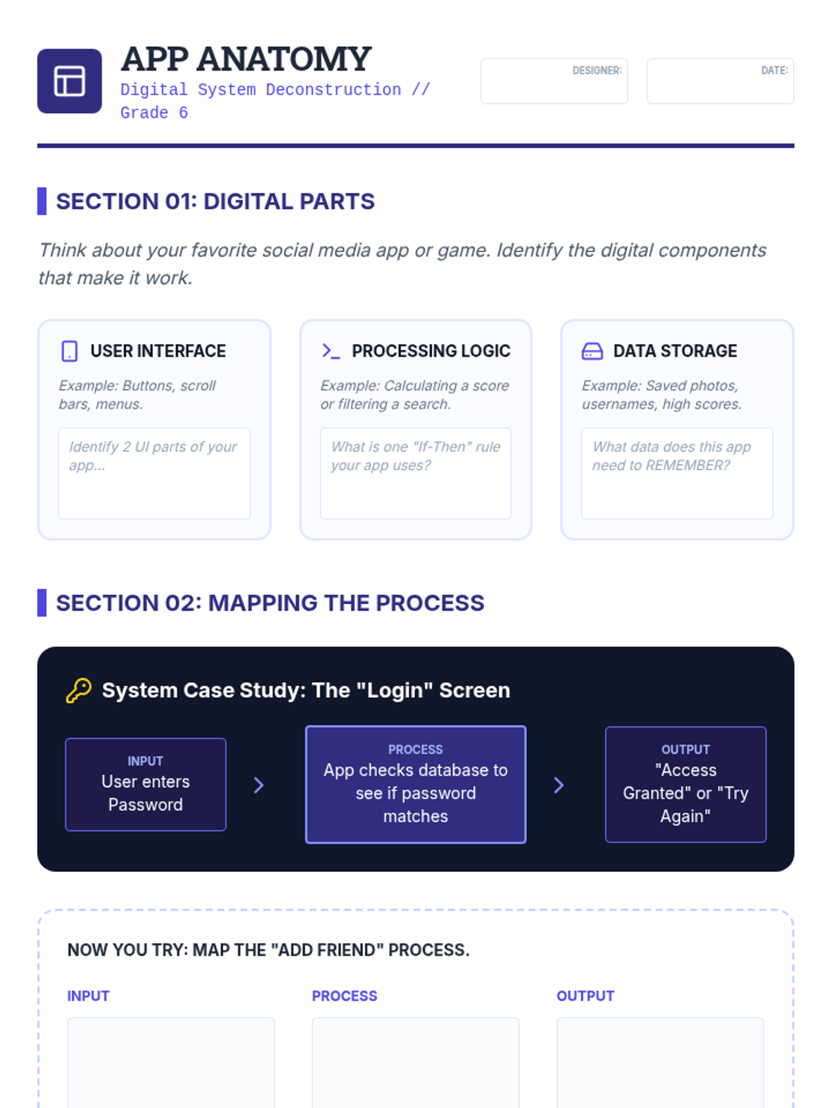 A 5-lesson unit for 6th graders exploring systems thinking through mechanical devices, digital programs, and AI models. Students learn to deconstruct systems into inputs, processes, and outputs while mapping complex interconnections.