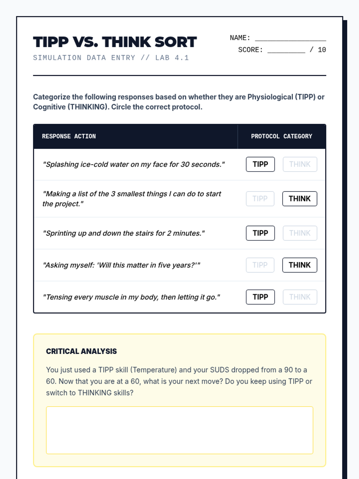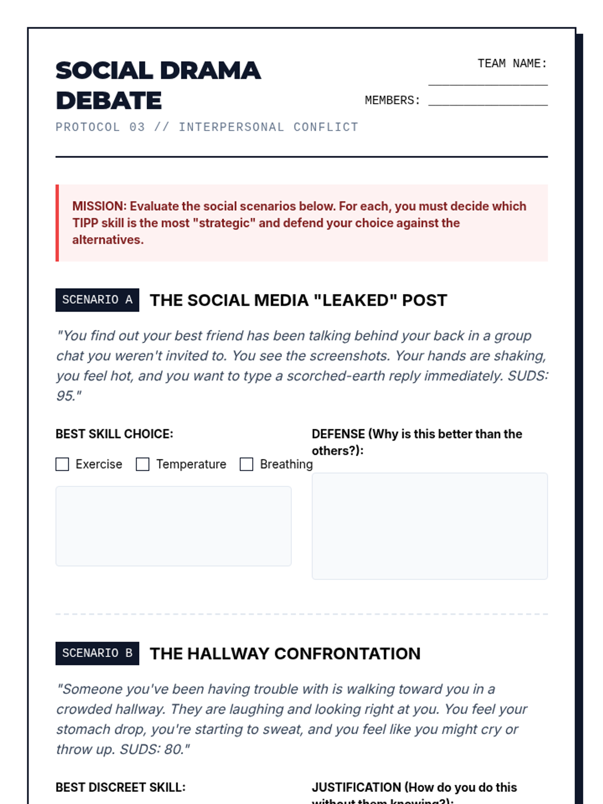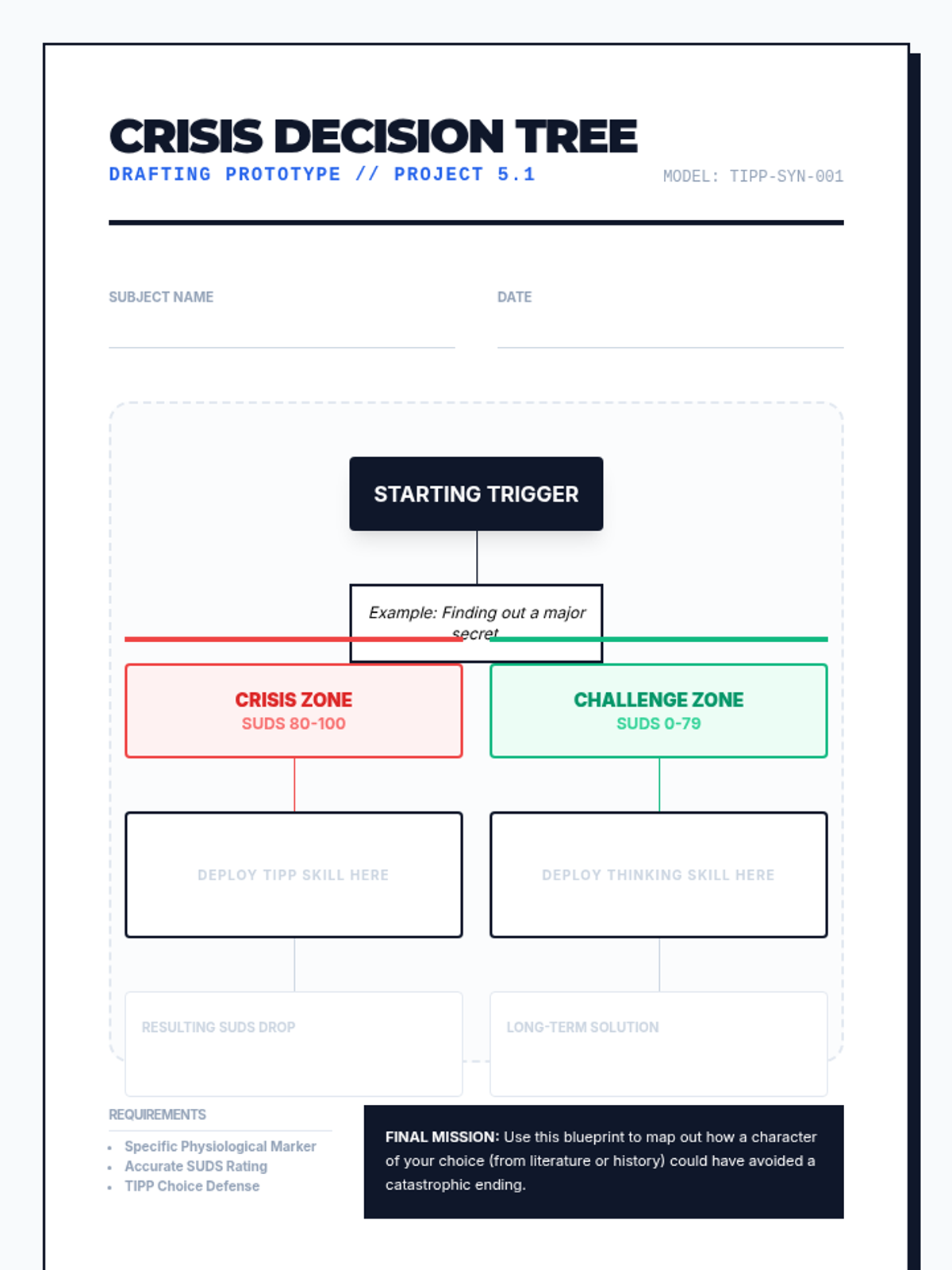 A comprehensive sequence designed for 8th-grade students to master the TIPP crisis survival skills. Students move from understanding physiological distress levels (SUDS) to analyzing complex academic and social scenarios, ultimately creating decision-making tools to manage high-arousal emotional states effectively.