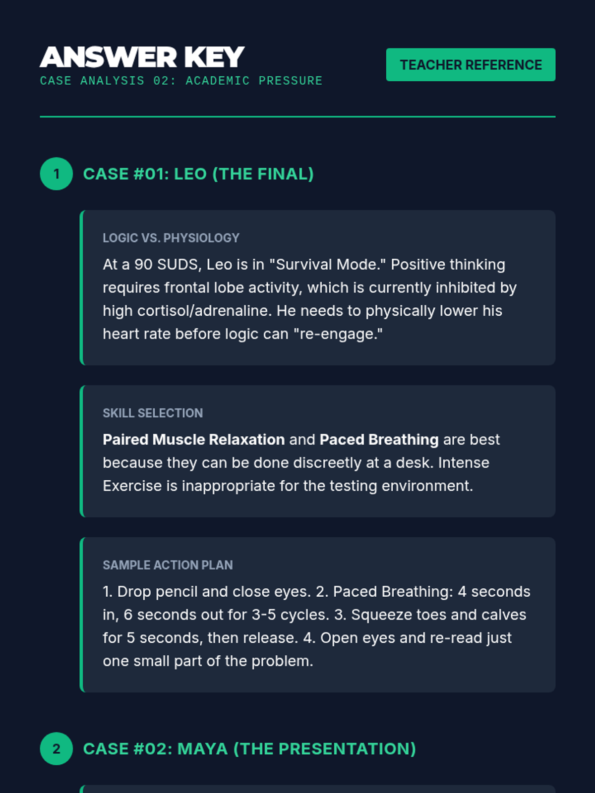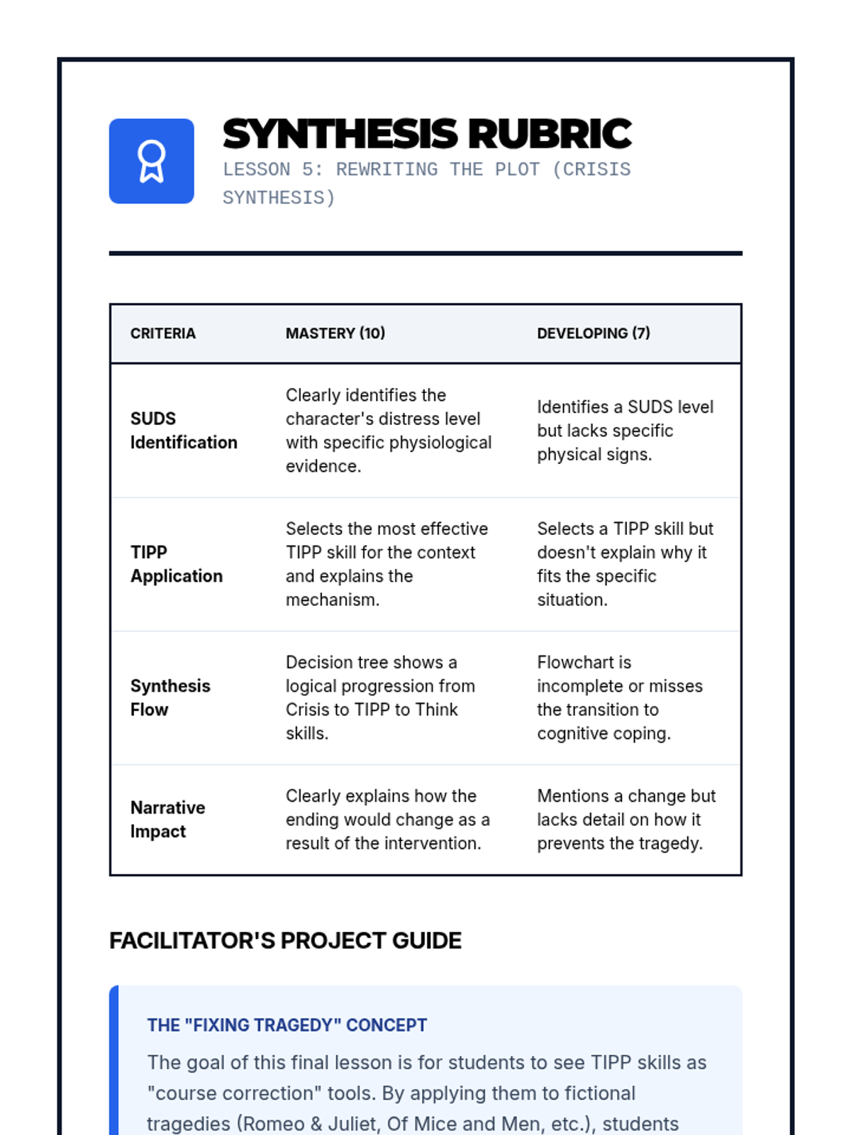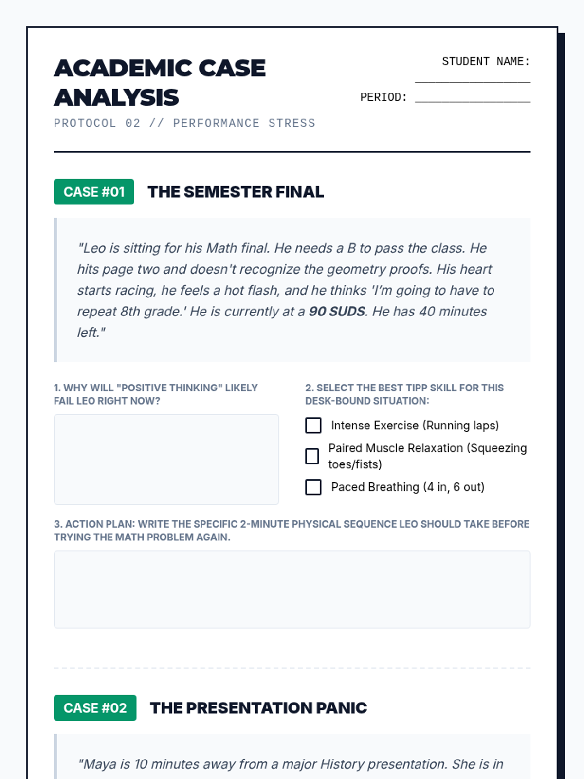 A comprehensive sequence designed for 8th-grade students to master the TIPP crisis survival skills. Students move from understanding physiological distress levels (SUDS) to analyzing complex academic and social scenarios, ultimately creating decision-making tools to manage high-arousal emotional states effectively.