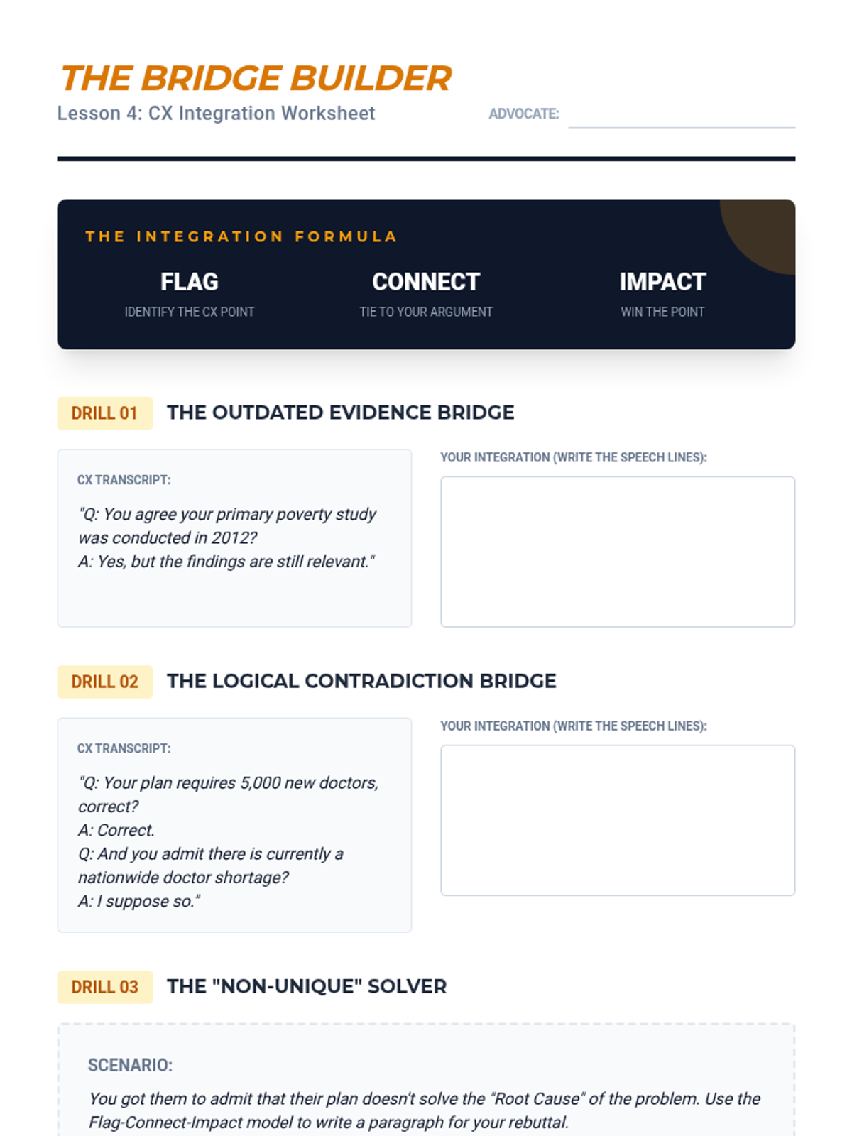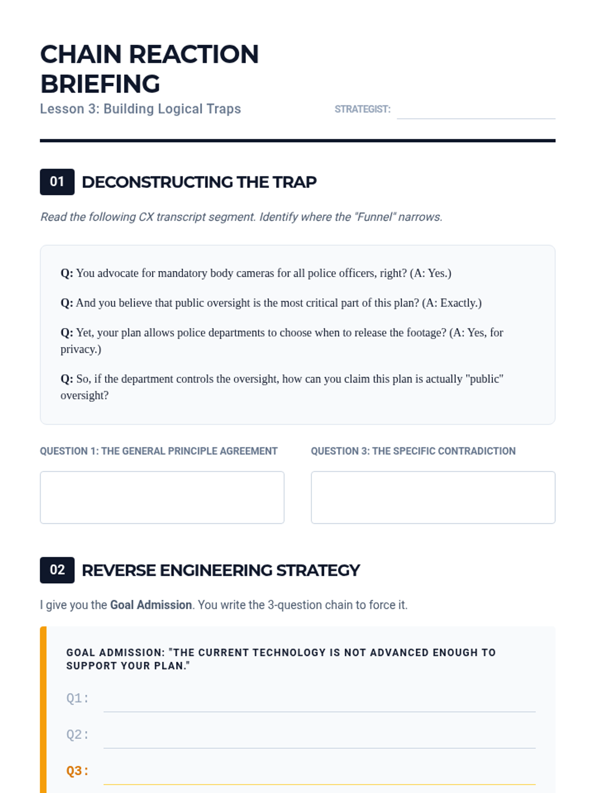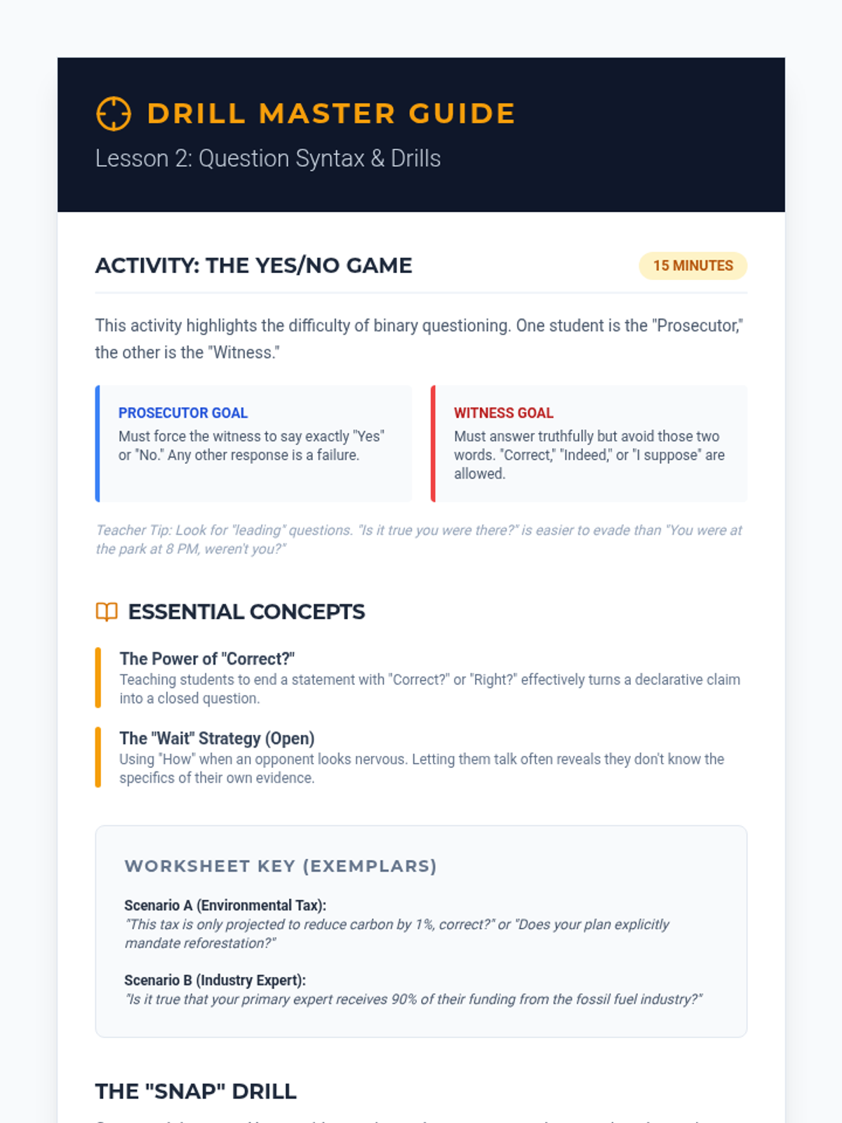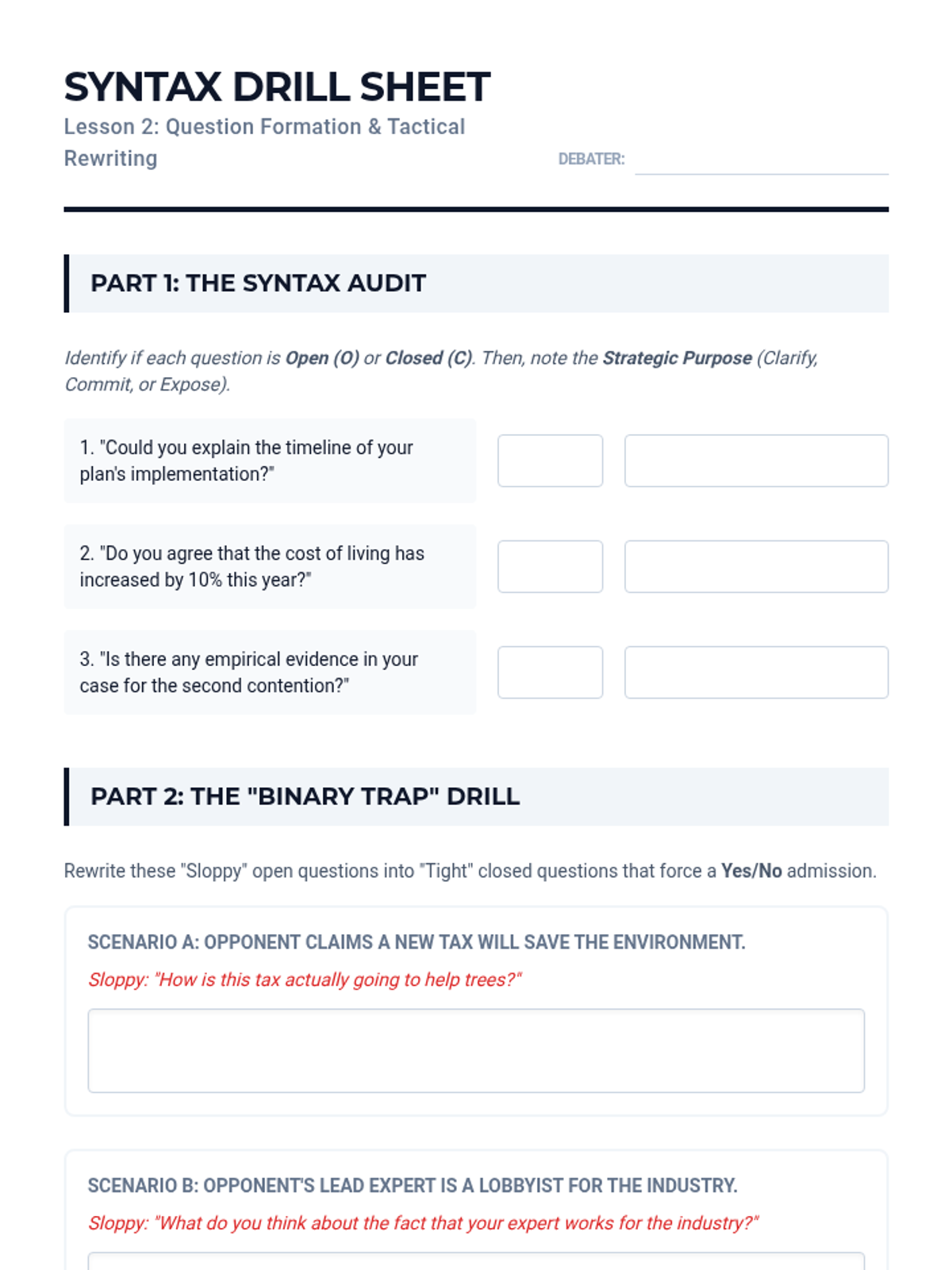 A comprehensive sequence for undergraduate students on the strategic use of cross-examination in competitive debate. This unit moves from foundational etiquette and question syntax to complex logical traps and the integration of concessions into rebuttals.