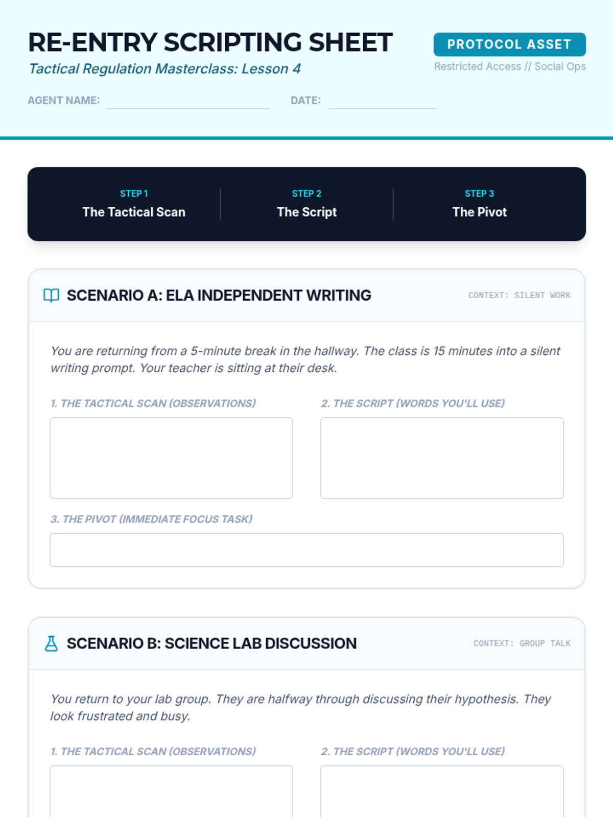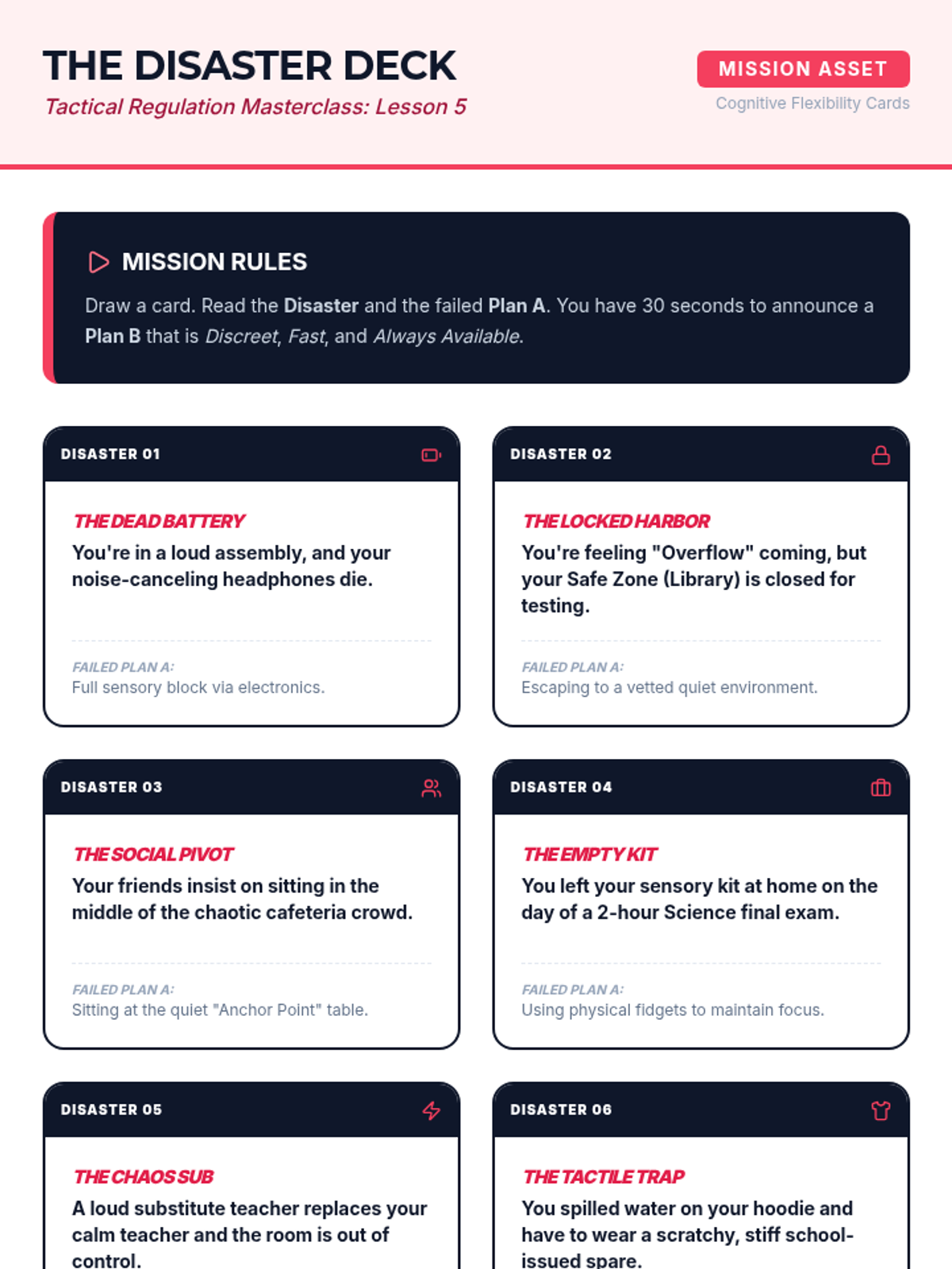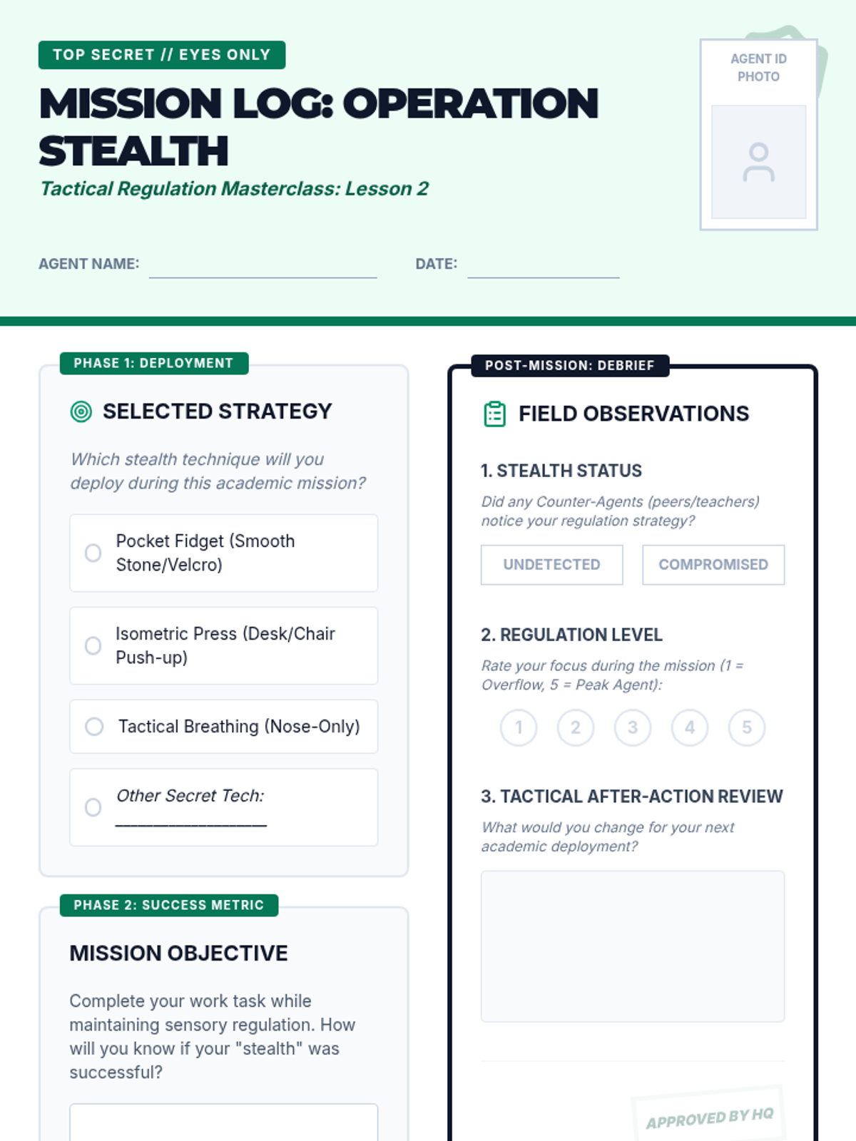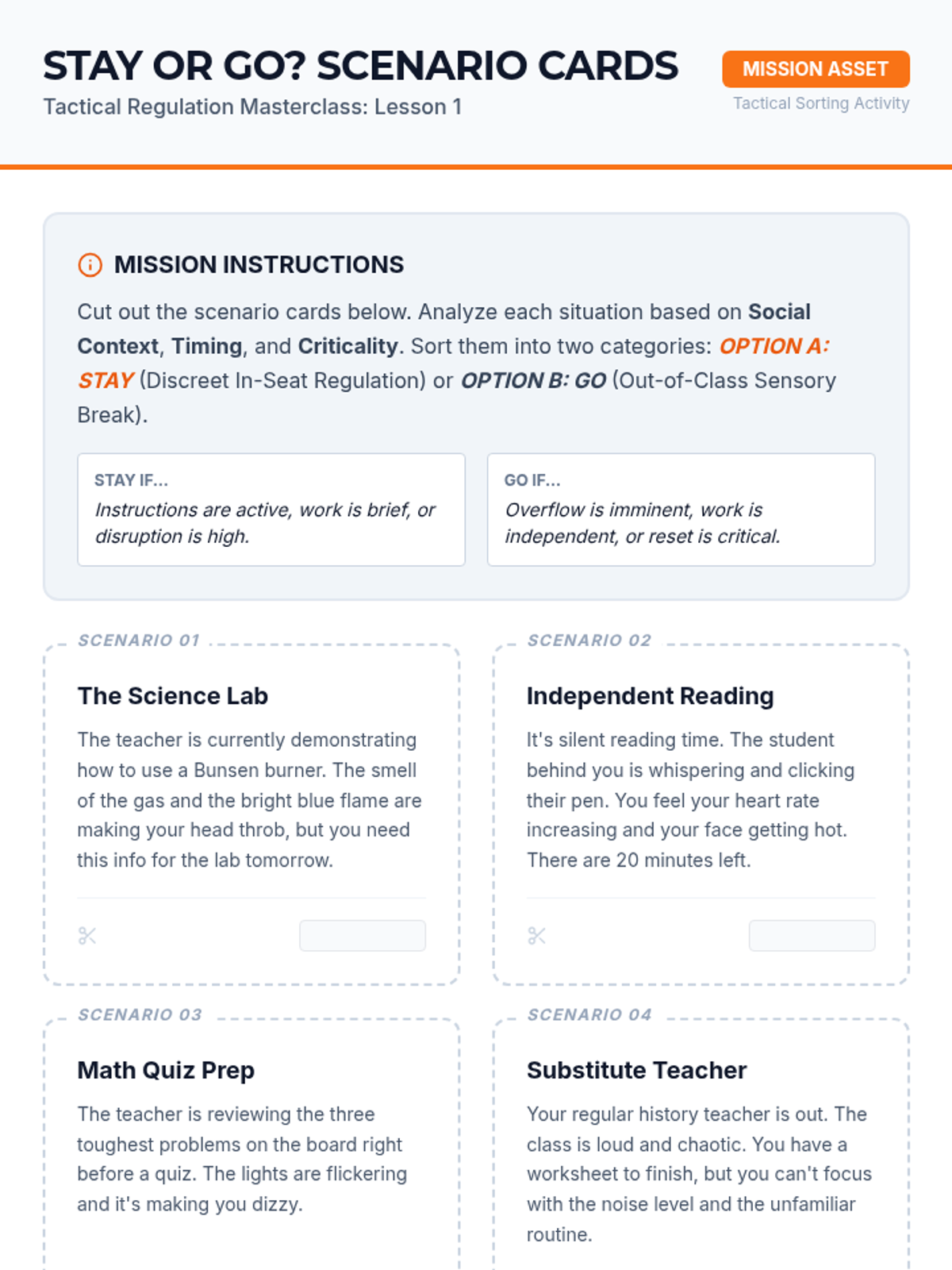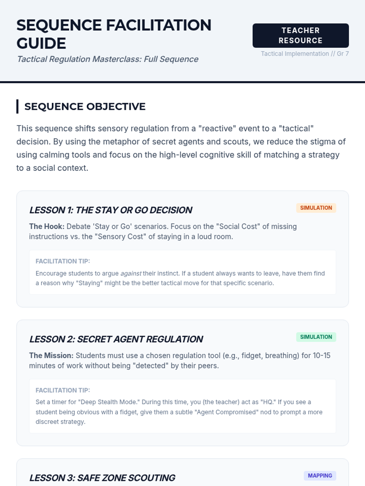 This 5-lesson sequence for 7th-grade students focuses on the tactical application of sensory regulation strategies. Students learn to analyze their environment, choose appropriate 'Stay' or 'Go' interventions, and master the social nuances of self-regulation in academic and unstructured school settings.