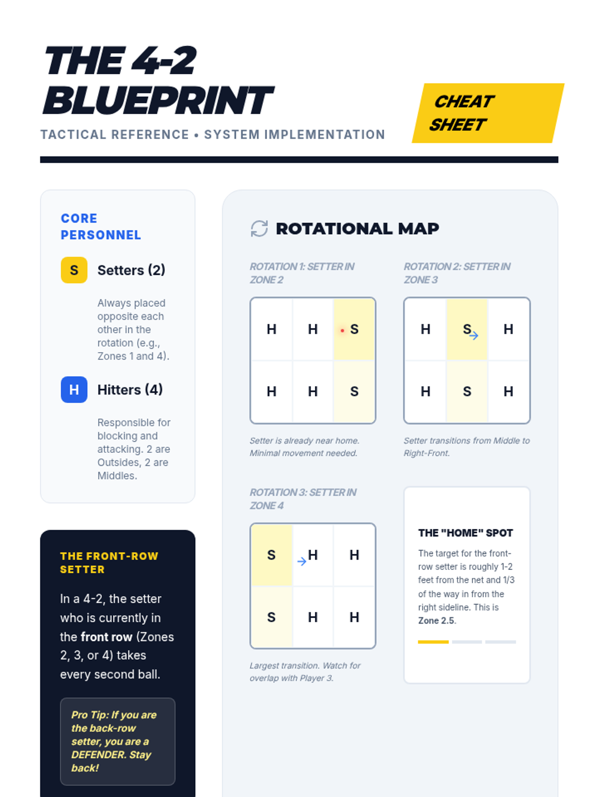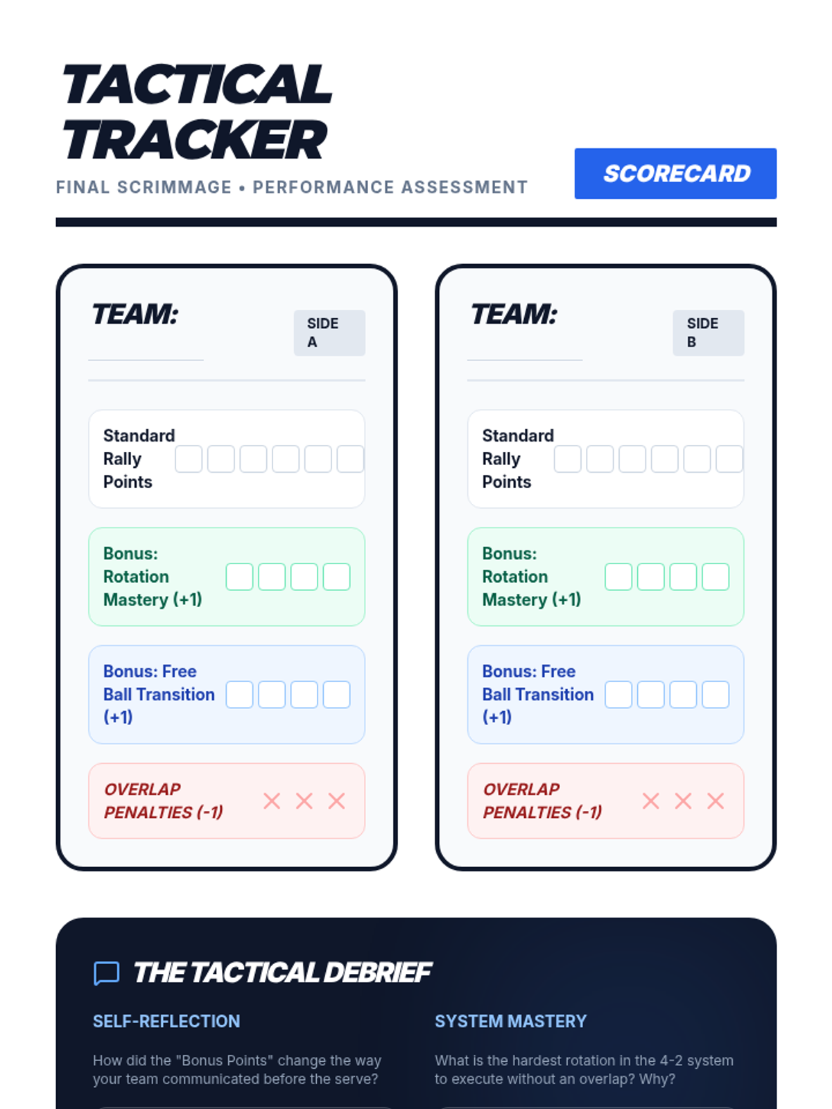 A comprehensive volleyball unit for 10th grade focusing on the 4-2 offensive system, rotational rules, and team communication. Students progress from theoretical court positioning to high-speed transition play and tactical scrimmages.