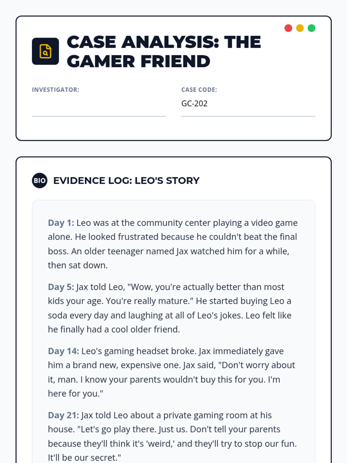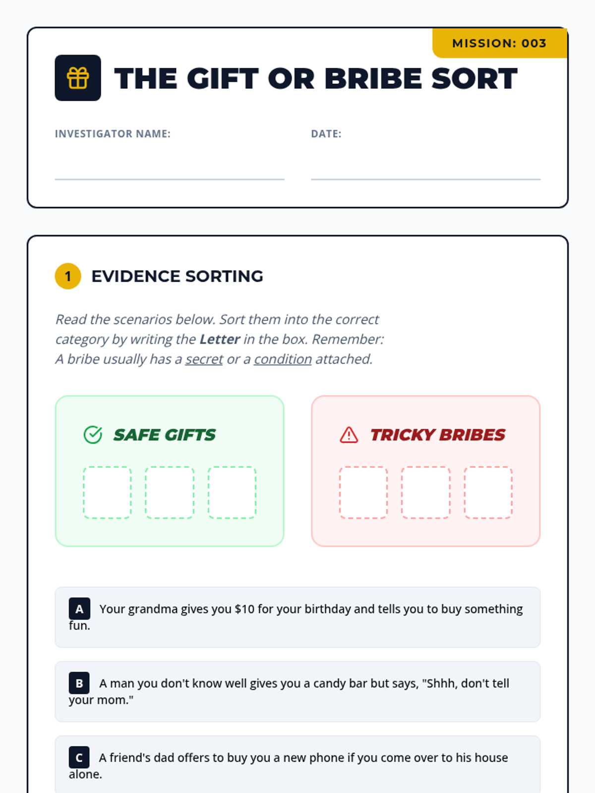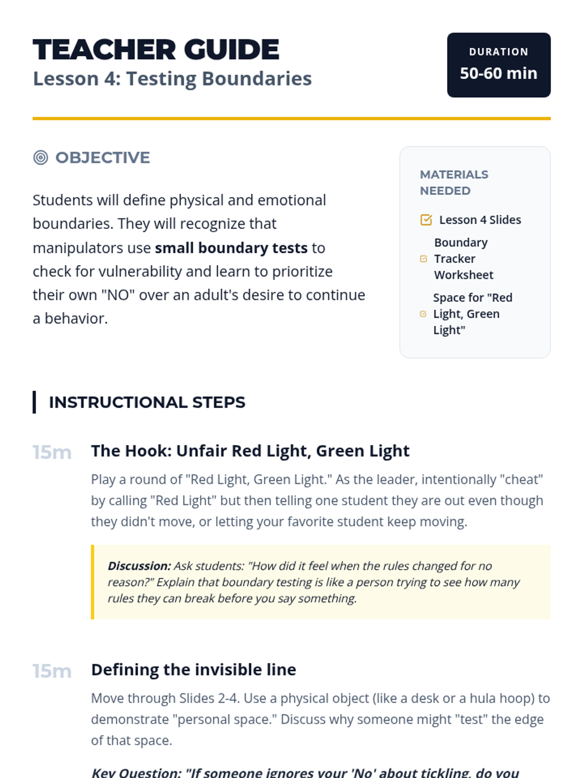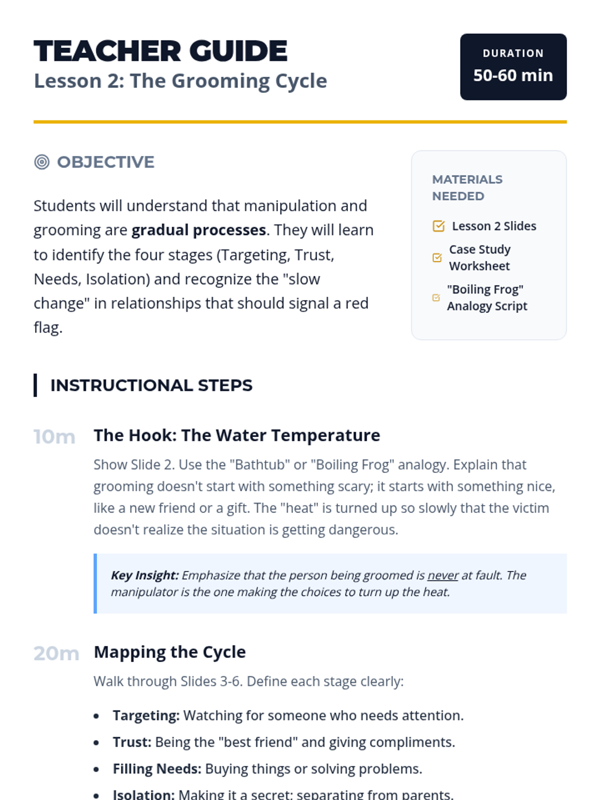 A 5-lesson sequence for 5th-grade students focused on identifying manipulative behaviors and recruitment tactics. Students learn to look past appearances, recognize the grooming cycle, understand the difference between gifts and bribes, and practice setting boundaries and exiting unsafe situations.