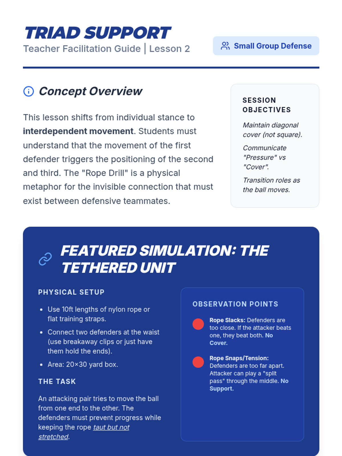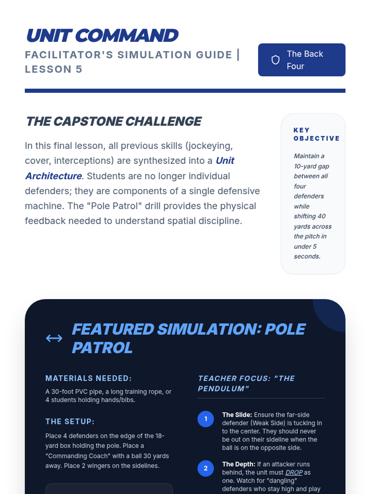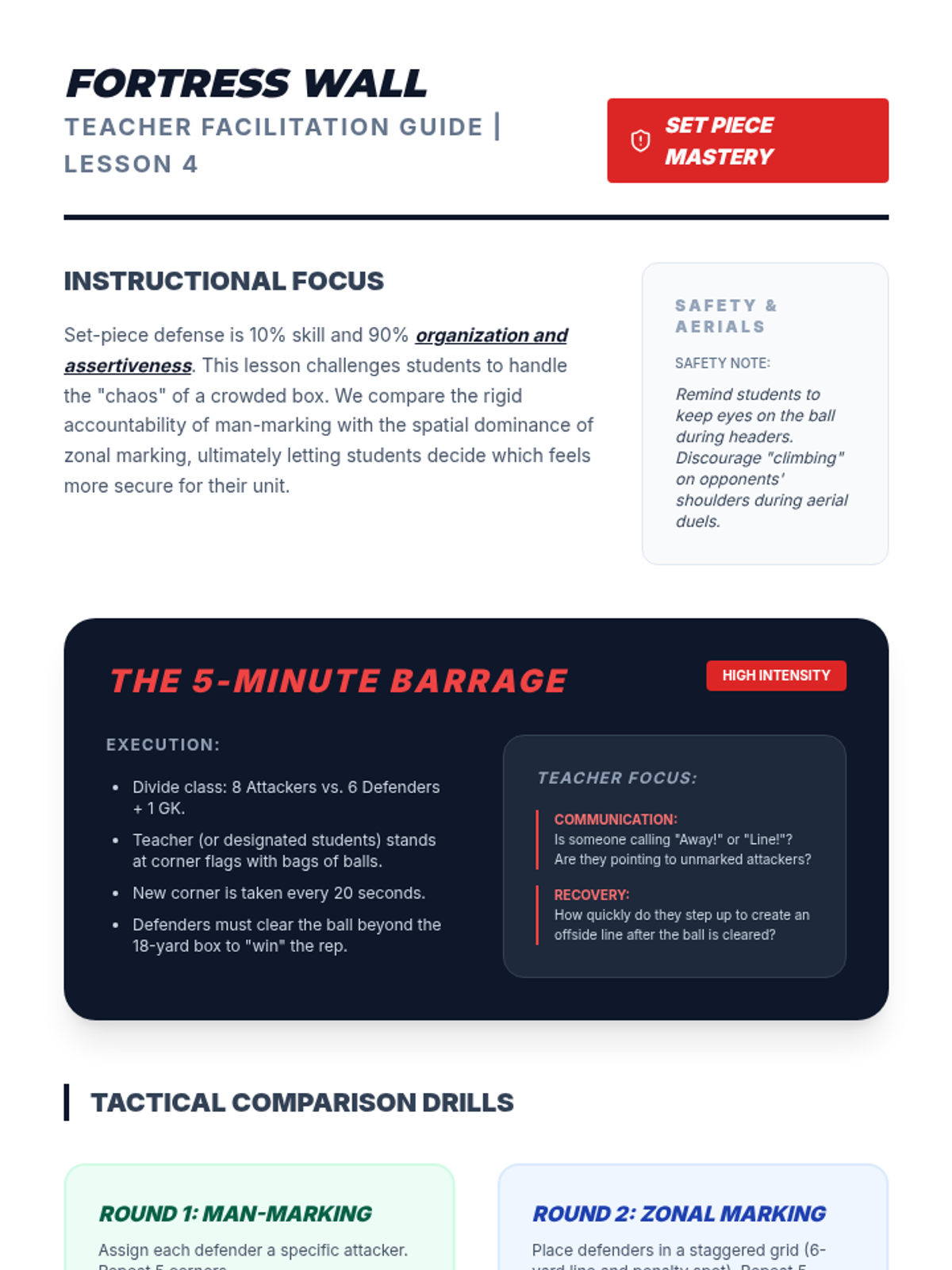 This 10th-grade Physical Education sequence focuses on the tactical and technical aspects of defensive play in football (soccer). Students progress from individual defending techniques to small-group coordination and full-unit tactical organization.