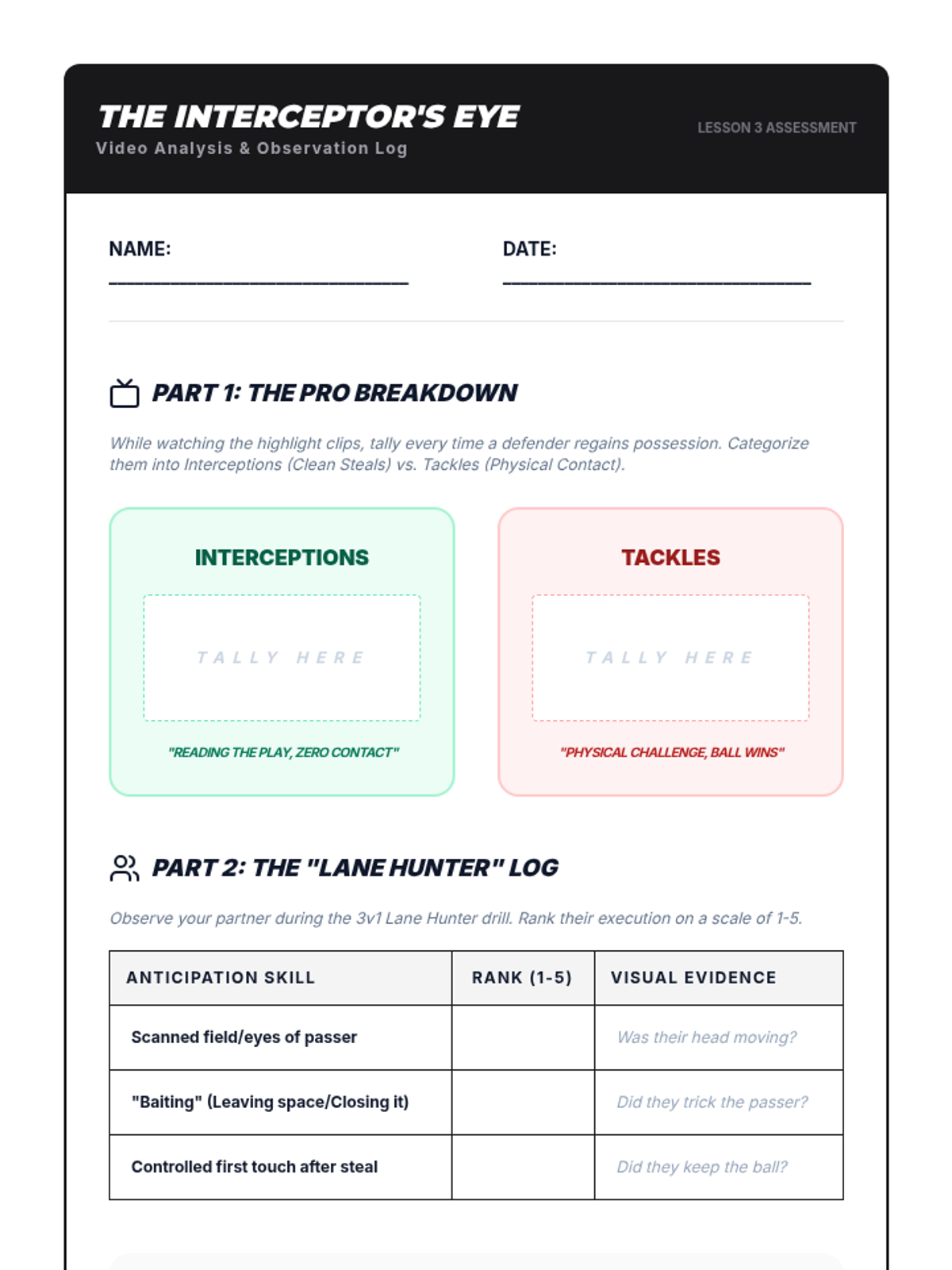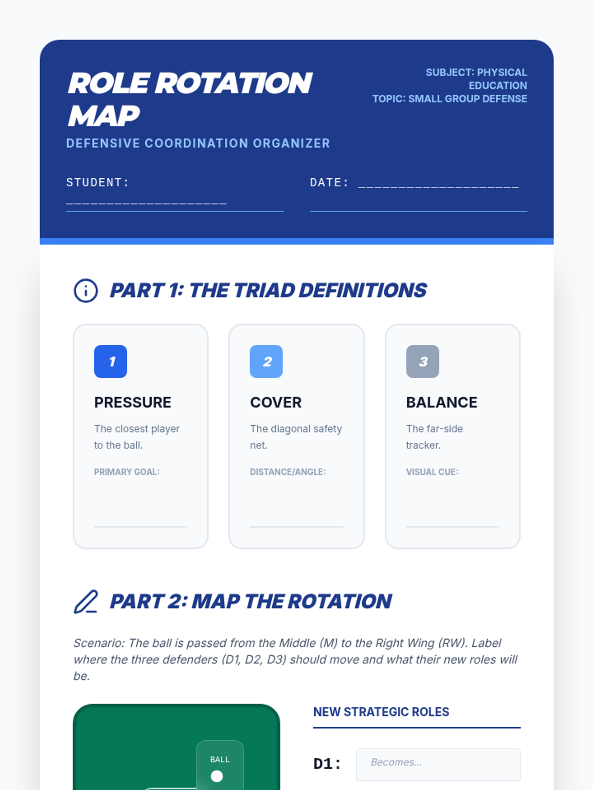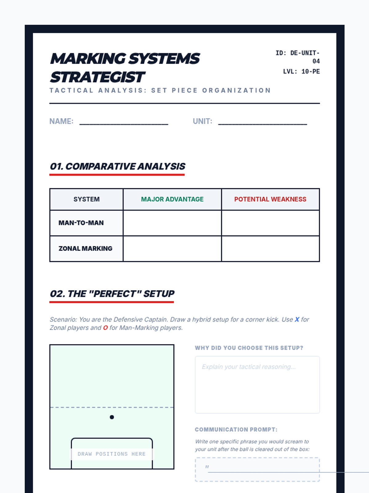 This 10th-grade Physical Education sequence focuses on the tactical and technical aspects of defensive play in football (soccer). Students progress from individual defending techniques to small-group coordination and full-unit tactical organization.