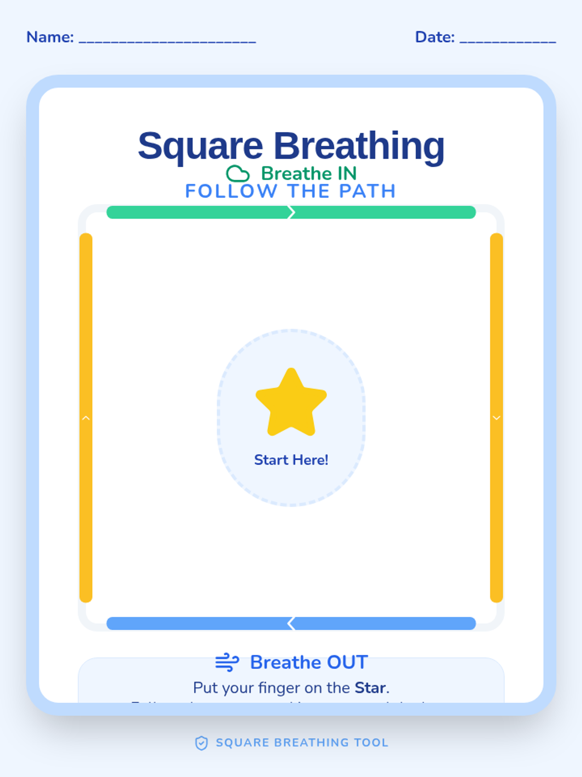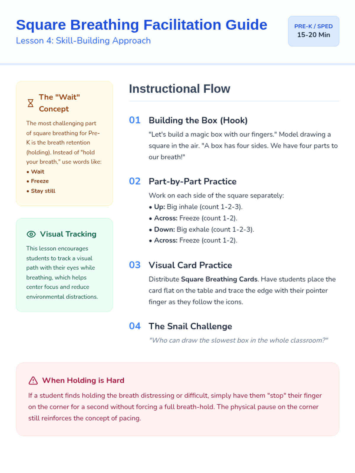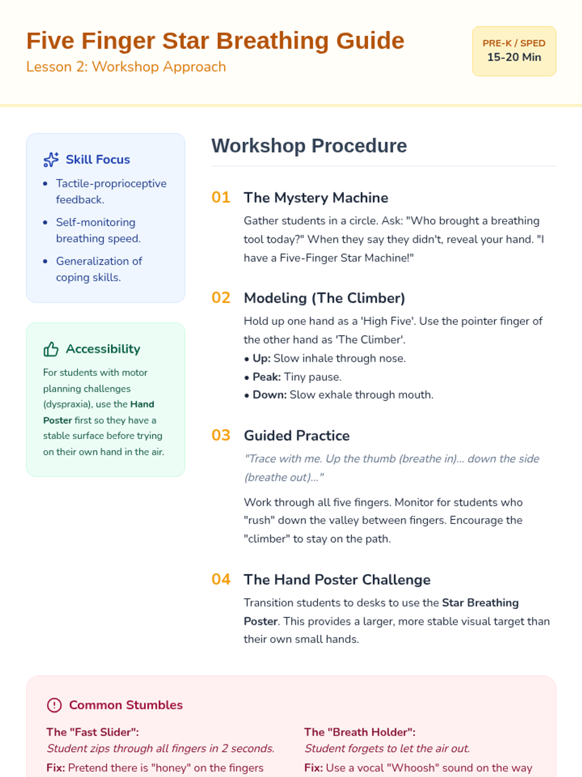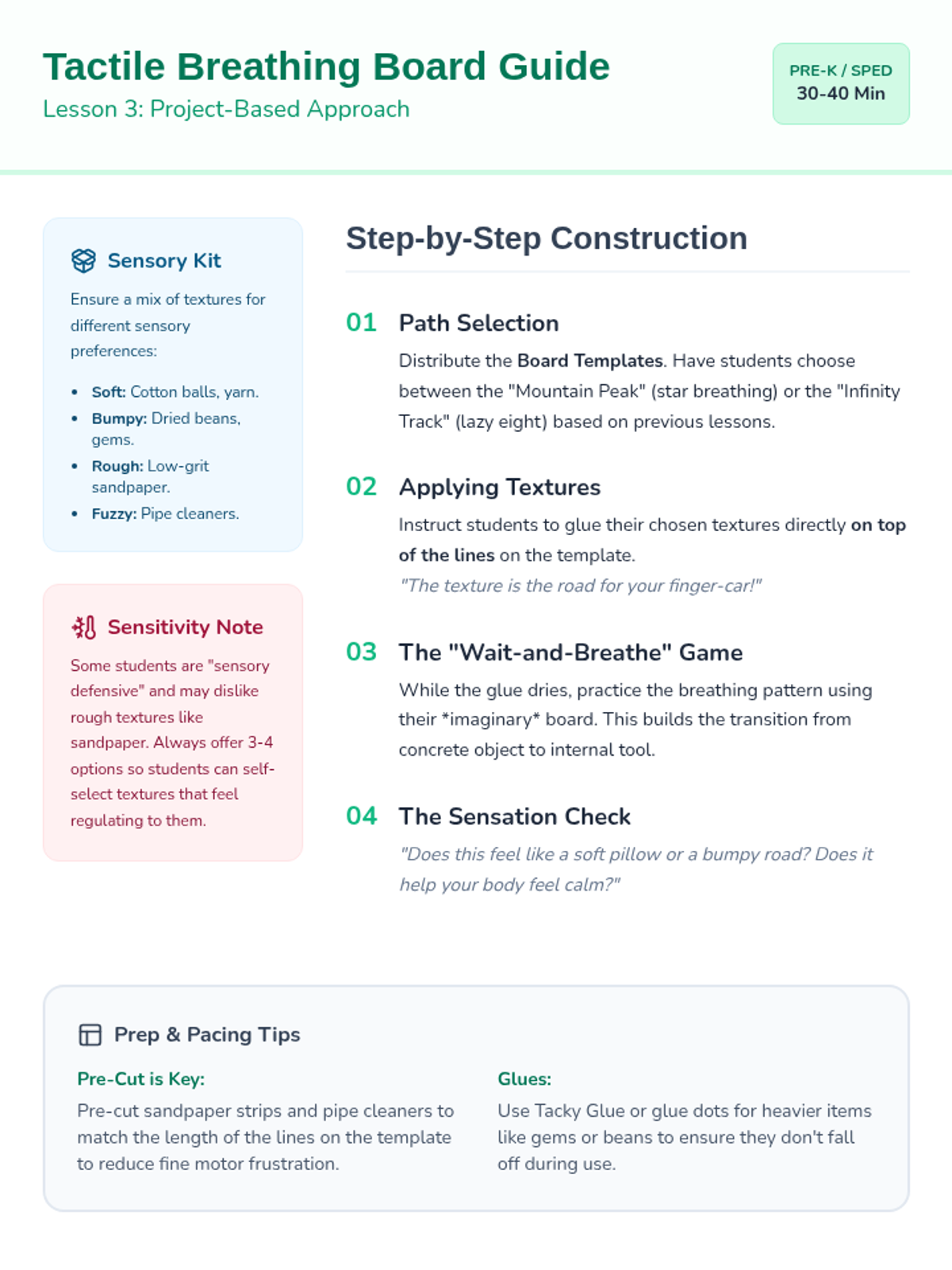 This sequence introduces Pre-K students to tactile and visual breathing strategies, helping them regulate their bodies through movement and sensory feedback. Students move from paper-based tracing to using their own hands and creating personalized sensory tools.