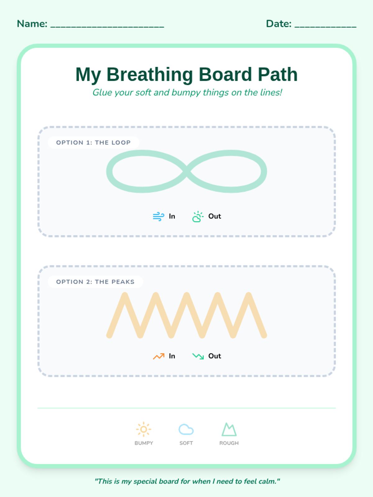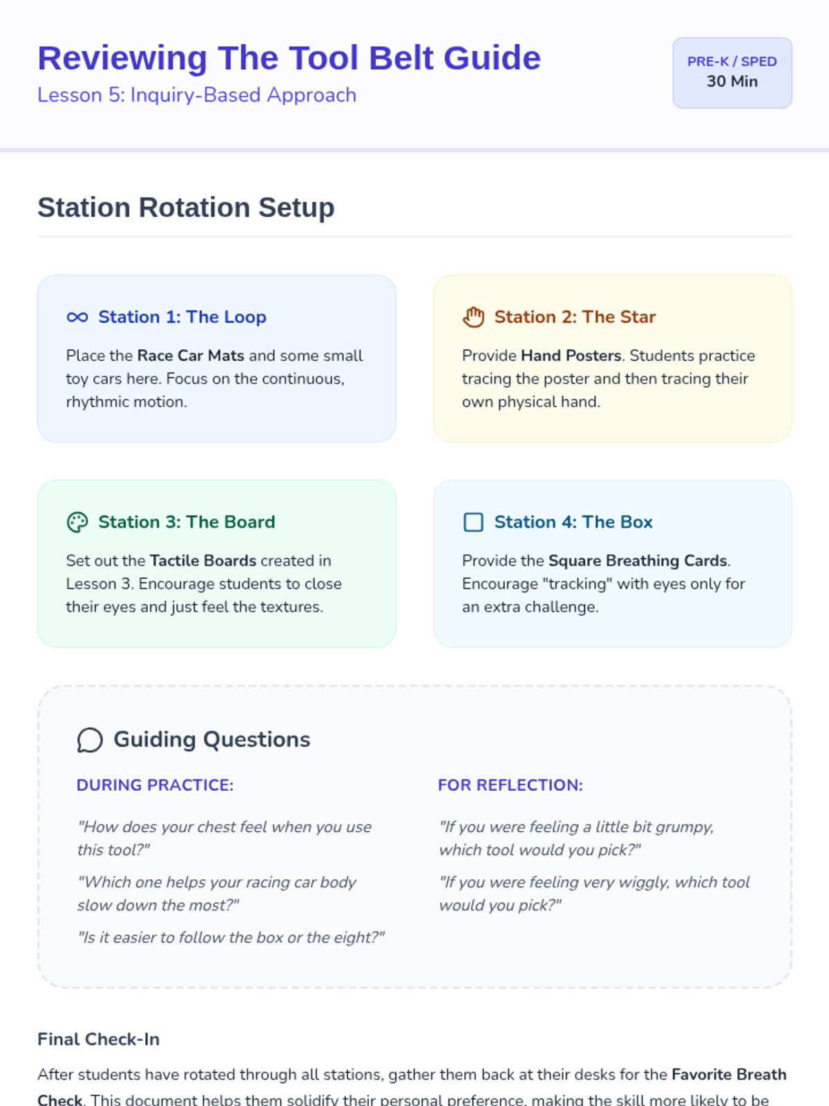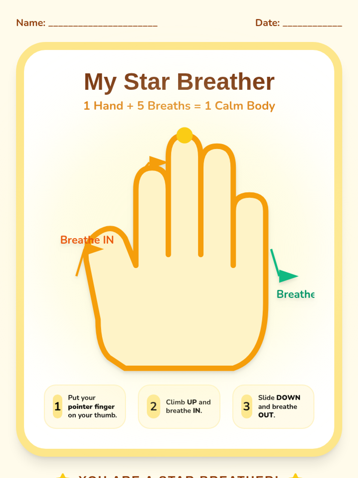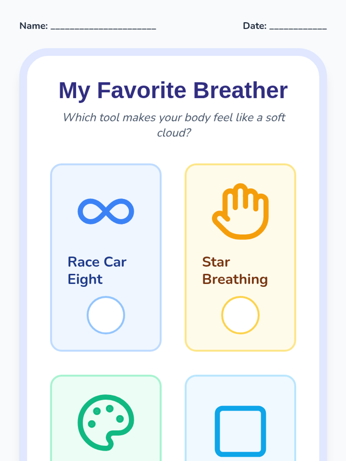 This sequence introduces Pre-K students to tactile and visual breathing strategies, helping them regulate their bodies through movement and sensory feedback. Students move from paper-based tracing to using their own hands and creating personalized sensory tools.