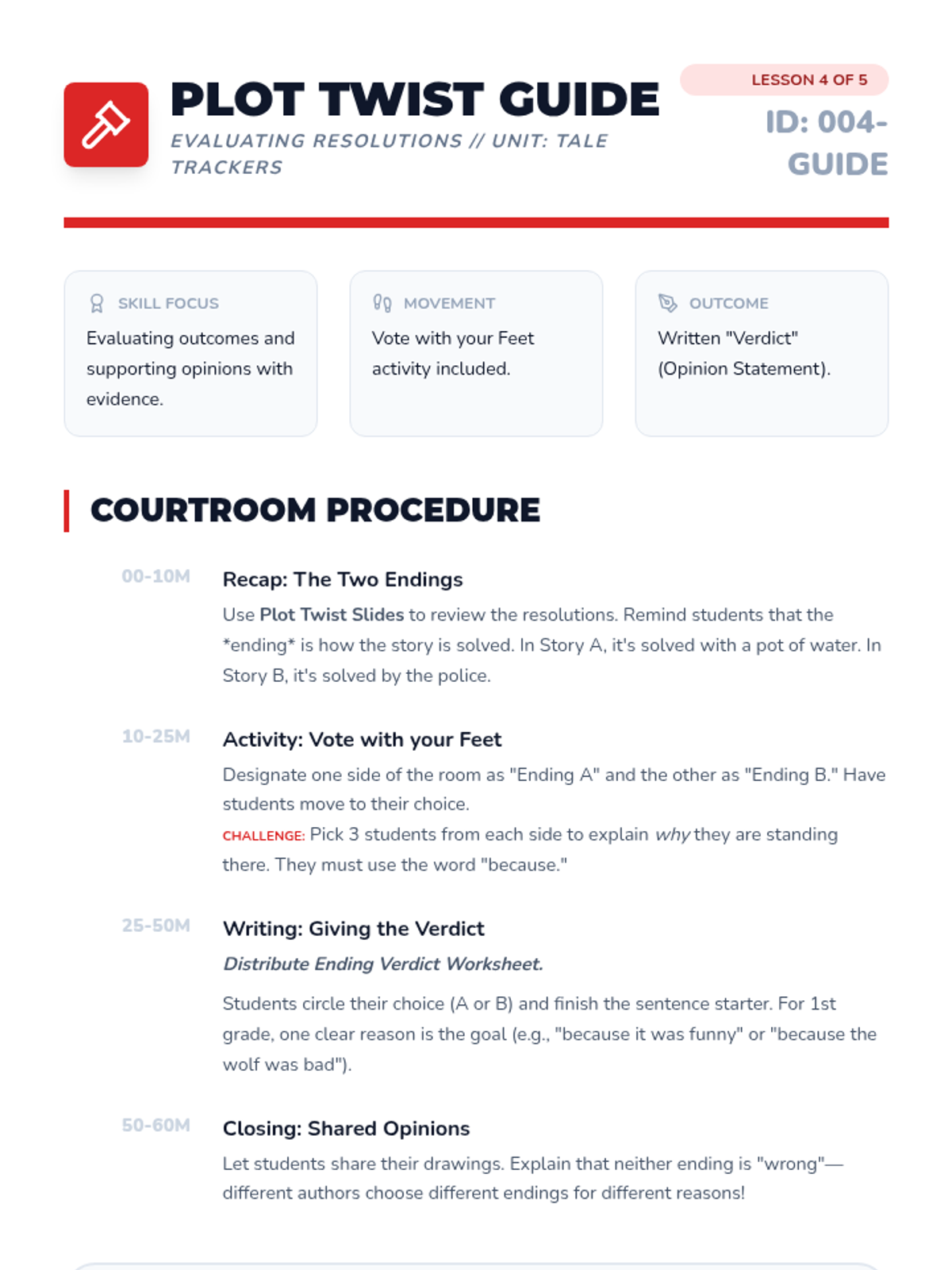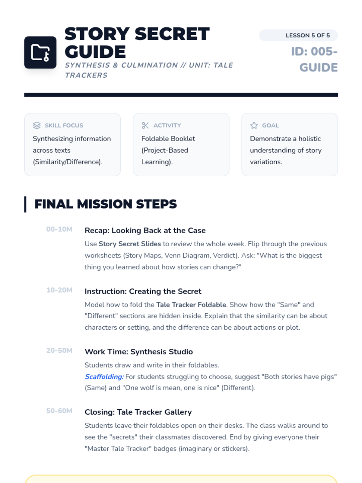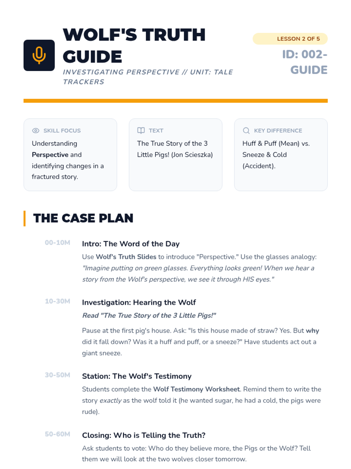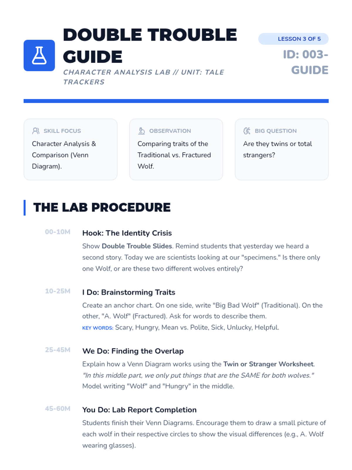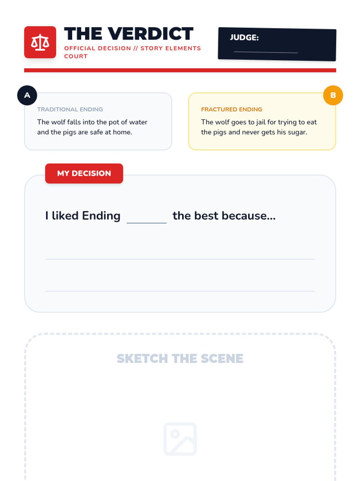 A 1st Grade Reading Comprehension sequence where students compare traditional and fractured versions of folktales to understand character perspective and plot variations.