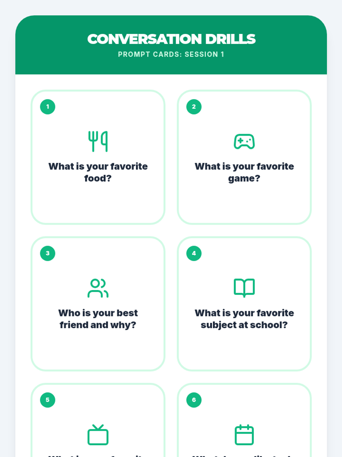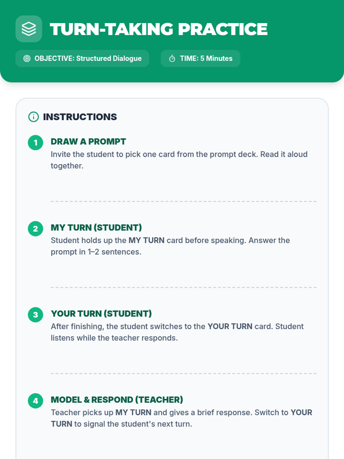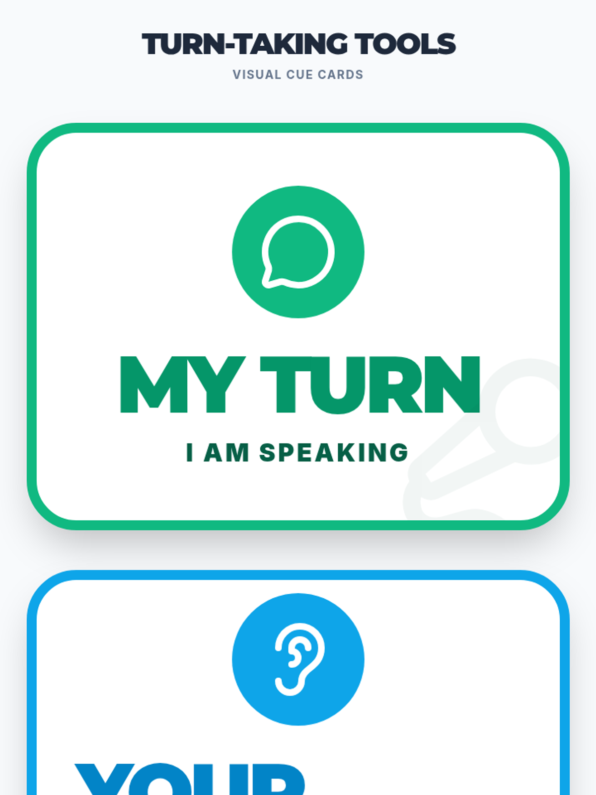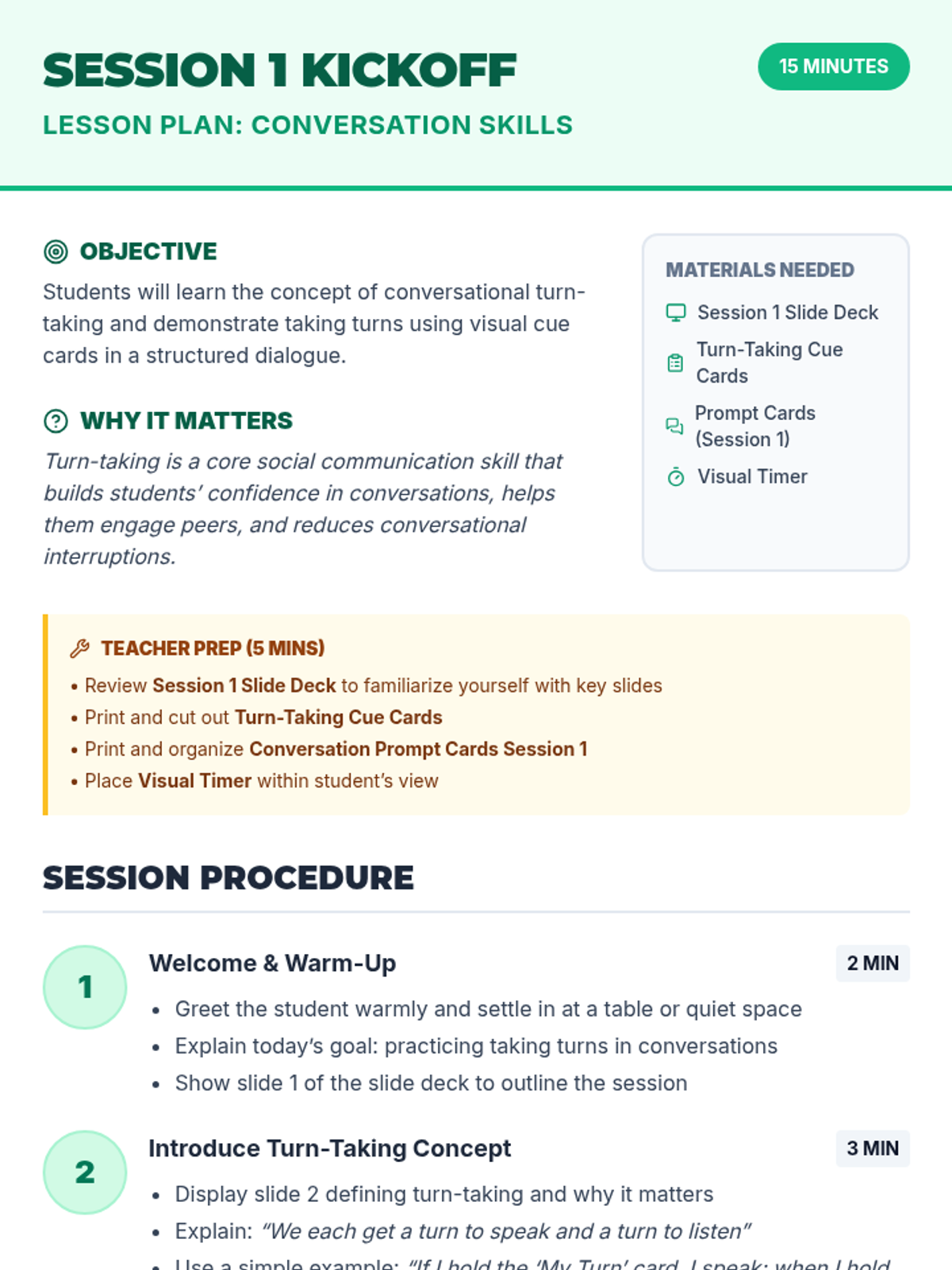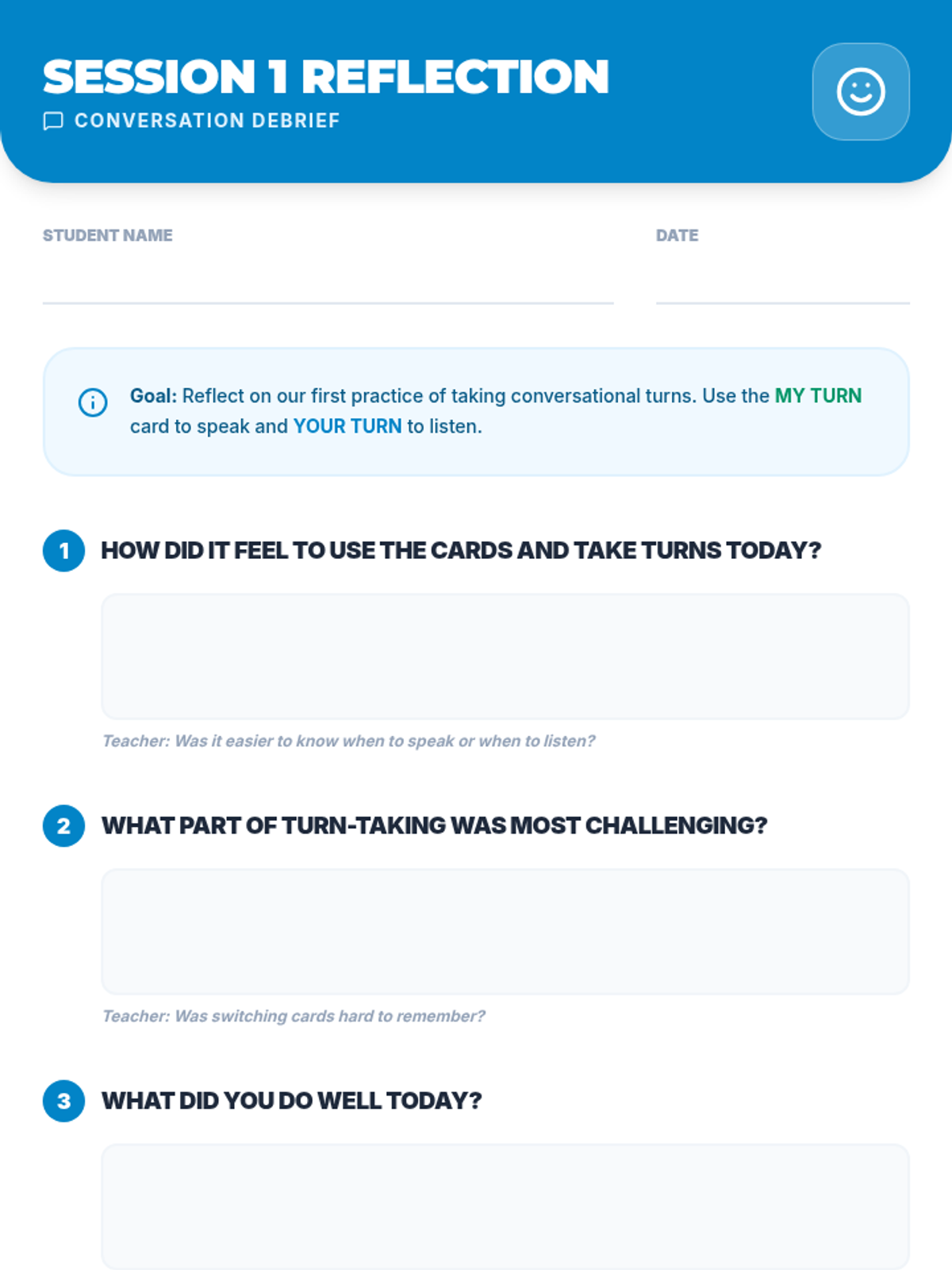 A three-session social skills program for 4th graders with Autism, focusing on conversational turn-taking through visual supports and guided practice. Each session builds on the previous one, moving from basic exchanges to using follow-up questions.