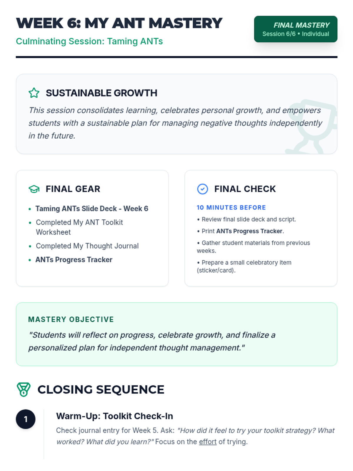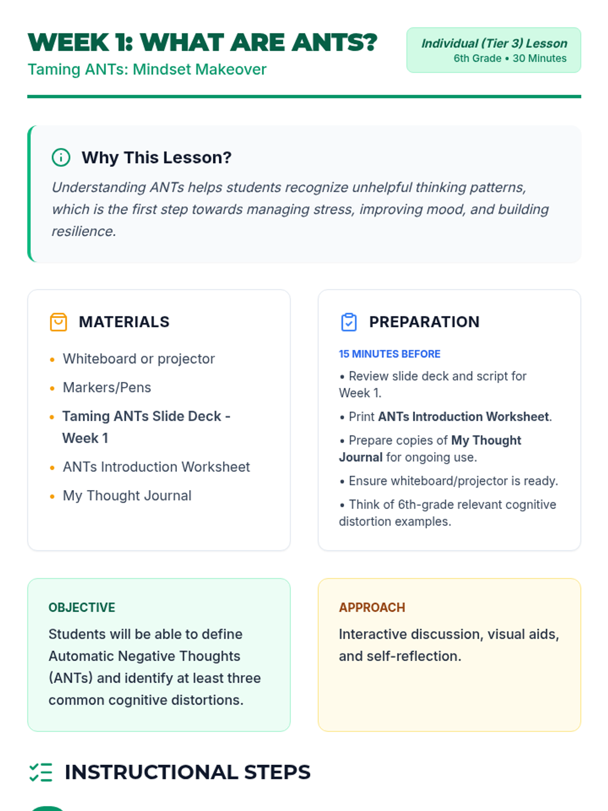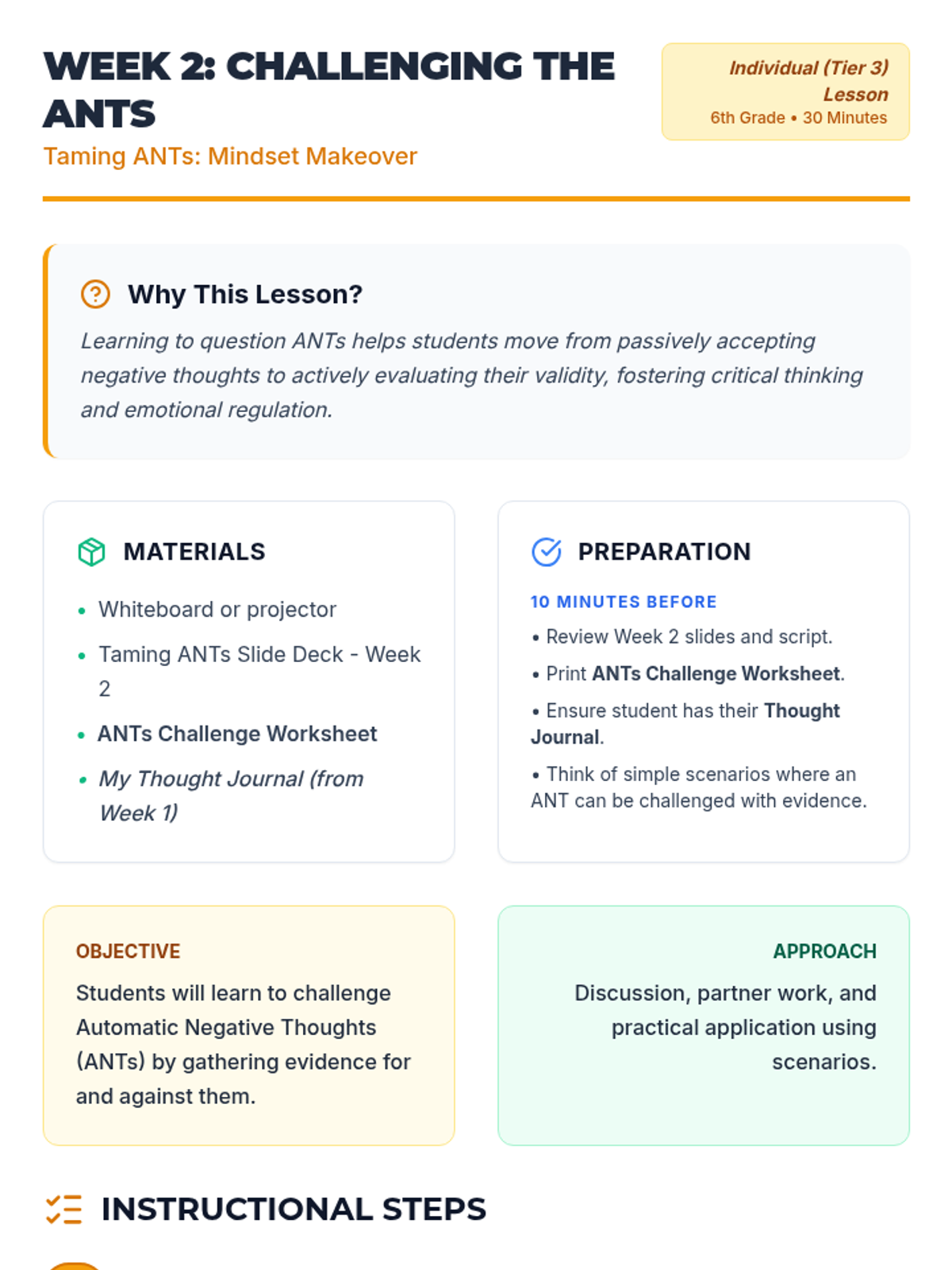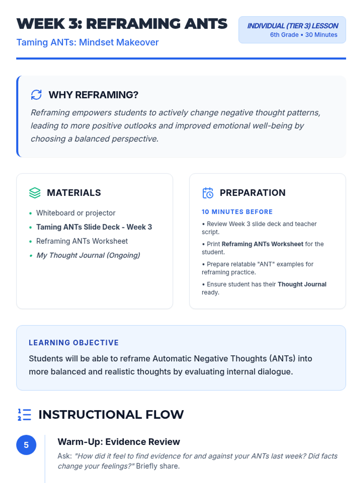 A six-week social-emotional learning curriculum for 6th-grade students focused on identifying, interrupting, and reframing Automatic Negative Thoughts (ANTs). This sequence empowers students to develop positive, realistic thinking patterns, fostering resilience and improved well-being through individual support sessions.