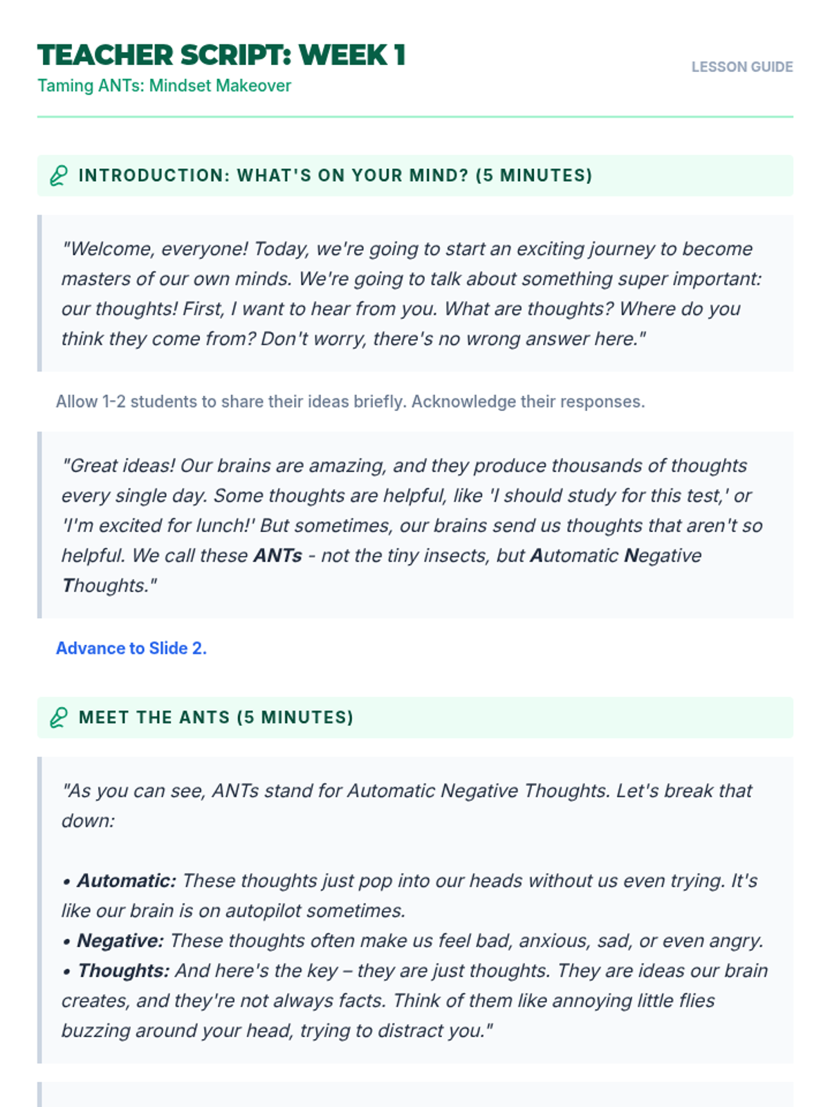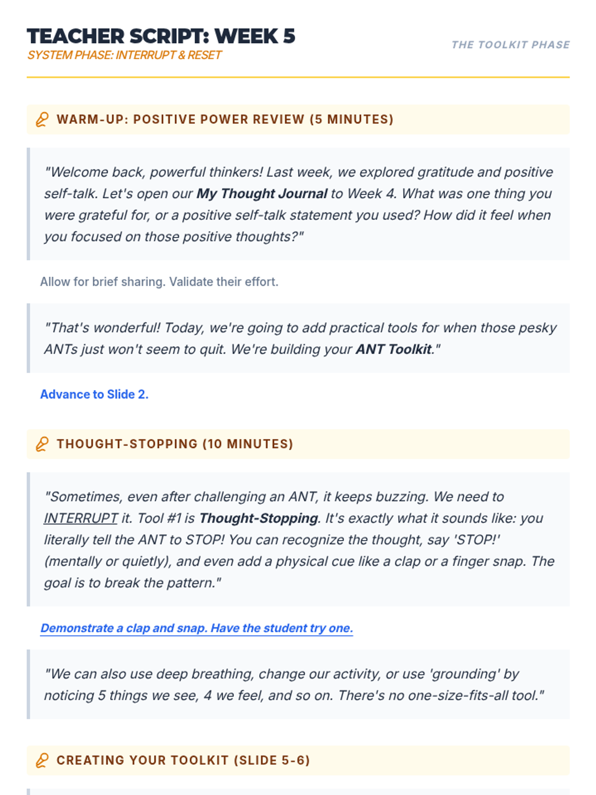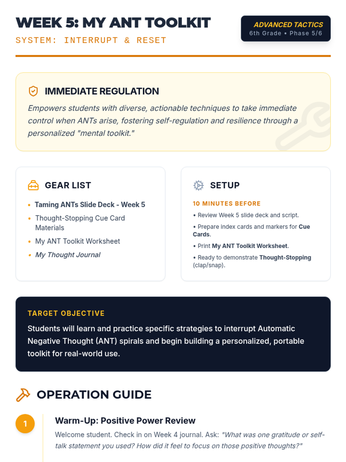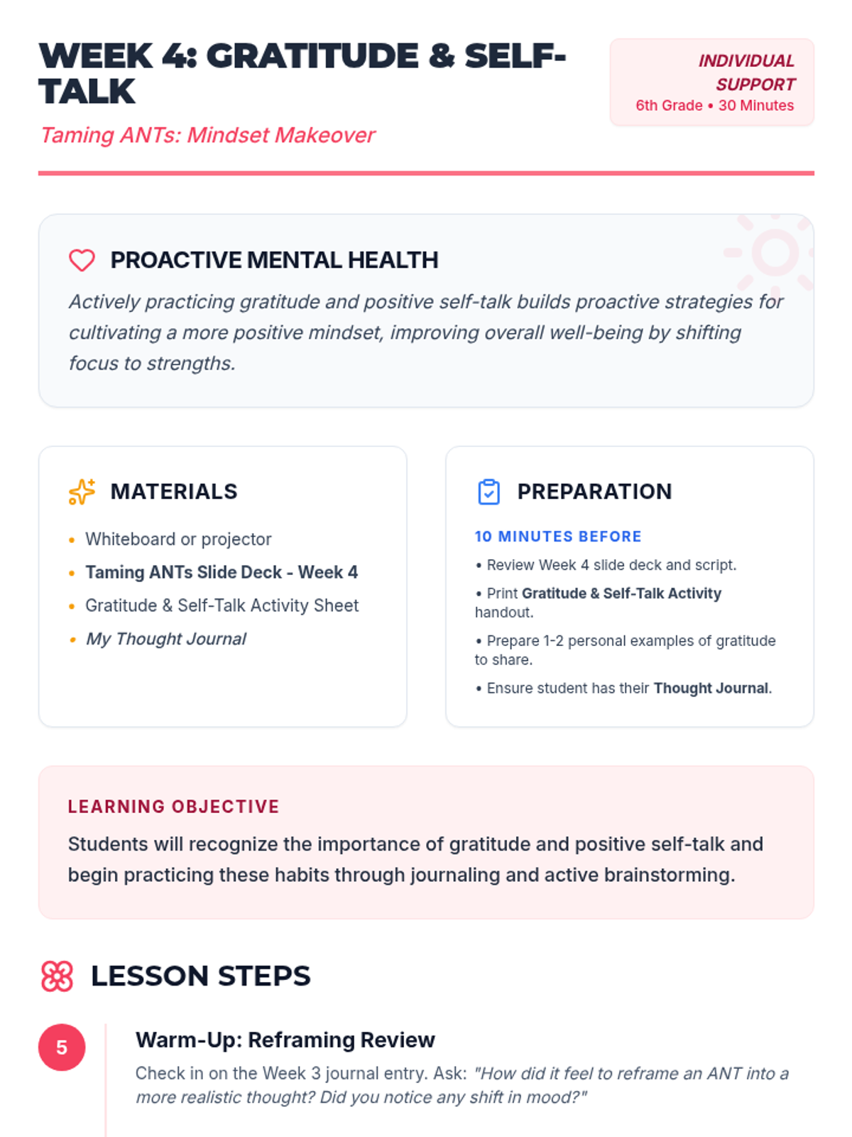 A six-week social-emotional learning curriculum for 6th-grade students focused on identifying, interrupting, and reframing Automatic Negative Thoughts (ANTs). This sequence empowers students to develop positive, realistic thinking patterns, fostering resilience and improved well-being through individual support sessions.