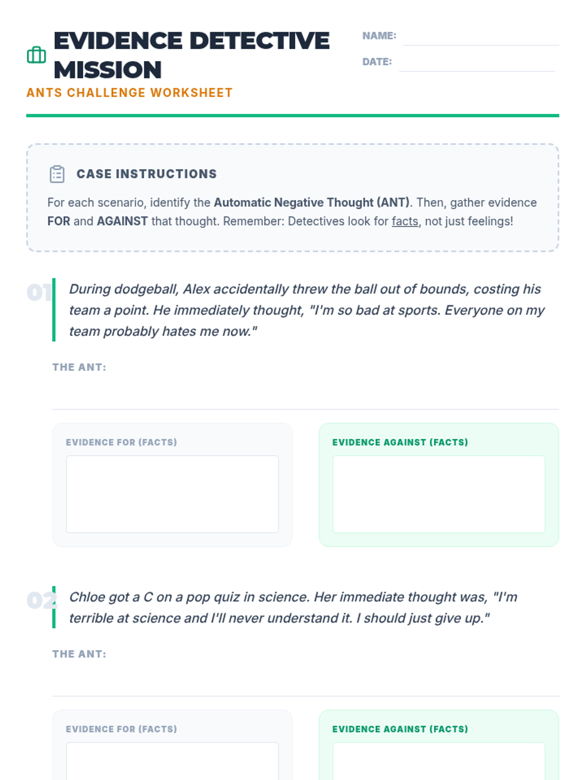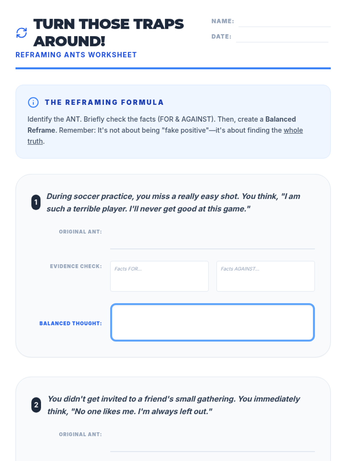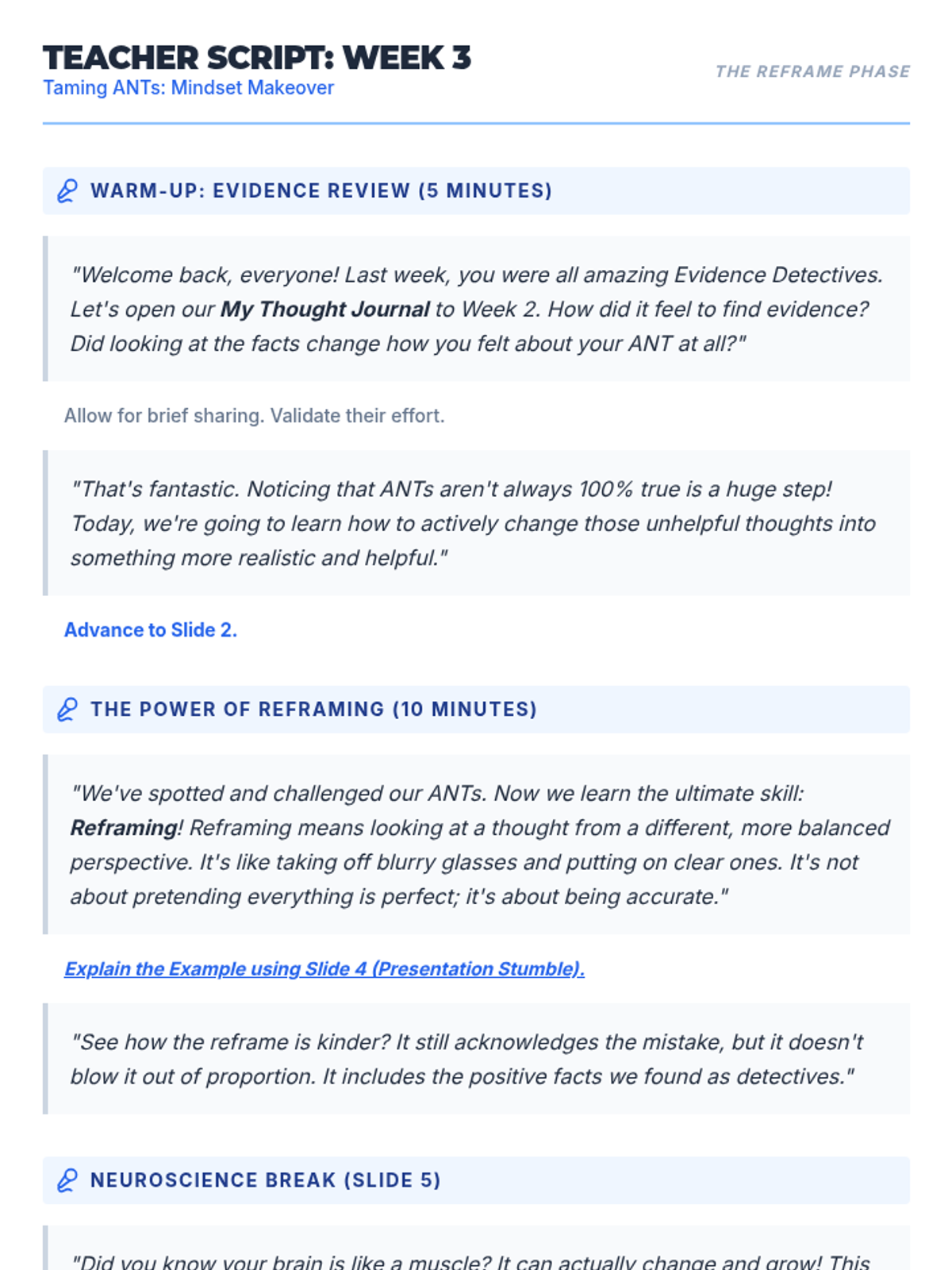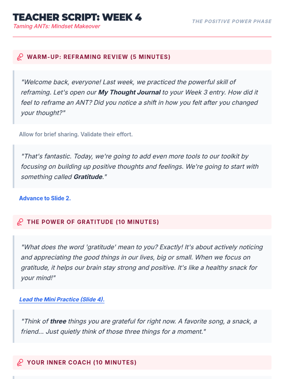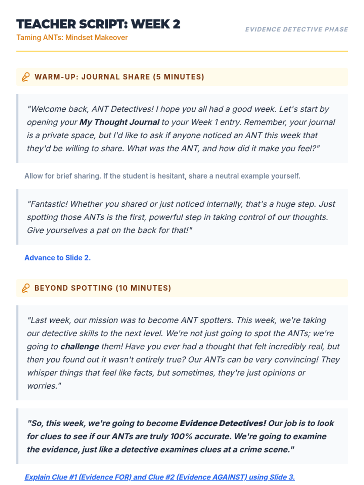 A six-week social-emotional learning curriculum for 6th-grade students focused on identifying, interrupting, and reframing Automatic Negative Thoughts (ANTs). This sequence empowers students to develop positive, realistic thinking patterns, fostering resilience and improved well-being through individual support sessions.