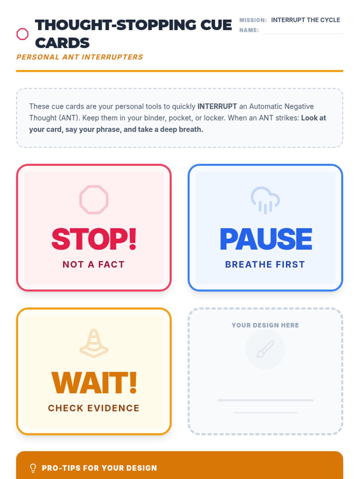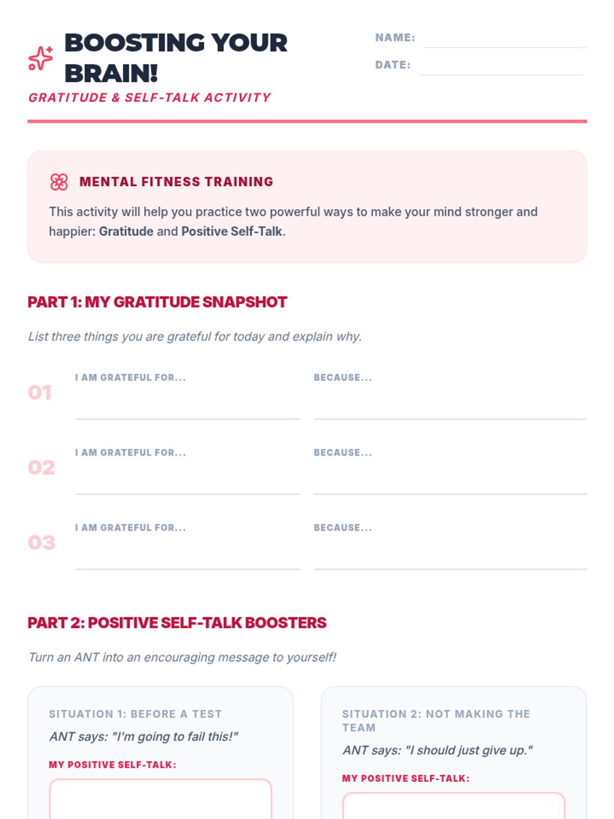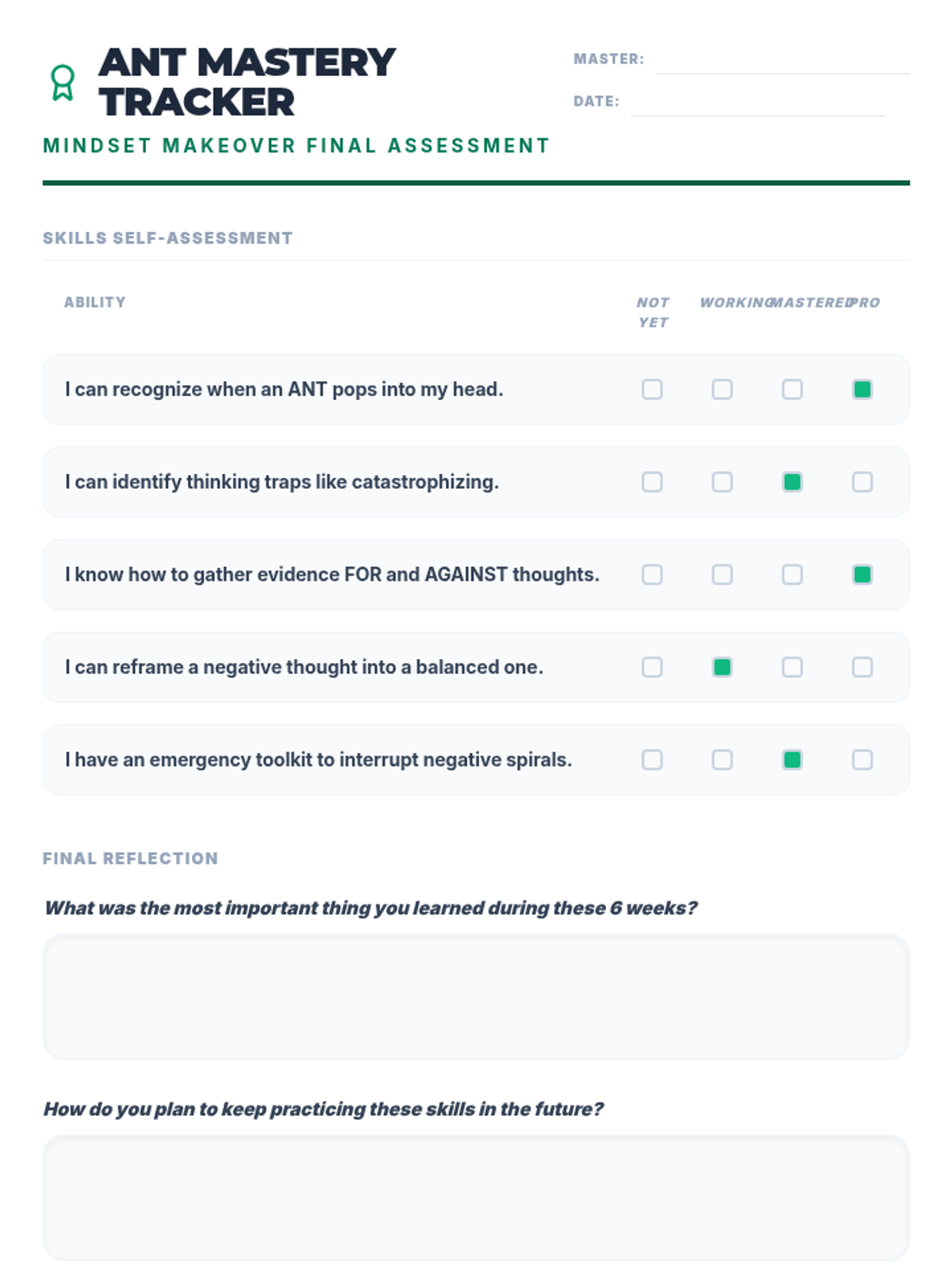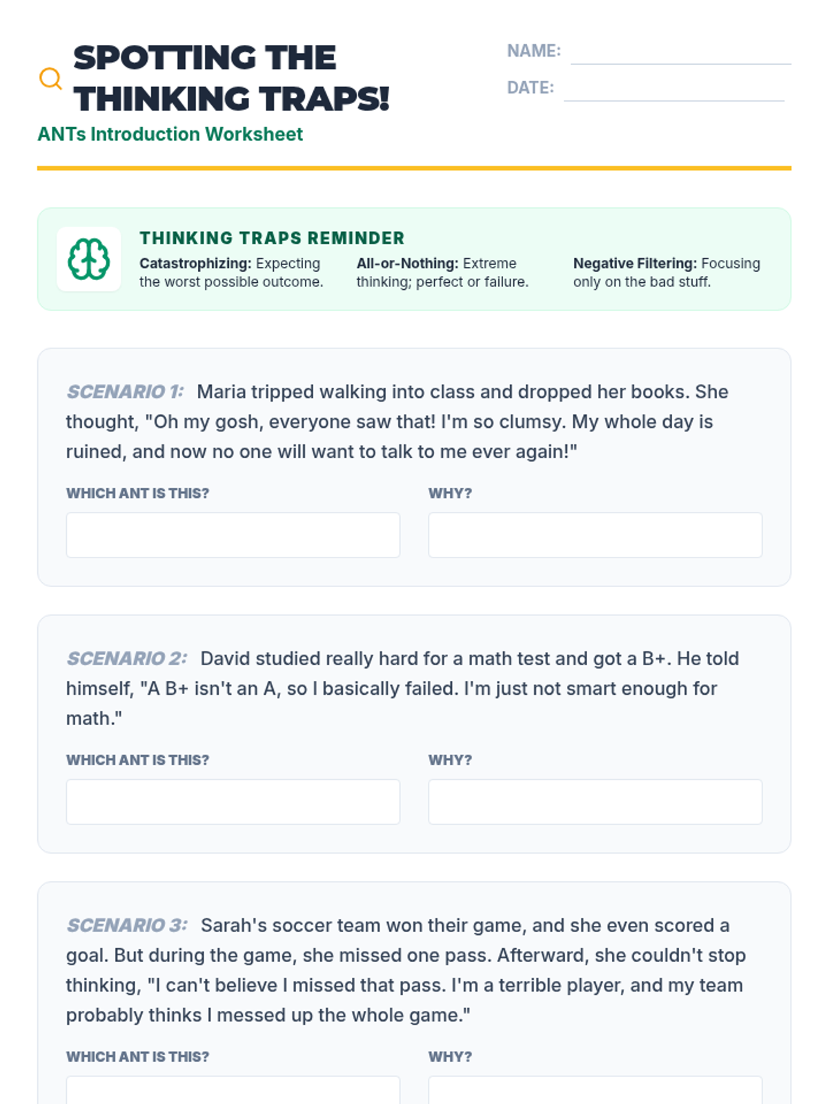 A six-week social-emotional learning curriculum for 6th-grade students focused on identifying, interrupting, and reframing Automatic Negative Thoughts (ANTs). This sequence empowers students to develop positive, realistic thinking patterns, fostering resilience and improved well-being through individual support sessions.