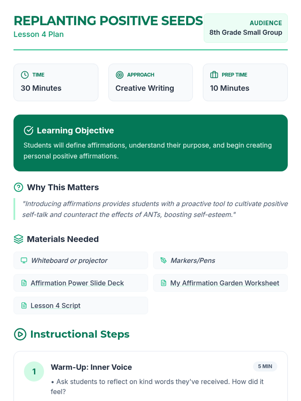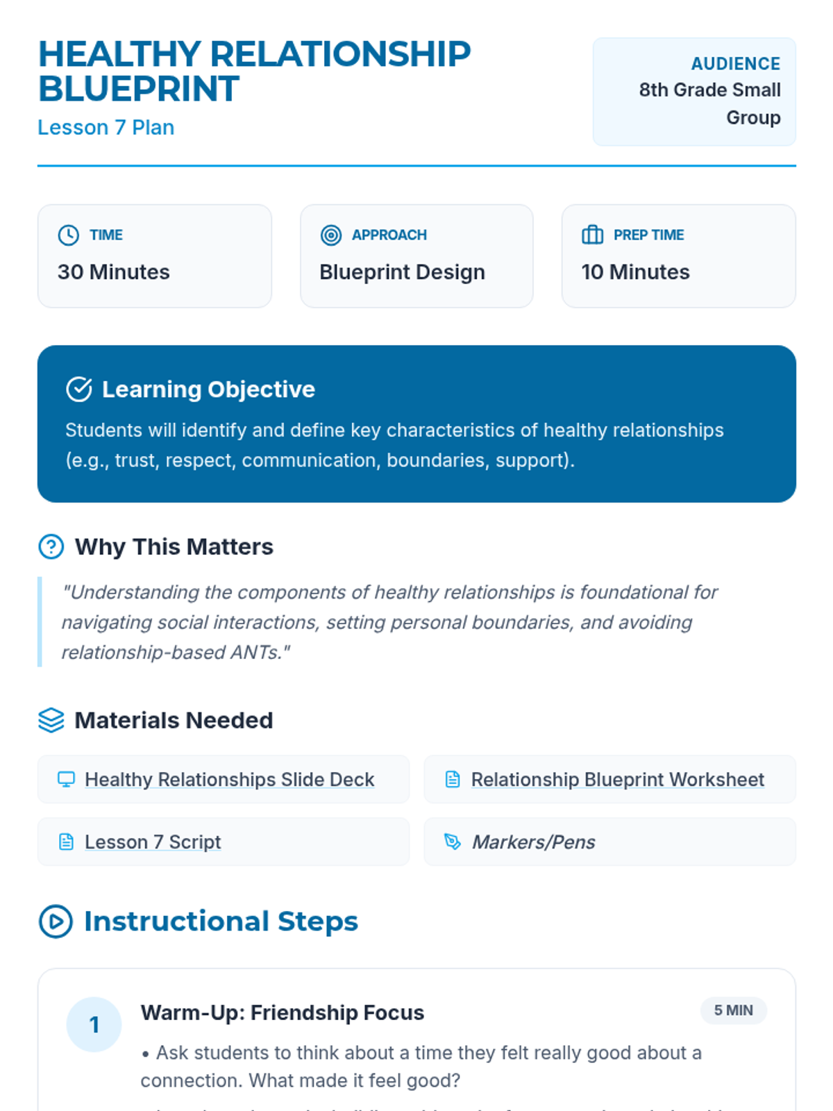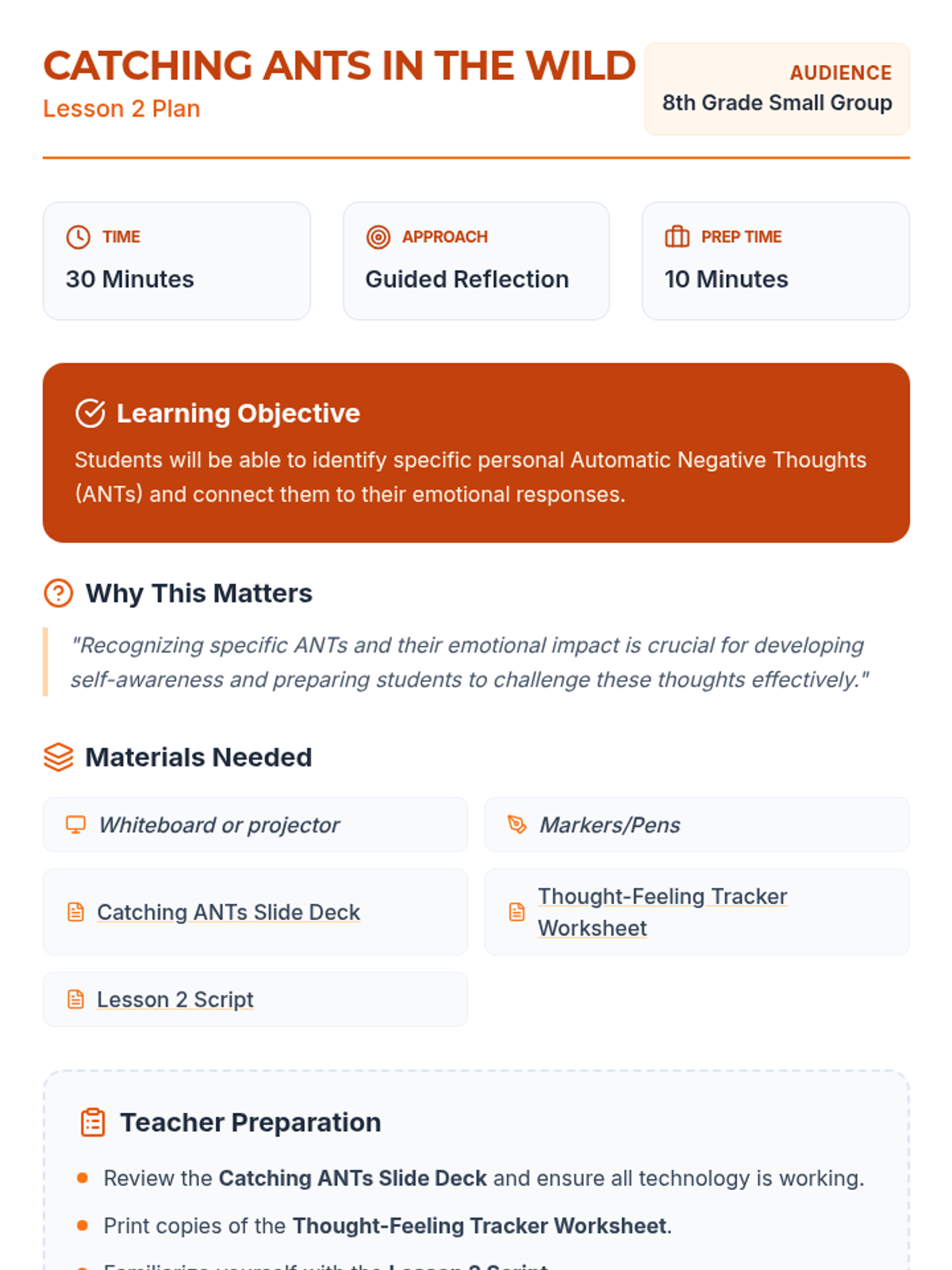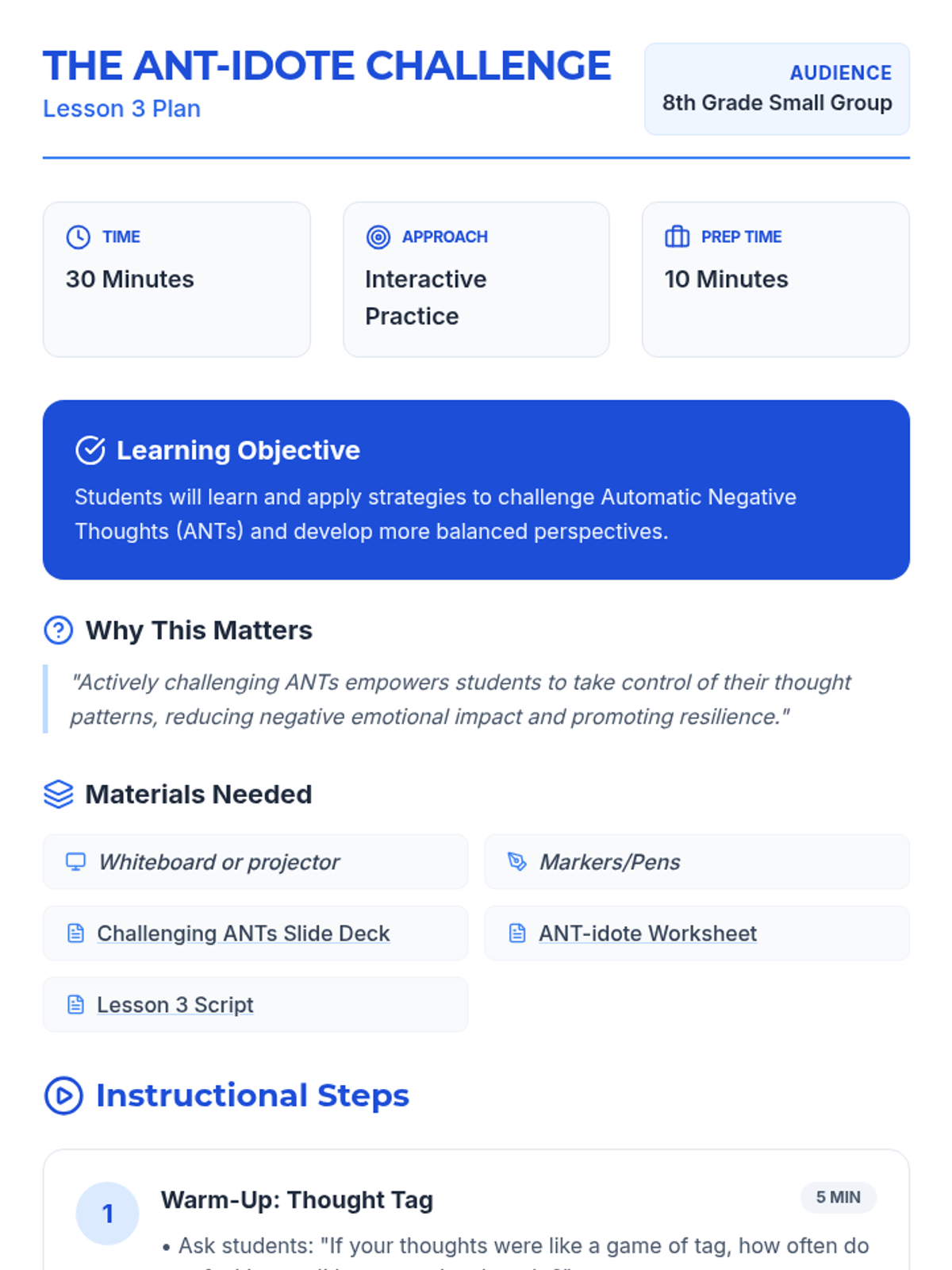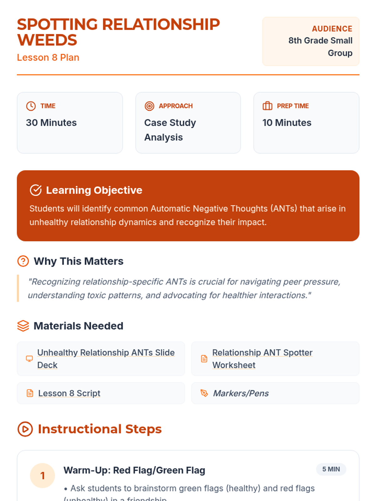 A comprehensive 12-lesson curriculum for 8th-grade small groups designed to build emotional resilience and healthy relationship skills. Students learn to identify and challenge automatic negative thoughts (ANTs), set healthy boundaries, use positive affirmations, and communicate assertively.