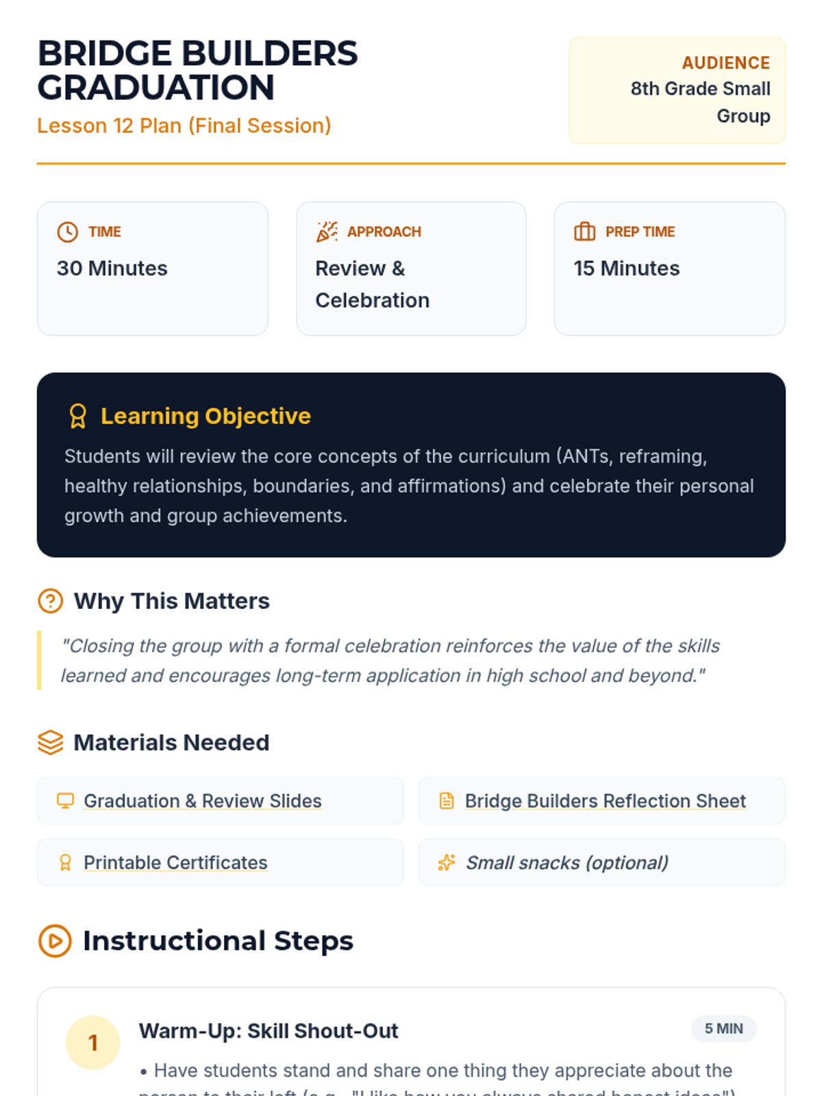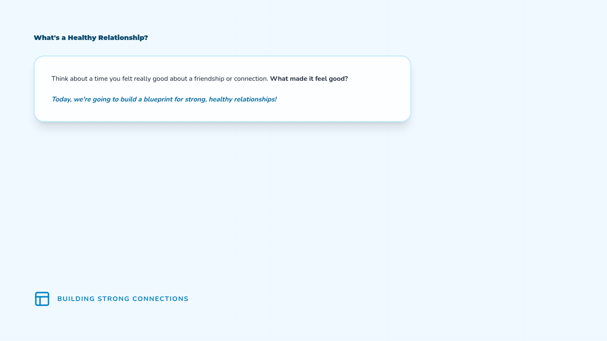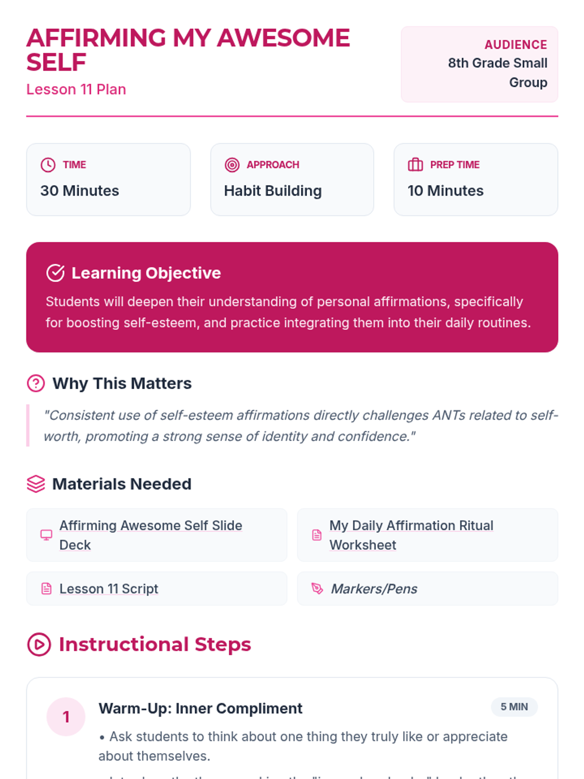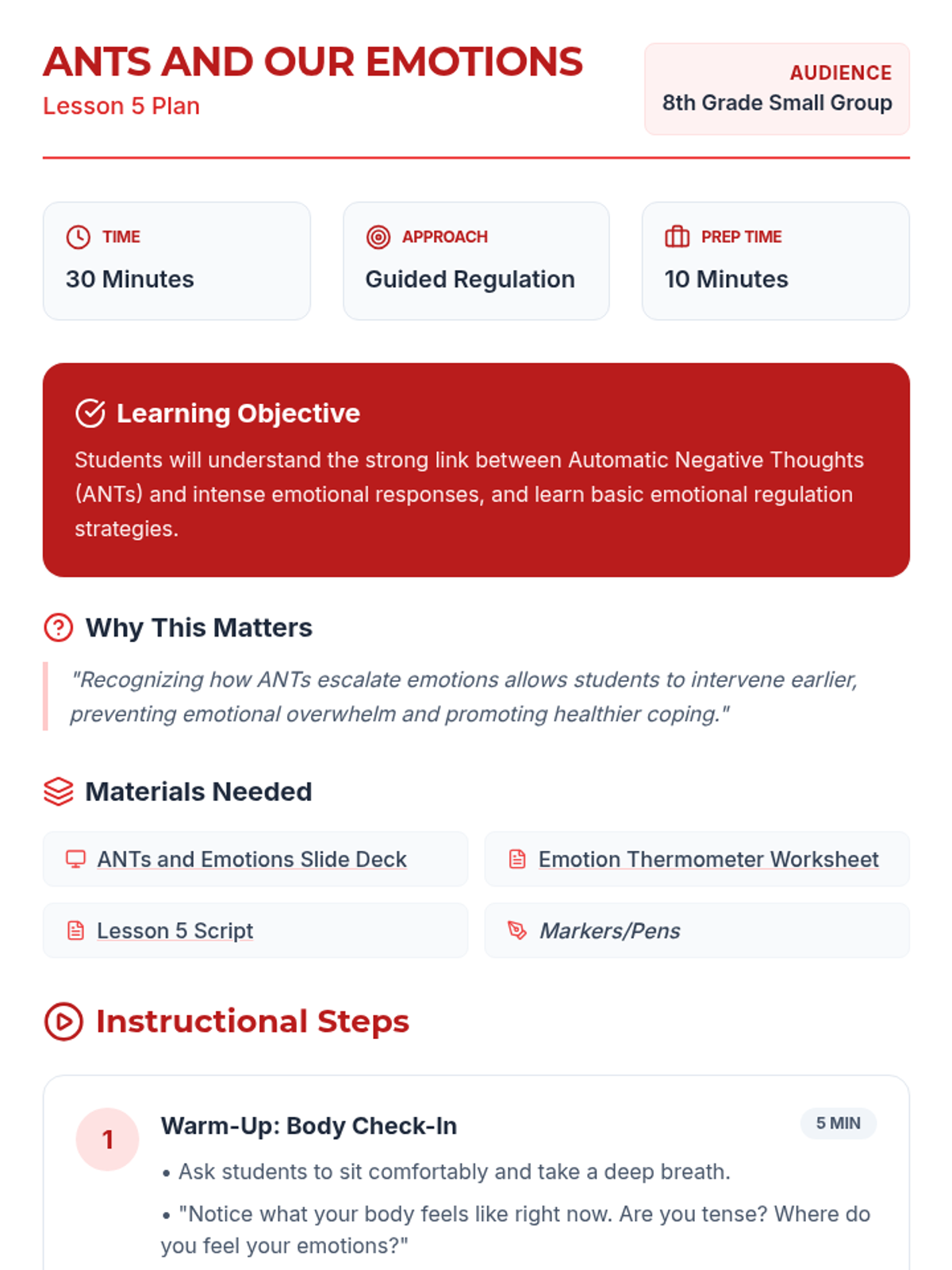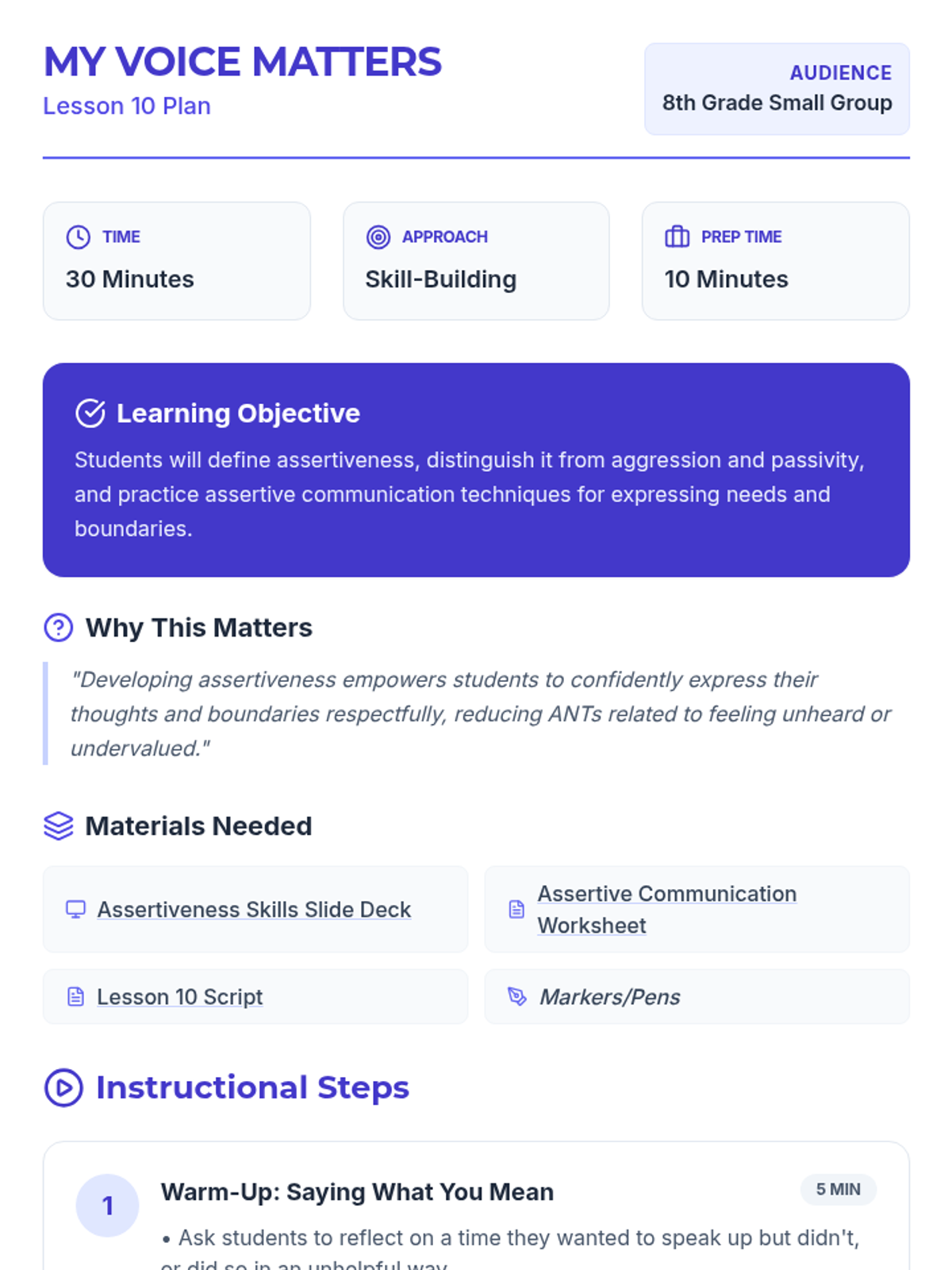 A comprehensive 12-lesson curriculum for 8th-grade small groups designed to build emotional resilience and healthy relationship skills. Students learn to identify and challenge automatic negative thoughts (ANTs), set healthy boundaries, use positive affirmations, and communicate assertively.
