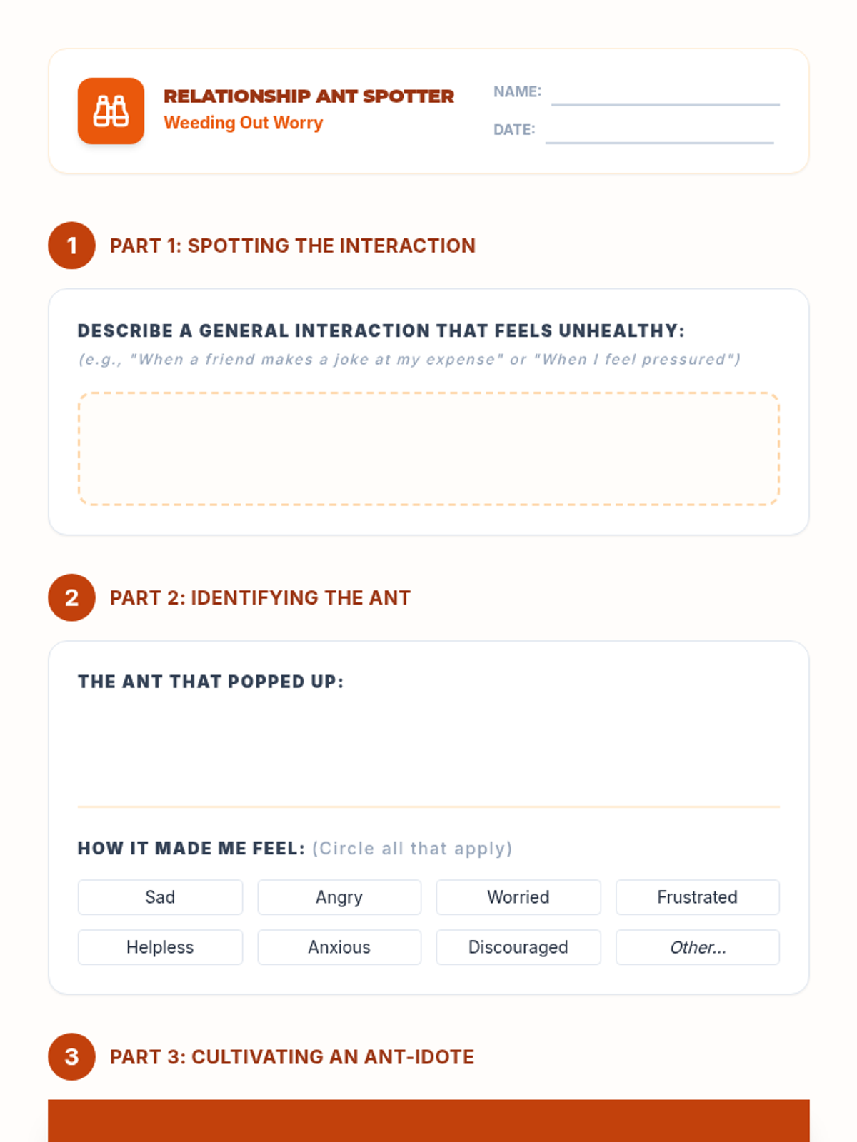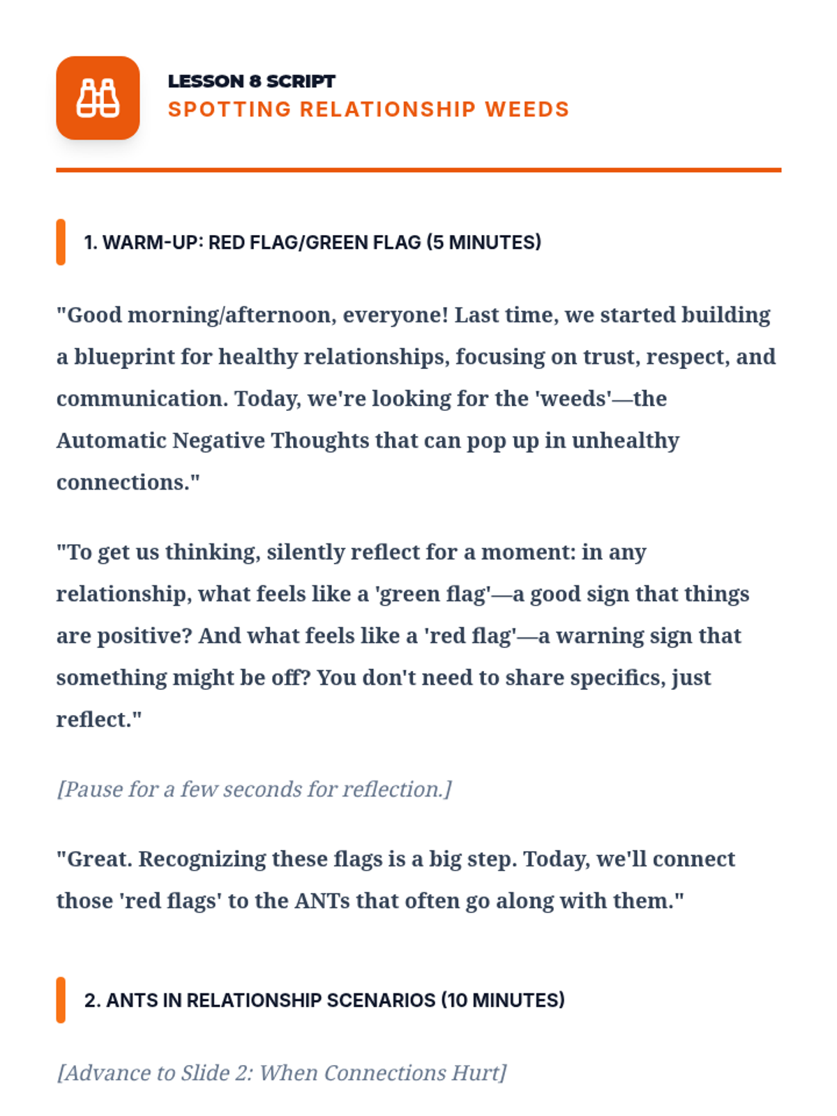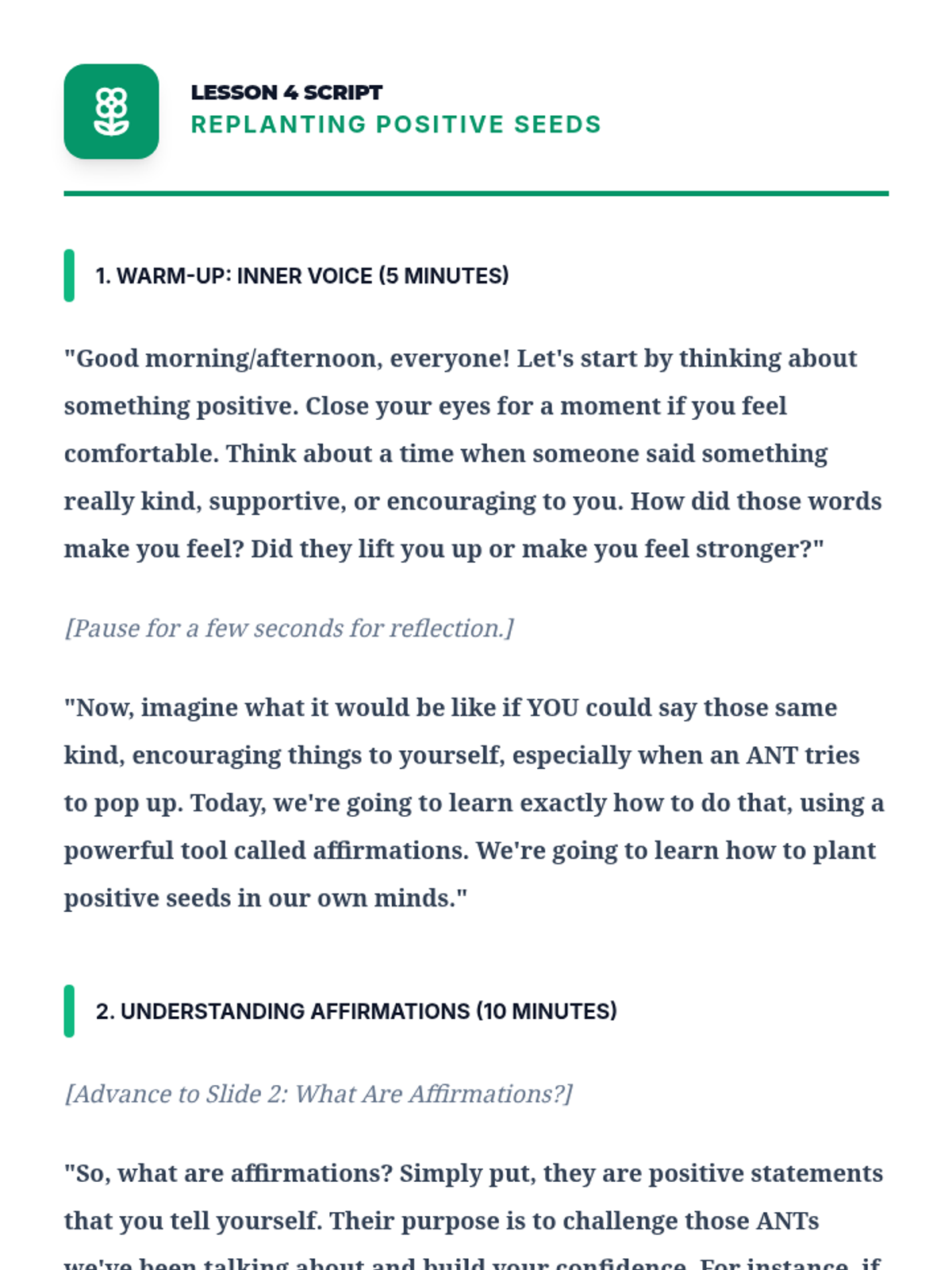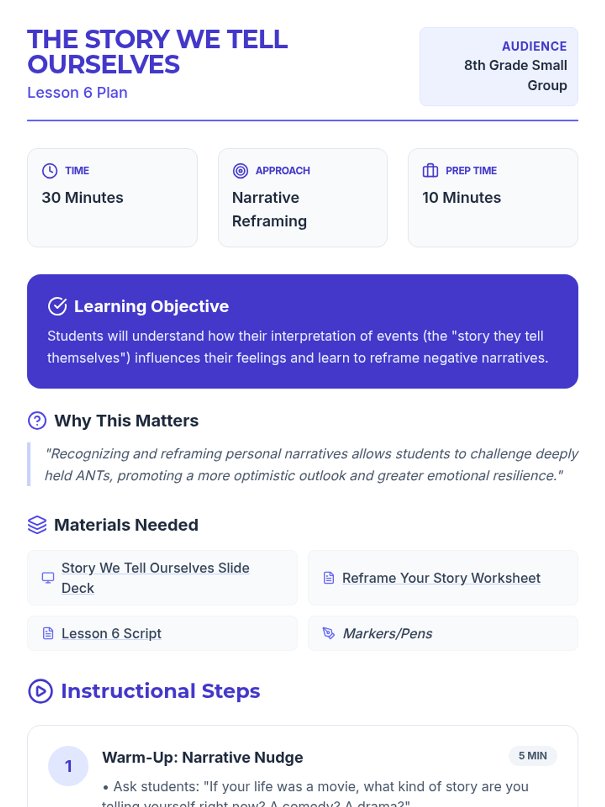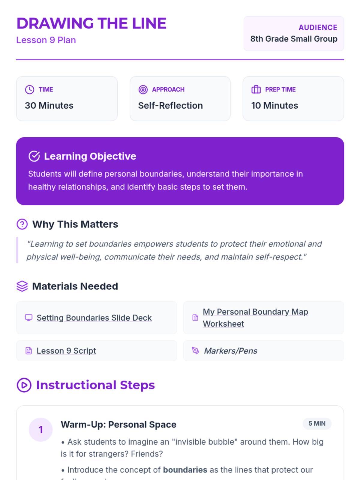 A comprehensive 12-lesson curriculum for 8th-grade small groups designed to build emotional resilience and healthy relationship skills. Students learn to identify and challenge automatic negative thoughts (ANTs), set healthy boundaries, use positive affirmations, and communicate assertively.
