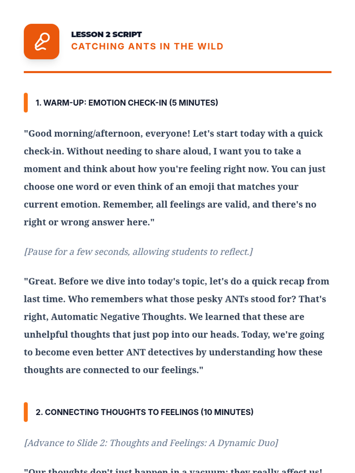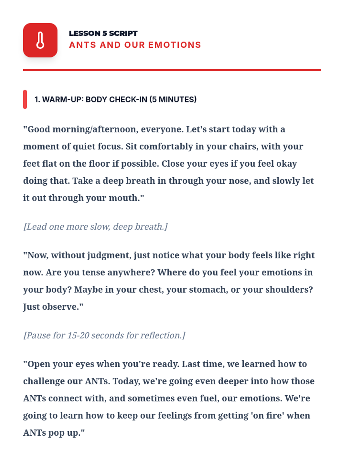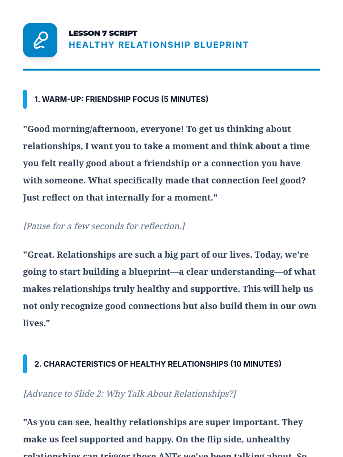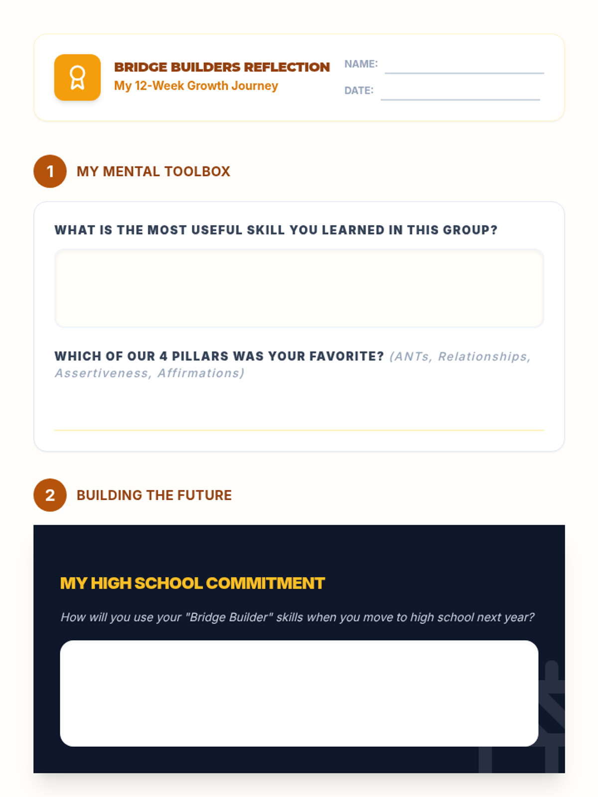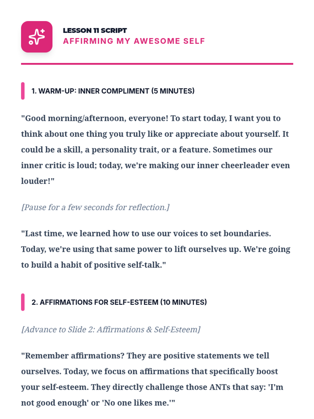A comprehensive 12-lesson curriculum for 8th-grade small groups designed to build emotional resilience and healthy relationship skills. Students learn to identify and challenge automatic negative thoughts (ANTs), set healthy boundaries, use positive affirmations, and communicate assertively.