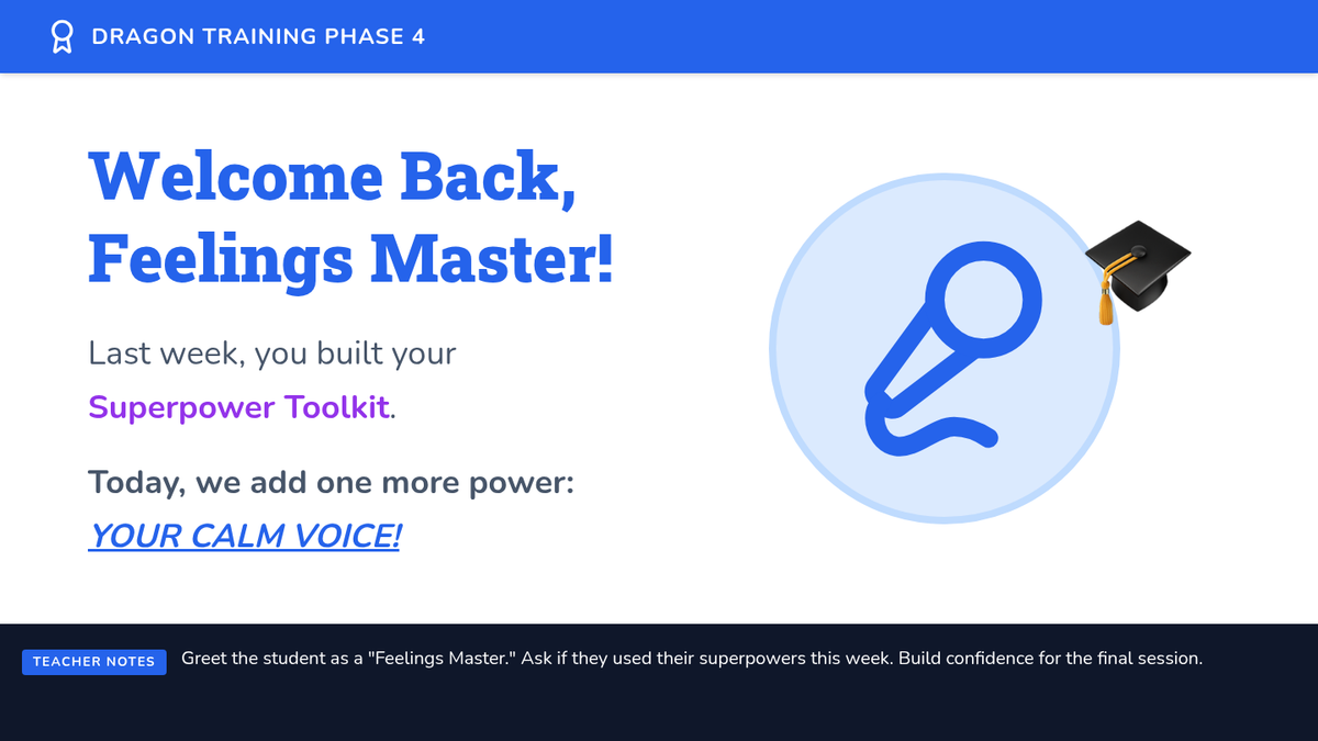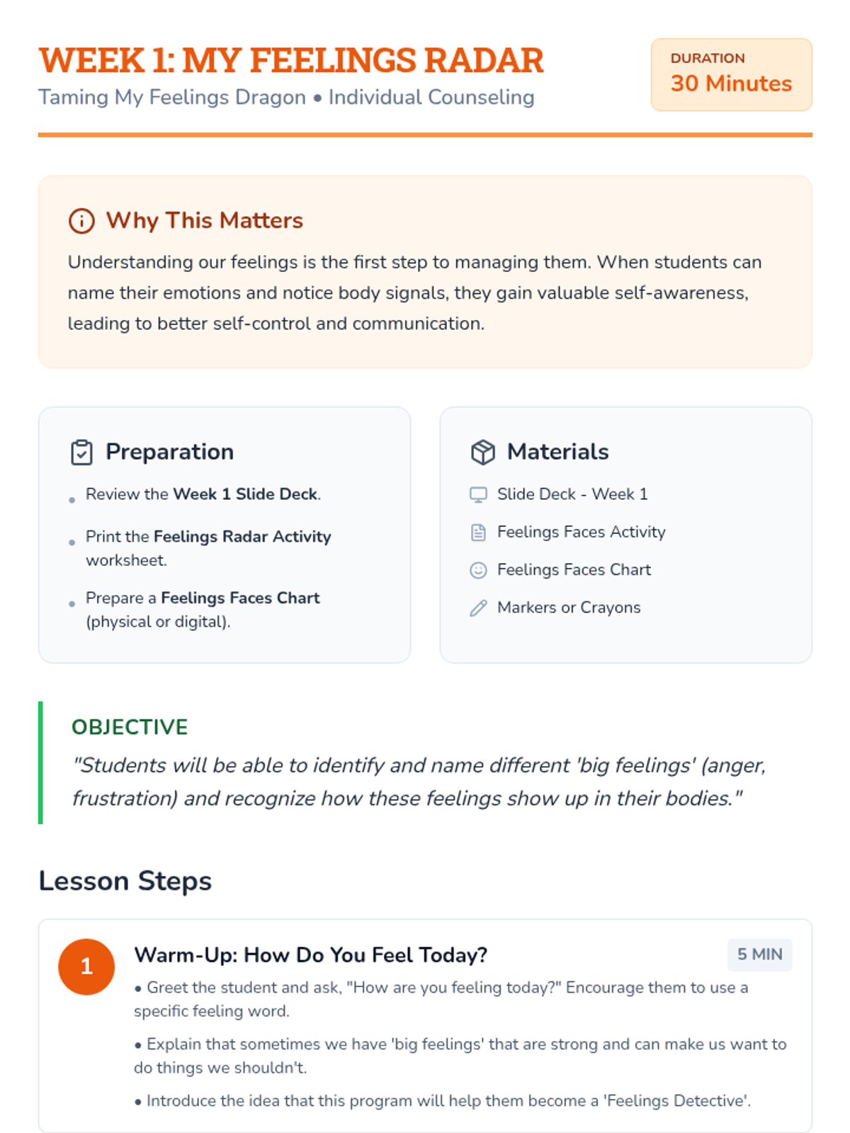 A 4-week individual counseling intervention for early elementary students (specifically 1st grade) to develop emotional self-awareness, self-control, and positive communication skills using a 'Feelings Dragon' metaphor.