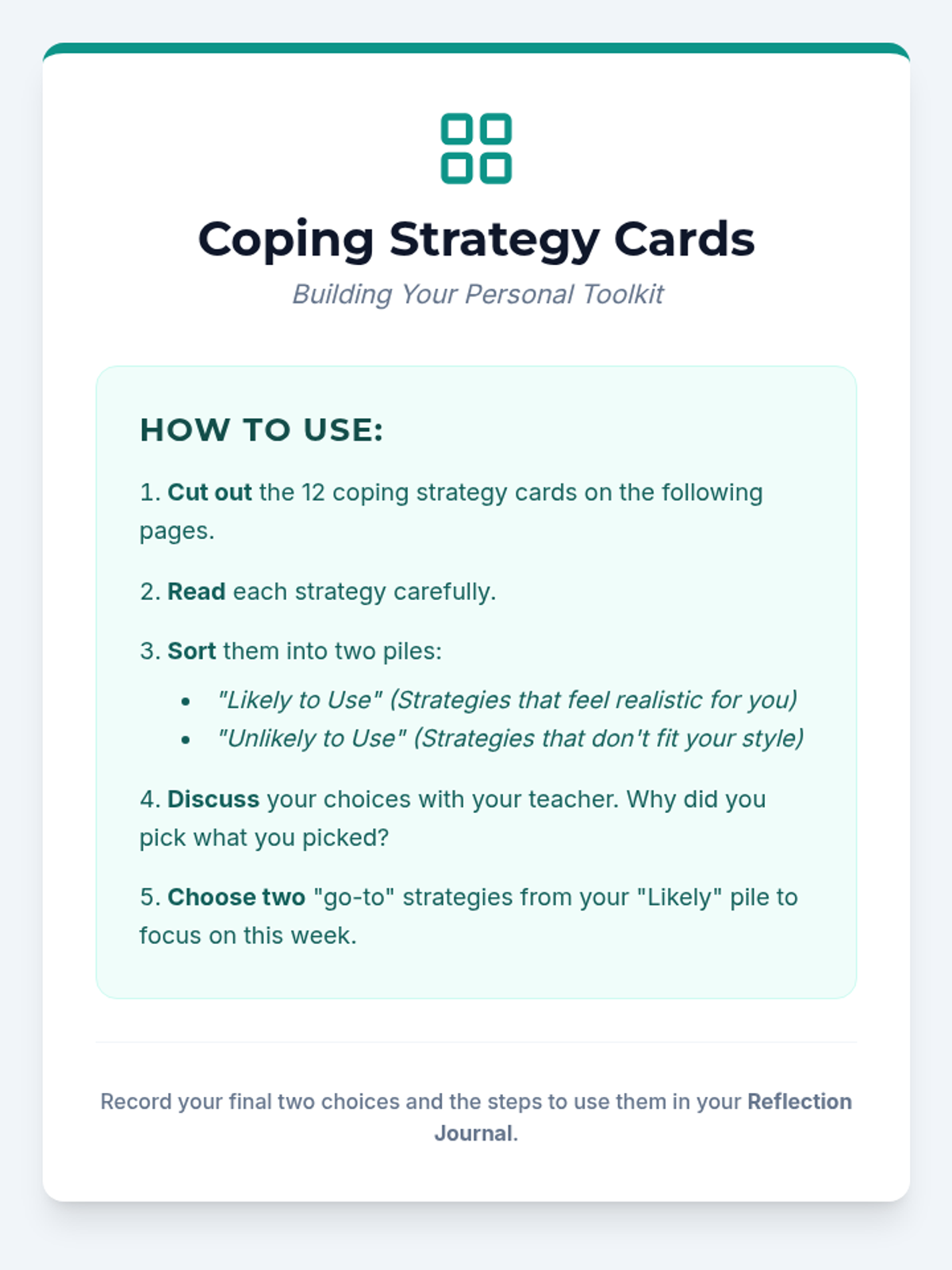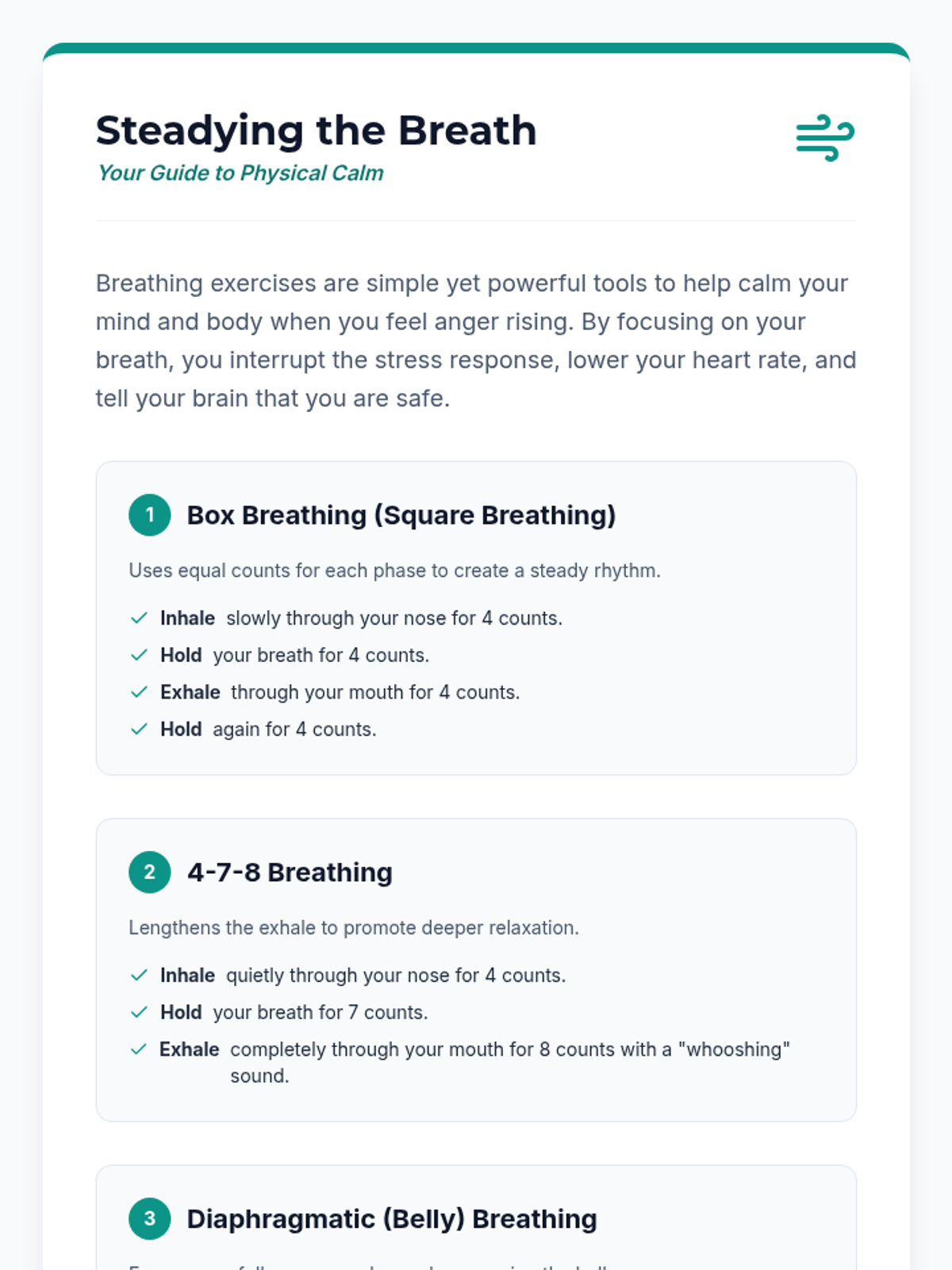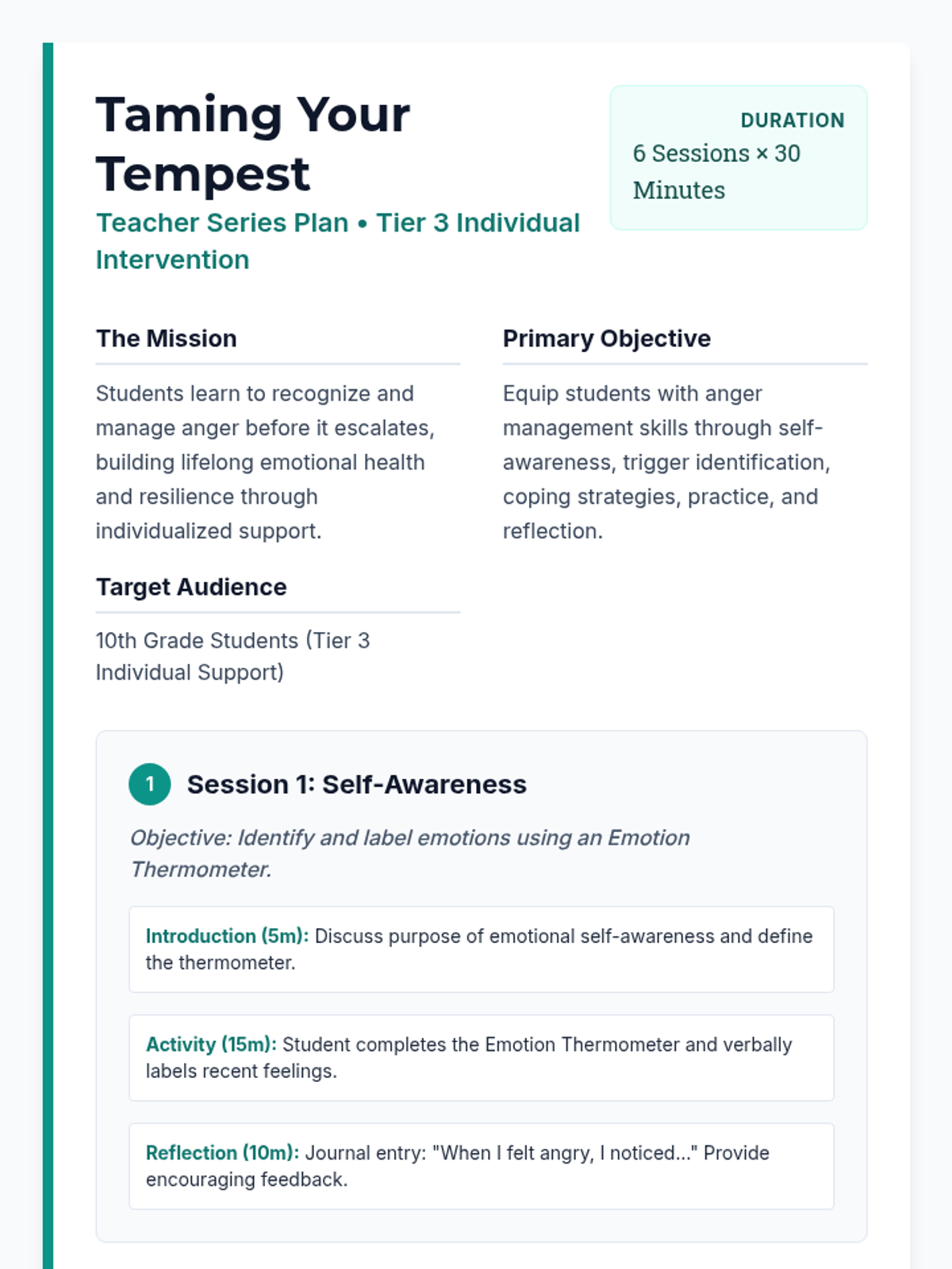 A 6-session, Tier 3 individual intervention program teaching 10th graders anger management and emotional regulation skills through self-awareness, coping strategies, and reflection.