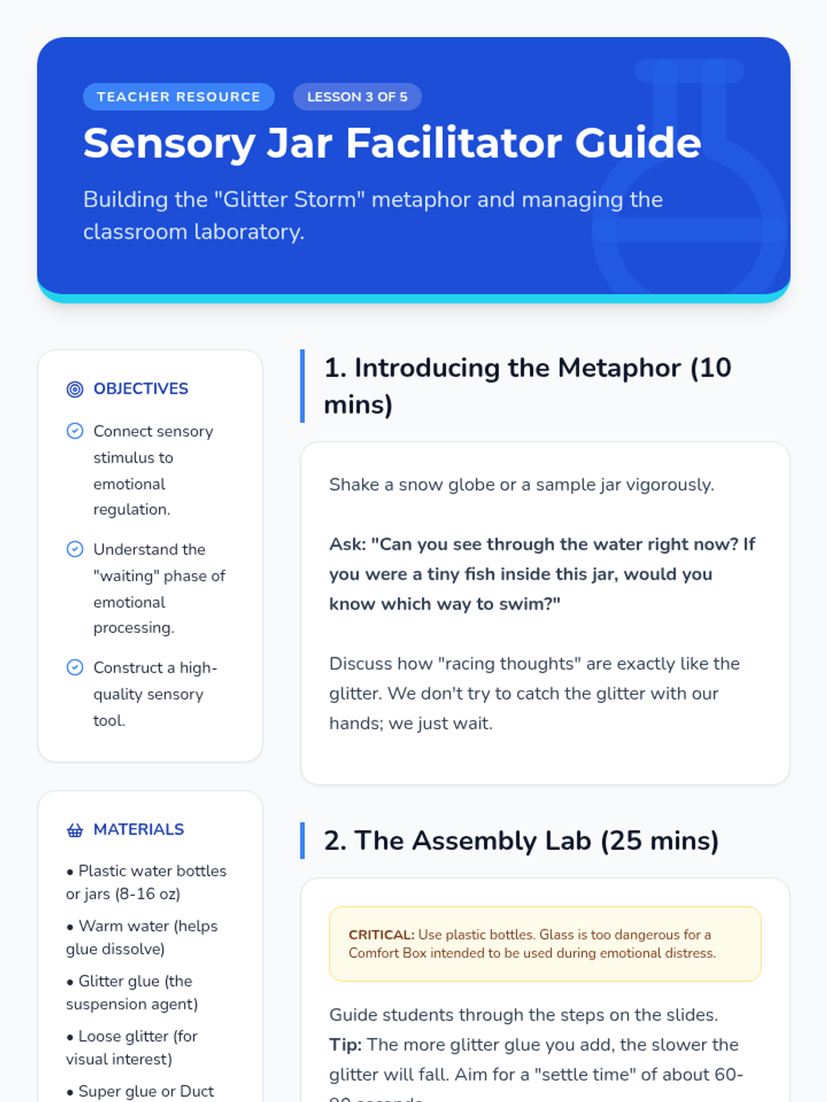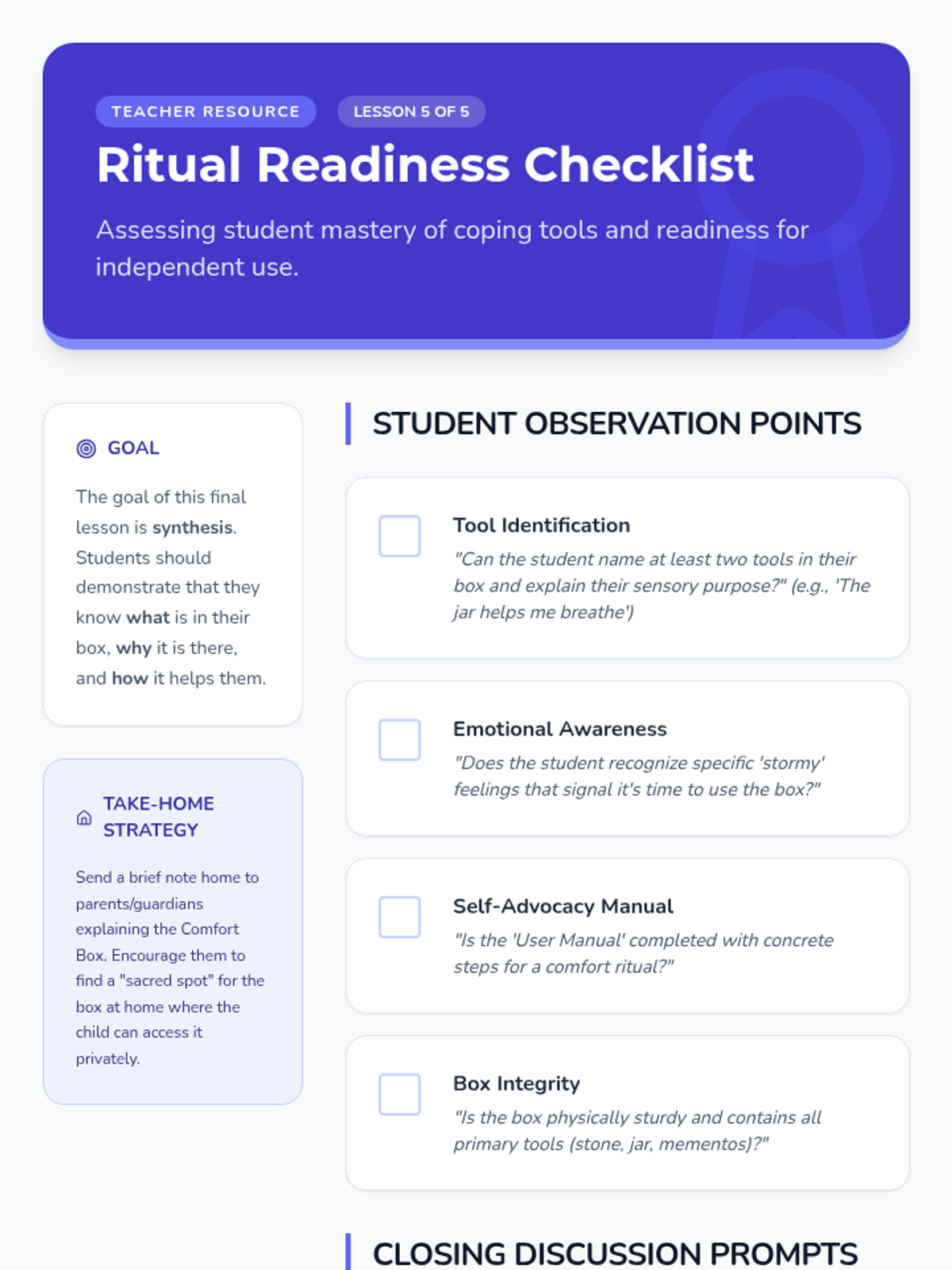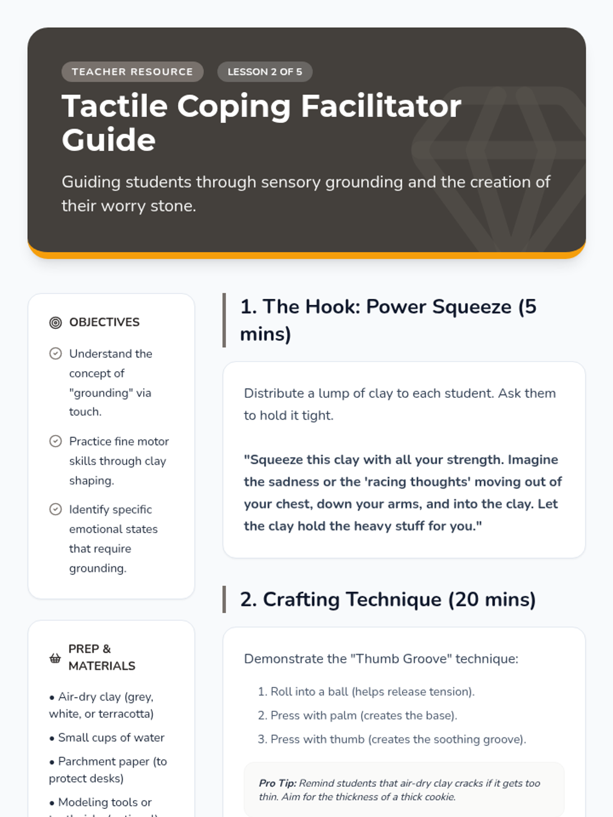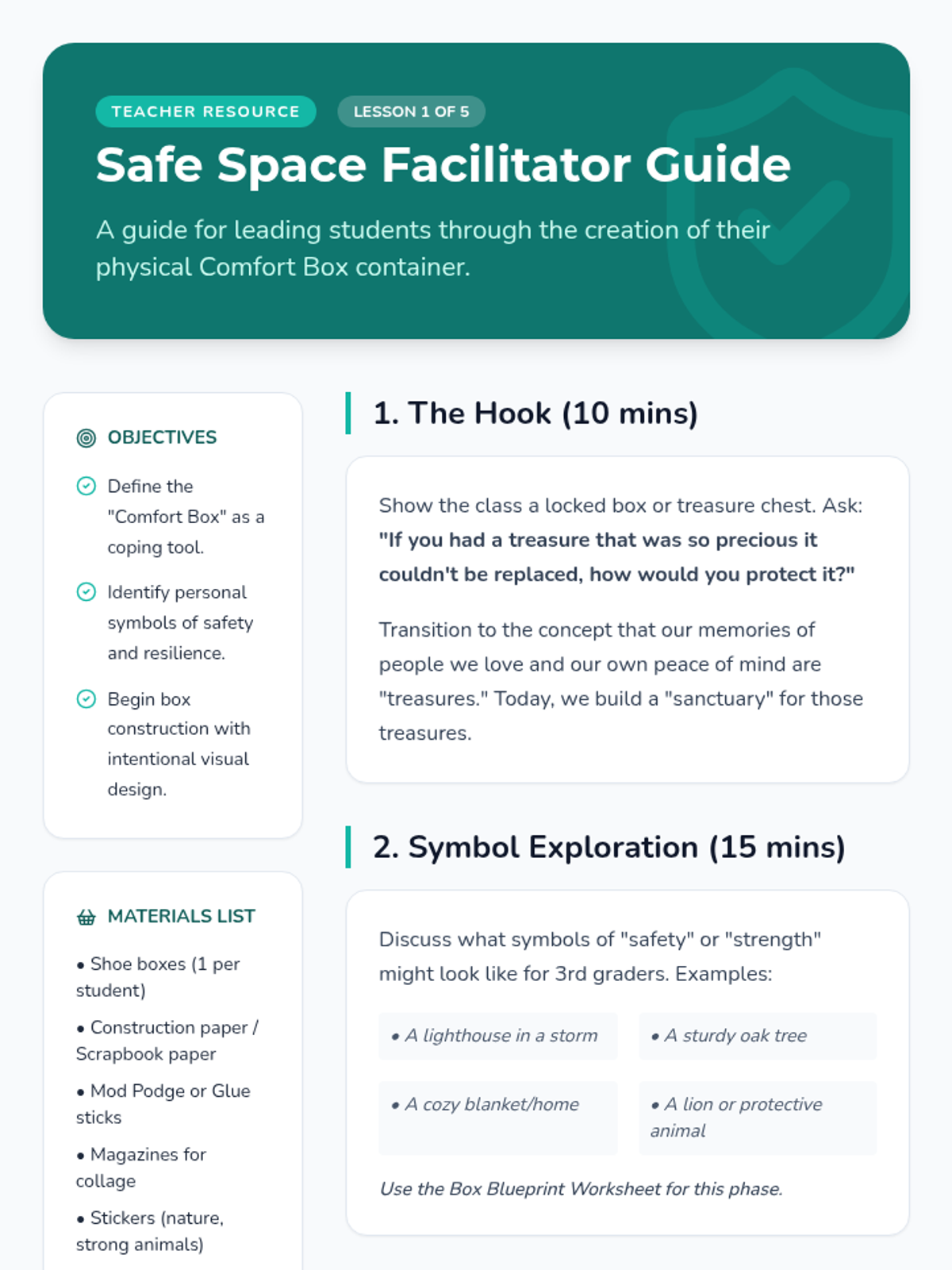 A hands-on counseling sequence for 3rd graders to process grief and loss by building a physical 'Comfort Box' filled with tactile coping tools. Students explore grounding techniques, sensory regulation, and the power of personal mementos.