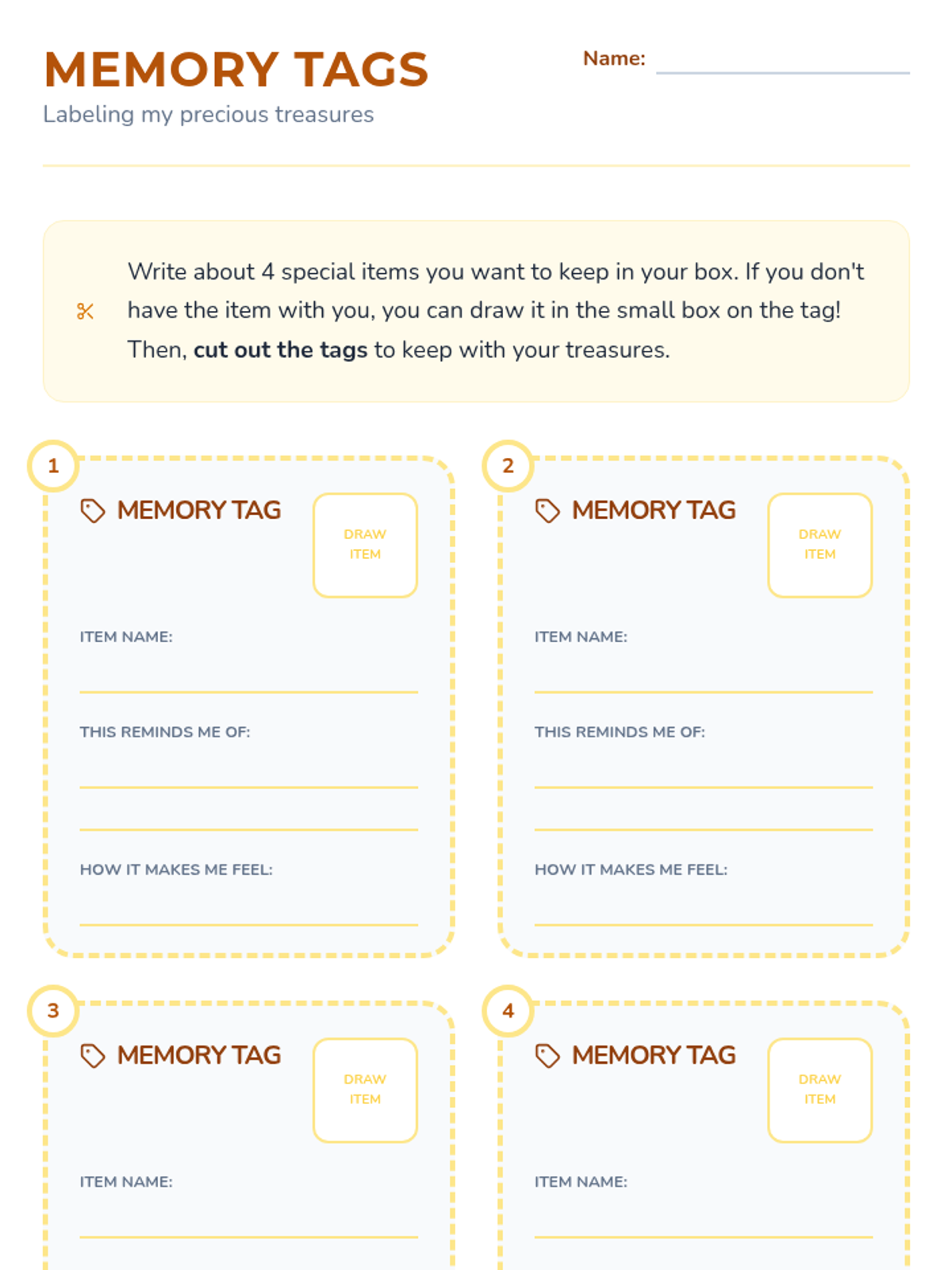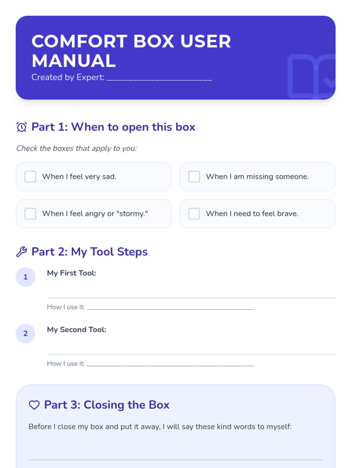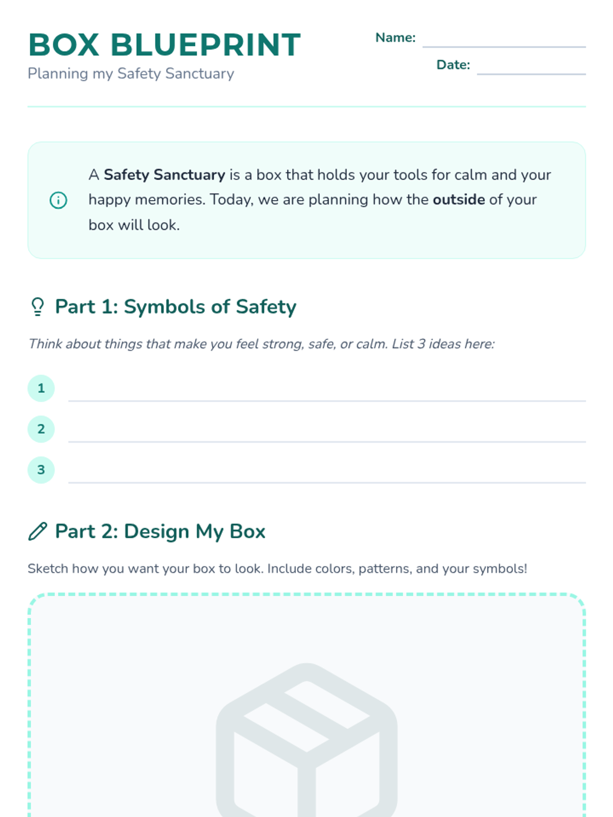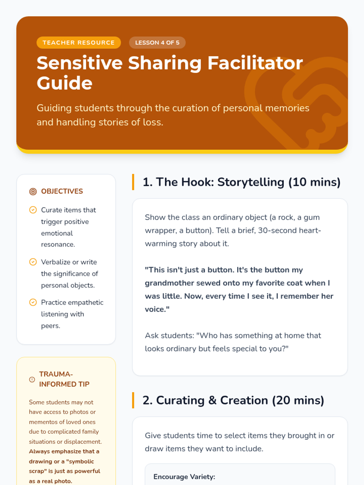 A hands-on counseling sequence for 3rd graders to process grief and loss by building a physical 'Comfort Box' filled with tactile coping tools. Students explore grounding techniques, sensory regulation, and the power of personal mementos.