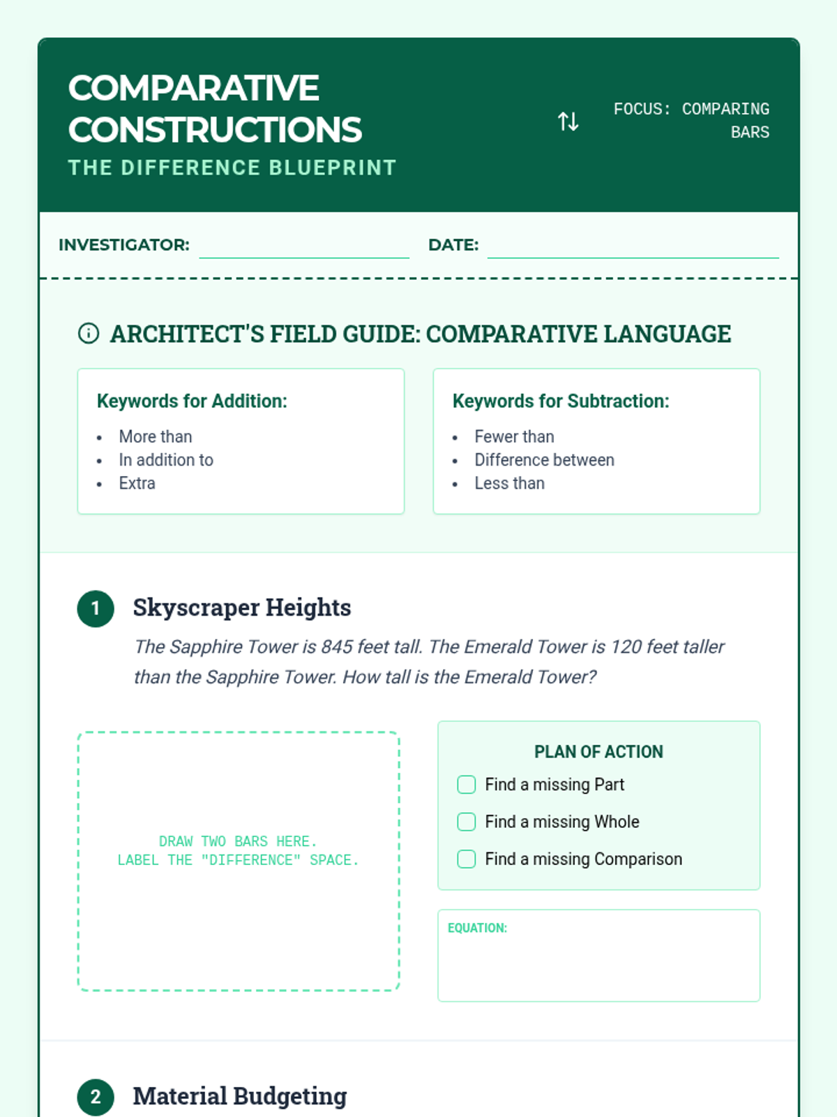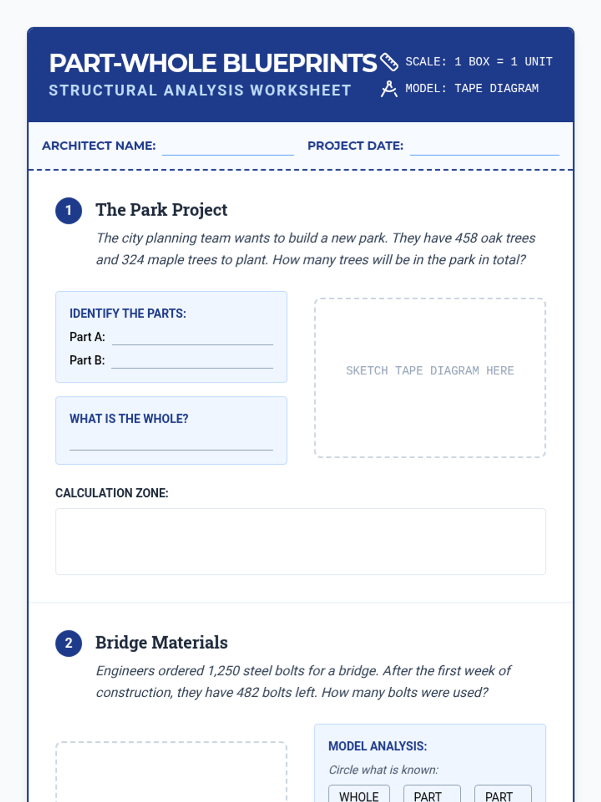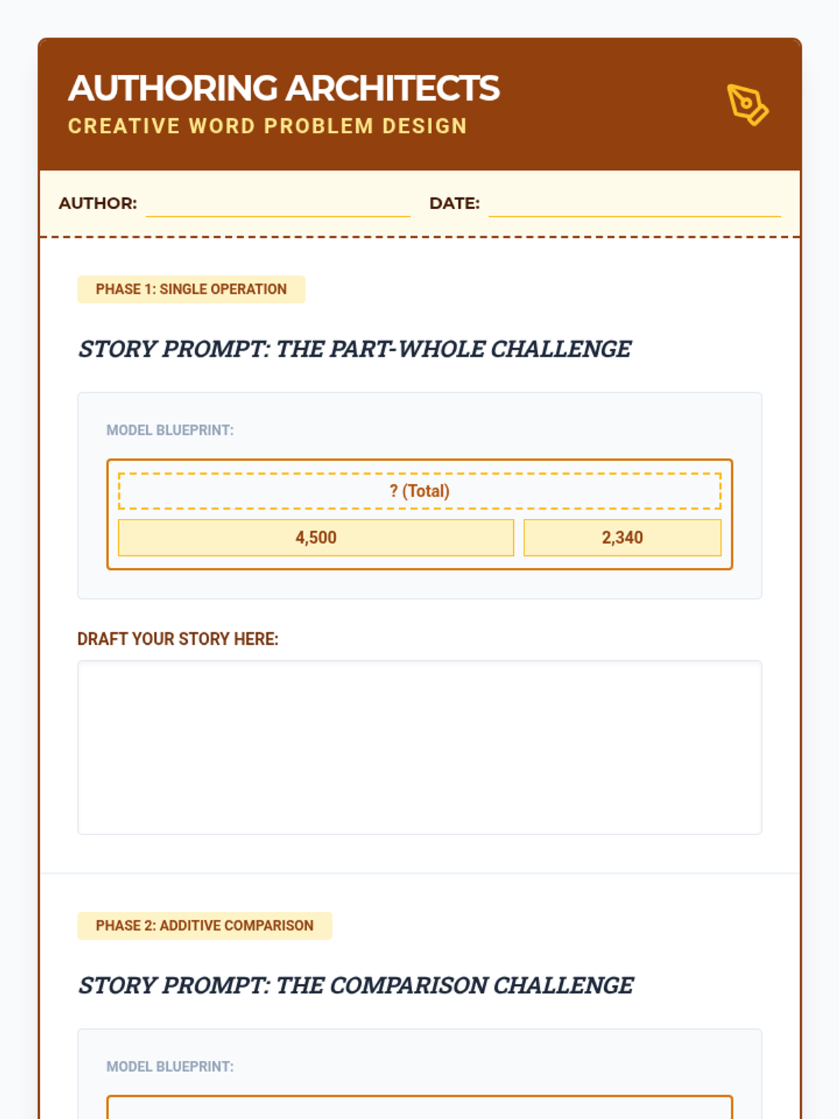 This sequence teaches 4th-grade students to use tape diagrams (bar models) as a visual tool for solving complex addition and subtraction word problems. Students progress from simple part-whole models to multi-step additive comparison and inventory-style problems, concluding with a creative writing project.