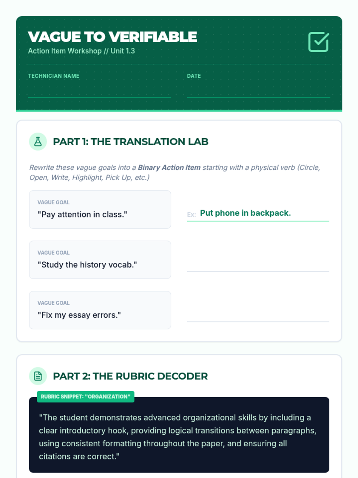 A sequence designed to support students with working memory challenges by teaching systematic task decomposition. Students move from identifying cognitive overwhelm to creating personalized workflow systems for complex assignments.