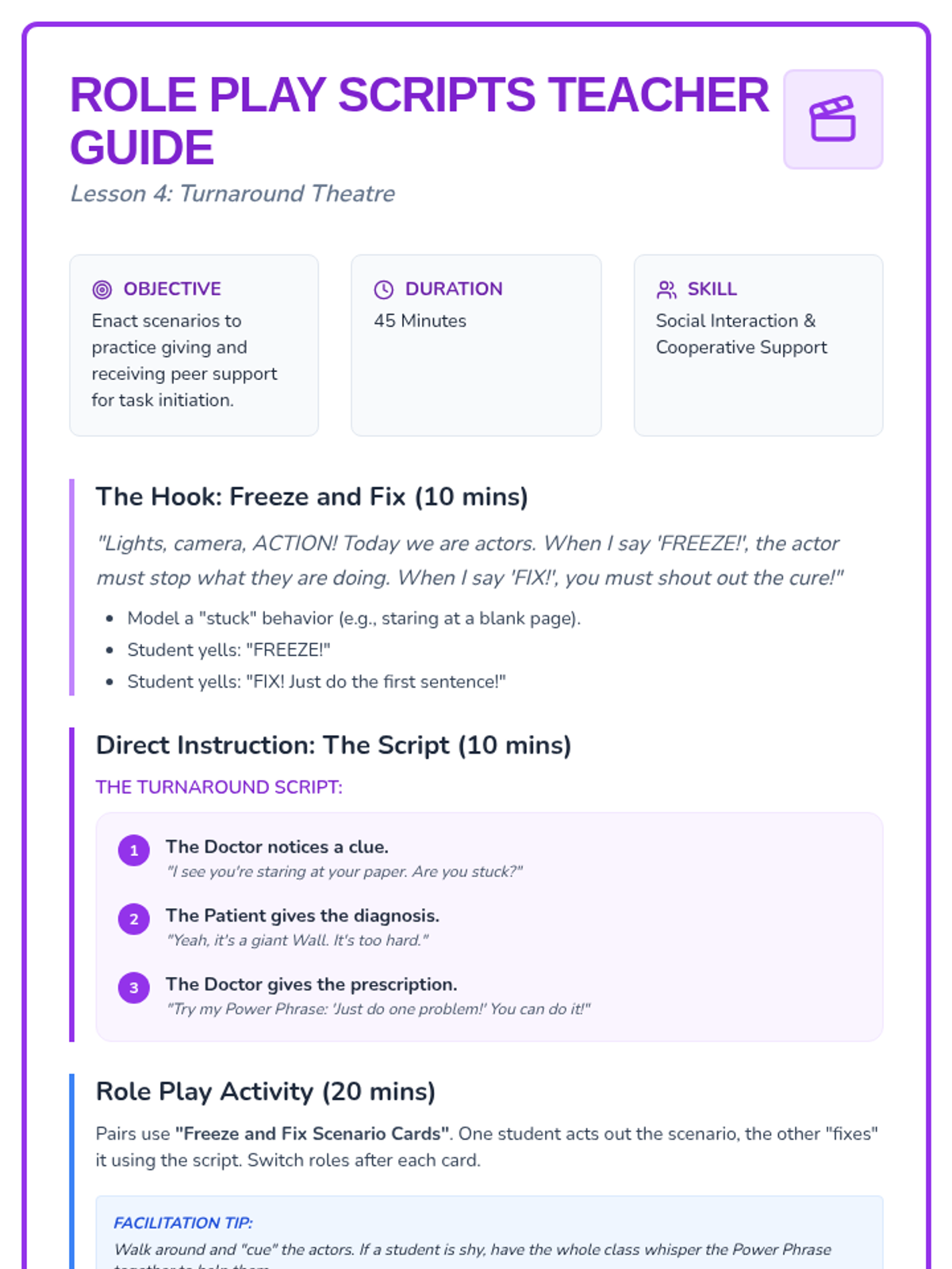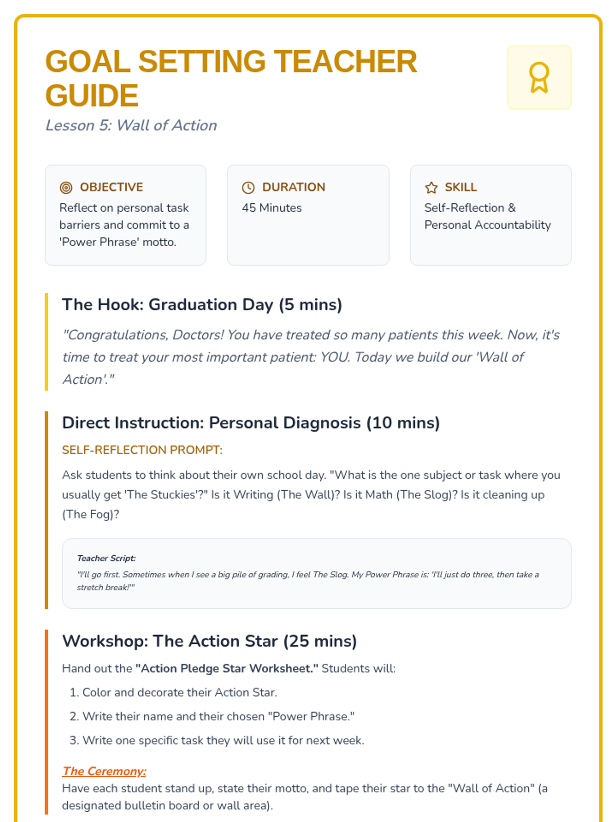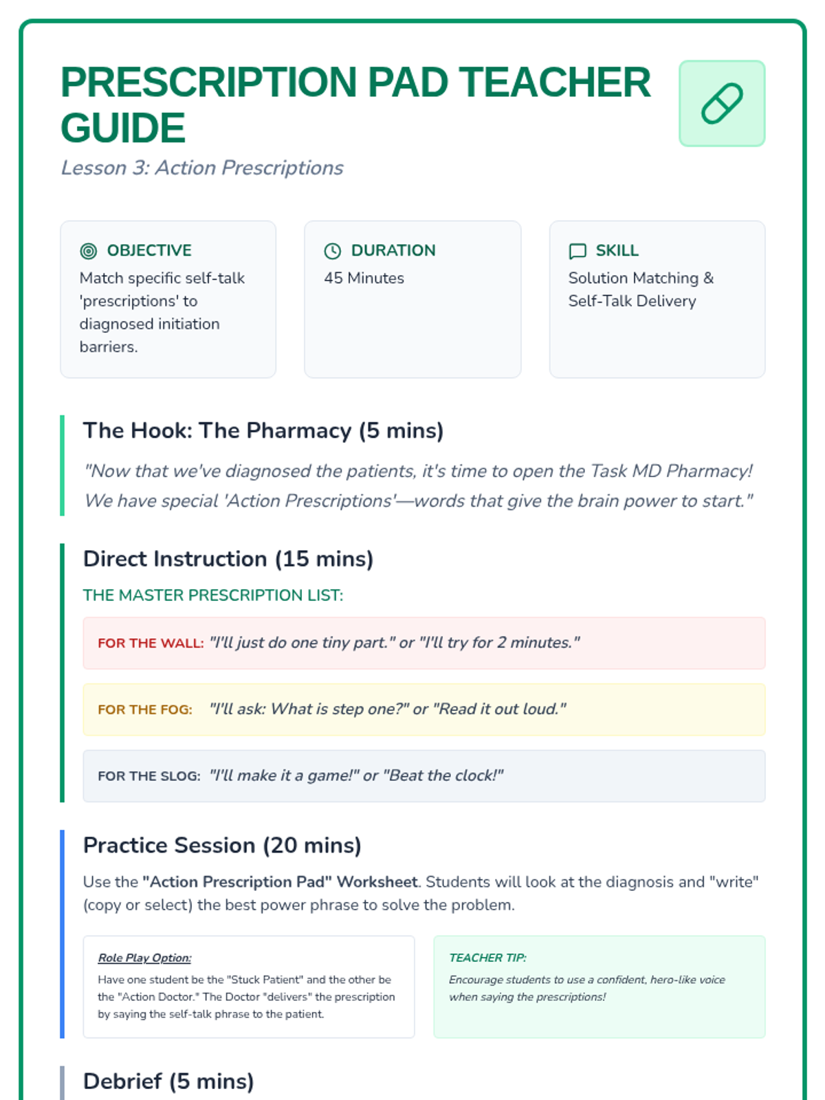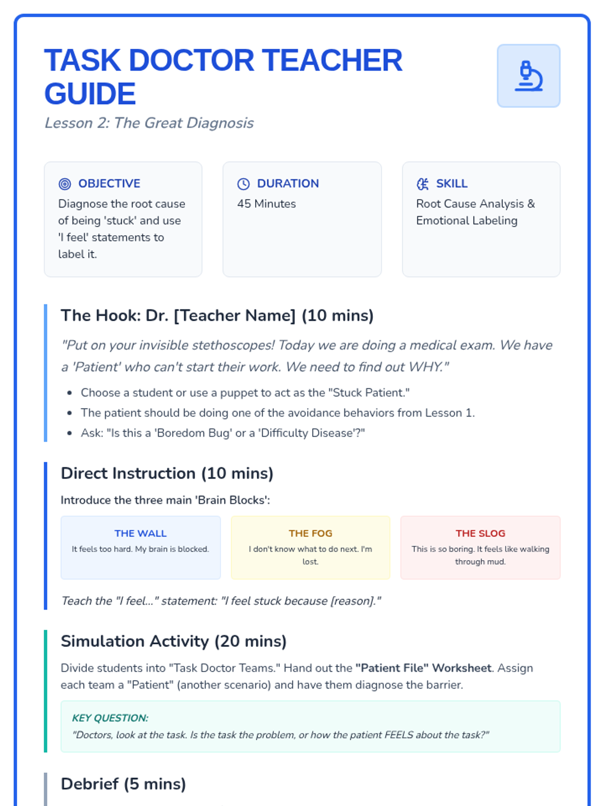 A sequence focused on helping students overcome emotional barriers to task initiation using a 'Task Doctor' theme. Students learn to identify avoidance behaviors, diagnose the root cause of being 'stuck', and prescribe effective self-talk solutions through role-play and reflection.