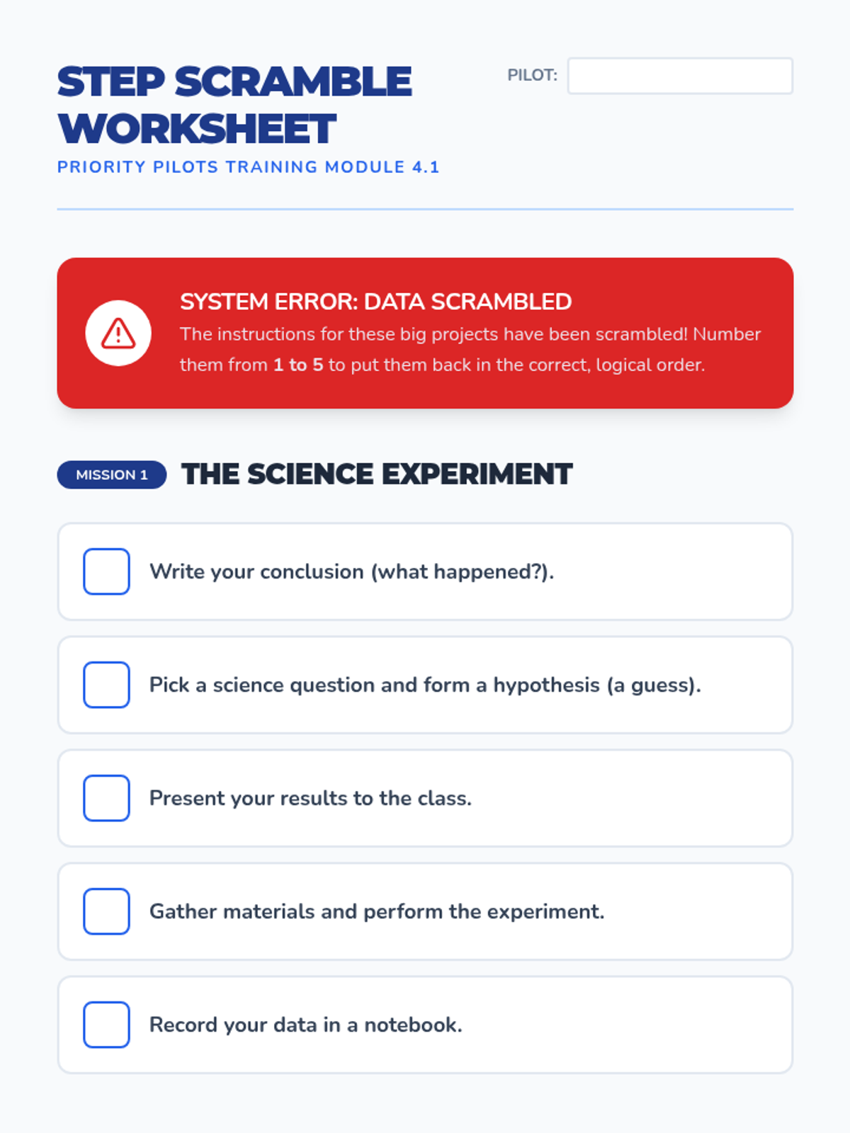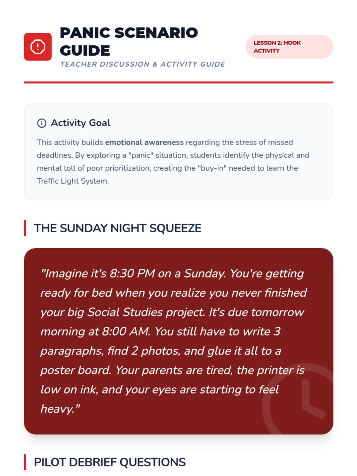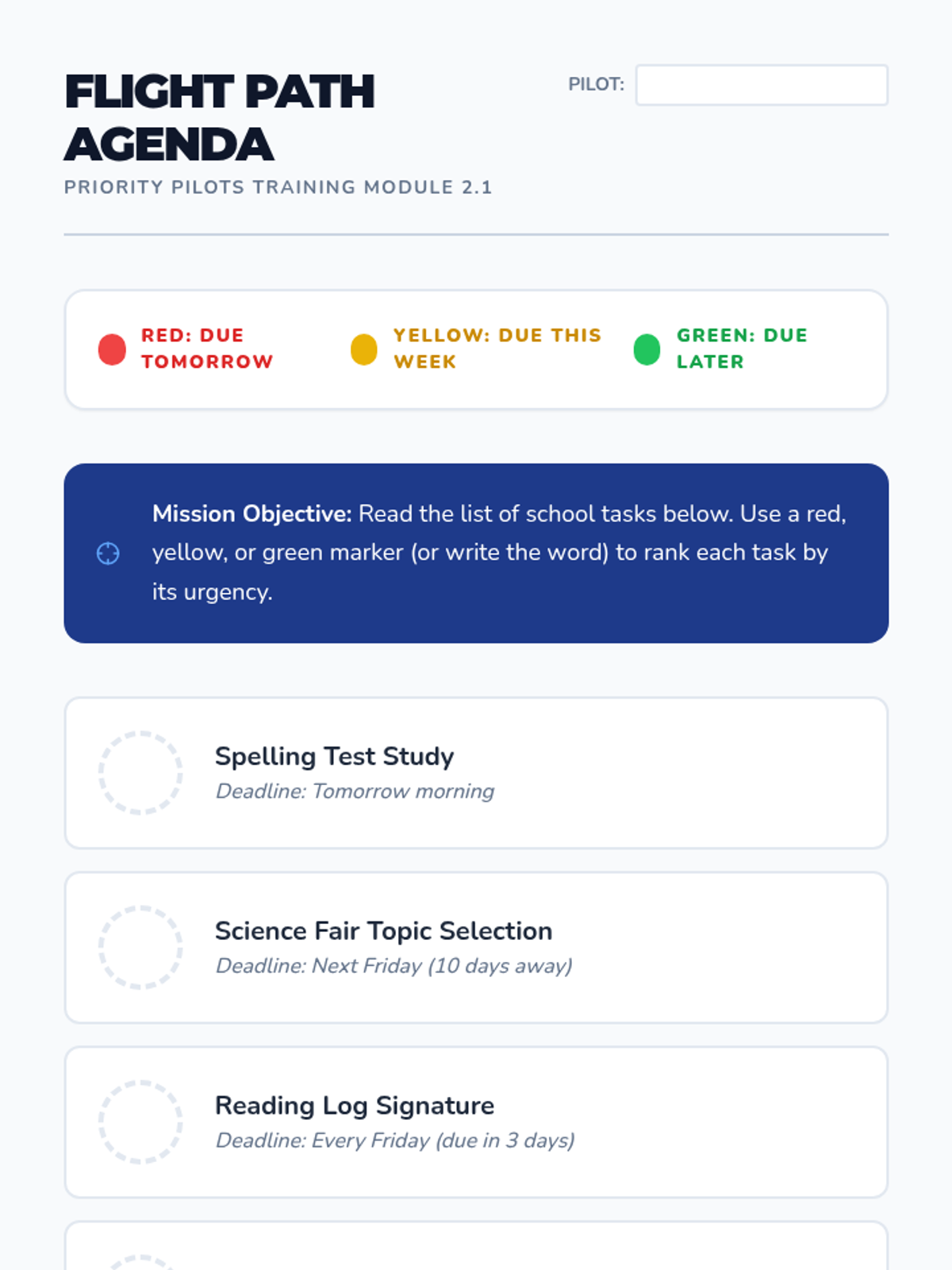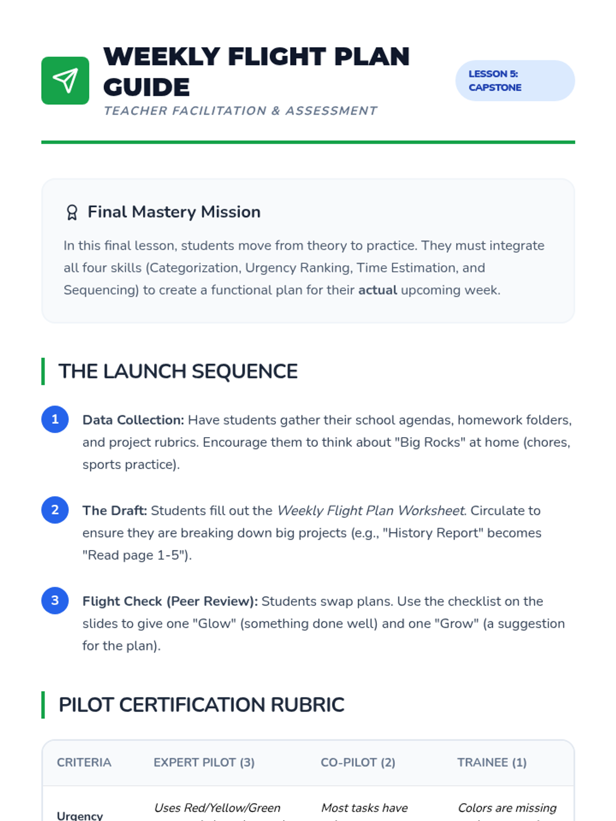This sequence teaches 5th-grade students essential executive functioning skills for task prioritization. Students learn to distinguish between obligations and leisure, use a traffic light system for urgency, estimate time and effort, sequence multi-step projects, and create their own weekly plans using an aviation-inspired theme.